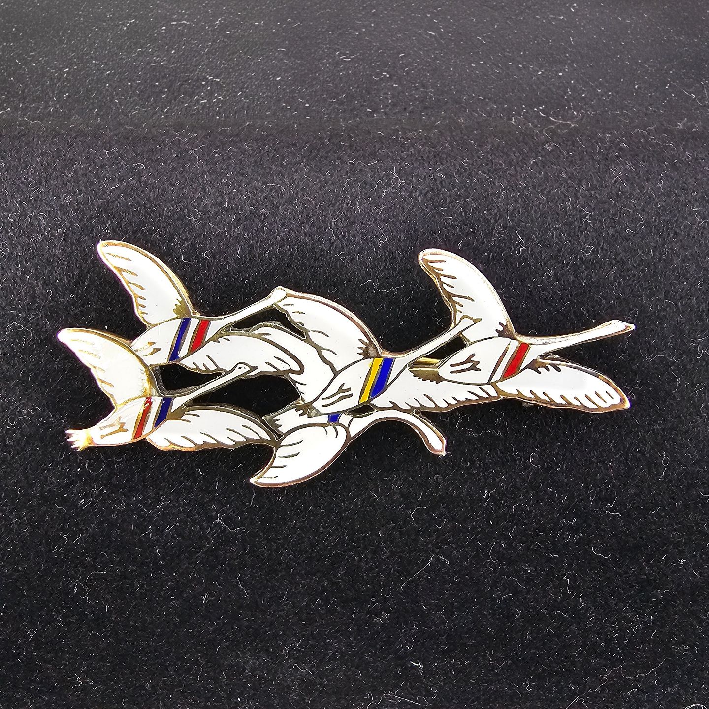 Broche i sterling sølv og emalje med motiv af fem svaner dekoreret med farver for de fem nordiske landeInklusiv original kasse, sjældent