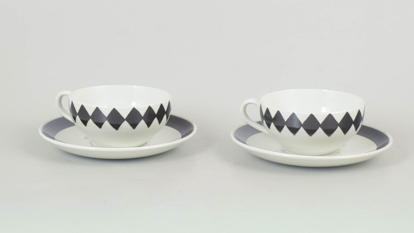 Sæt bestående af to tekopper med tilhørende underkopper i porcelæn med karakteristisk sort rudemønster, udført i et enkelt og funktionelt formsprog fra perioden.