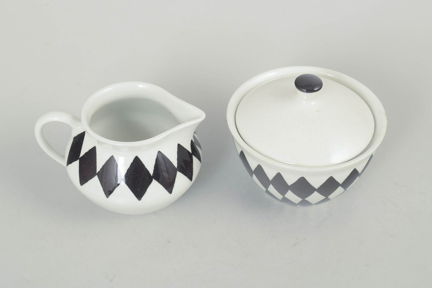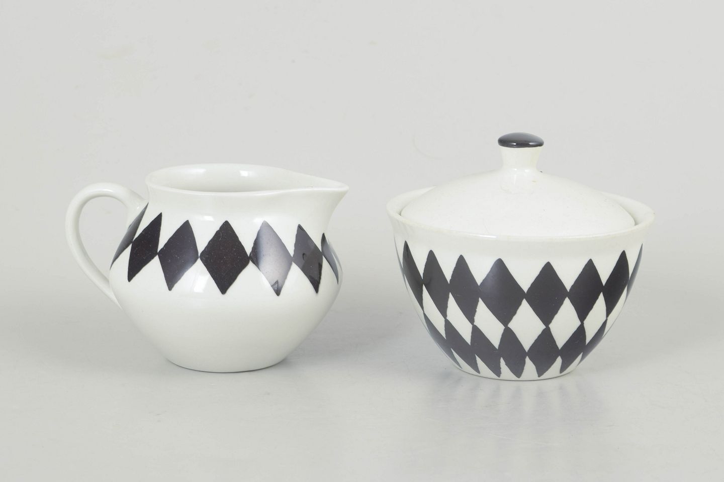 Karin Björquist for Gustavsberg, creamer set “Svart Ruter”.Set consisting of lidded sugar bowl and creamer in porcelain with a distinctive black diamond pattern, designed in a simple and functional style typical of the period.