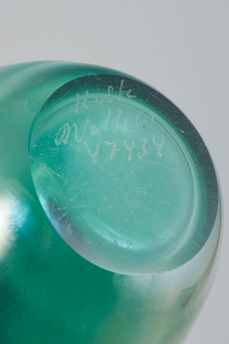 Bertil Vallien for Kosta Boda, par vaser.Elegante mundblæste glasvaser med organisk form og iriserende overflade i grønne og gyldne nuancer, der skifter i lyset.