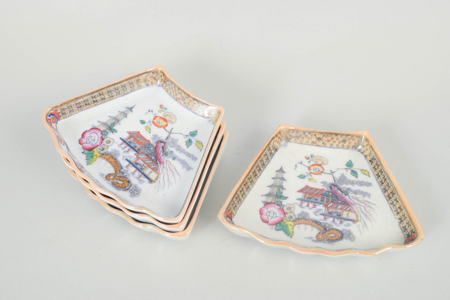 Rörstrand Japan, sæt af fire fade.Dekorative firkantede fade i fajance med polykrom dekoration i orientalistisk japansk stil med pagodemotiv, fugl og blomster. Model Japan, produceret i perioden 1866–1925 og dateret til 1880’erne.