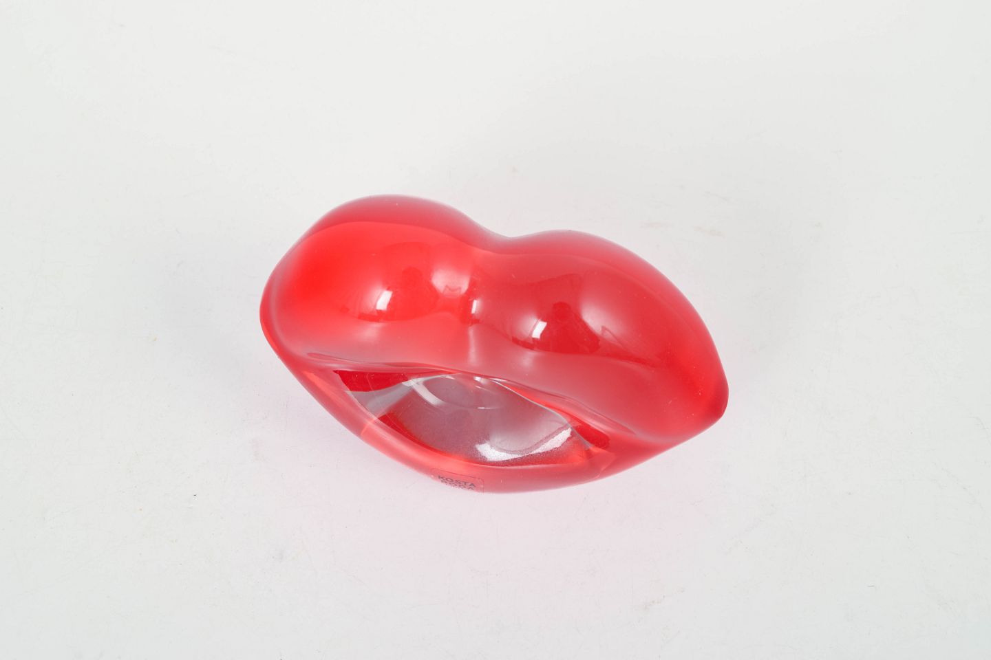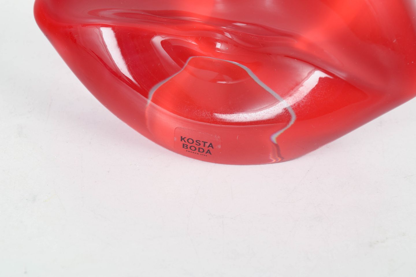 Åsa Jungnelius for Kosta Boda, glasskulptur.Skulpturel form som læber udført i massivt rødt glas med bløde organiske linjer og transparent effekt.