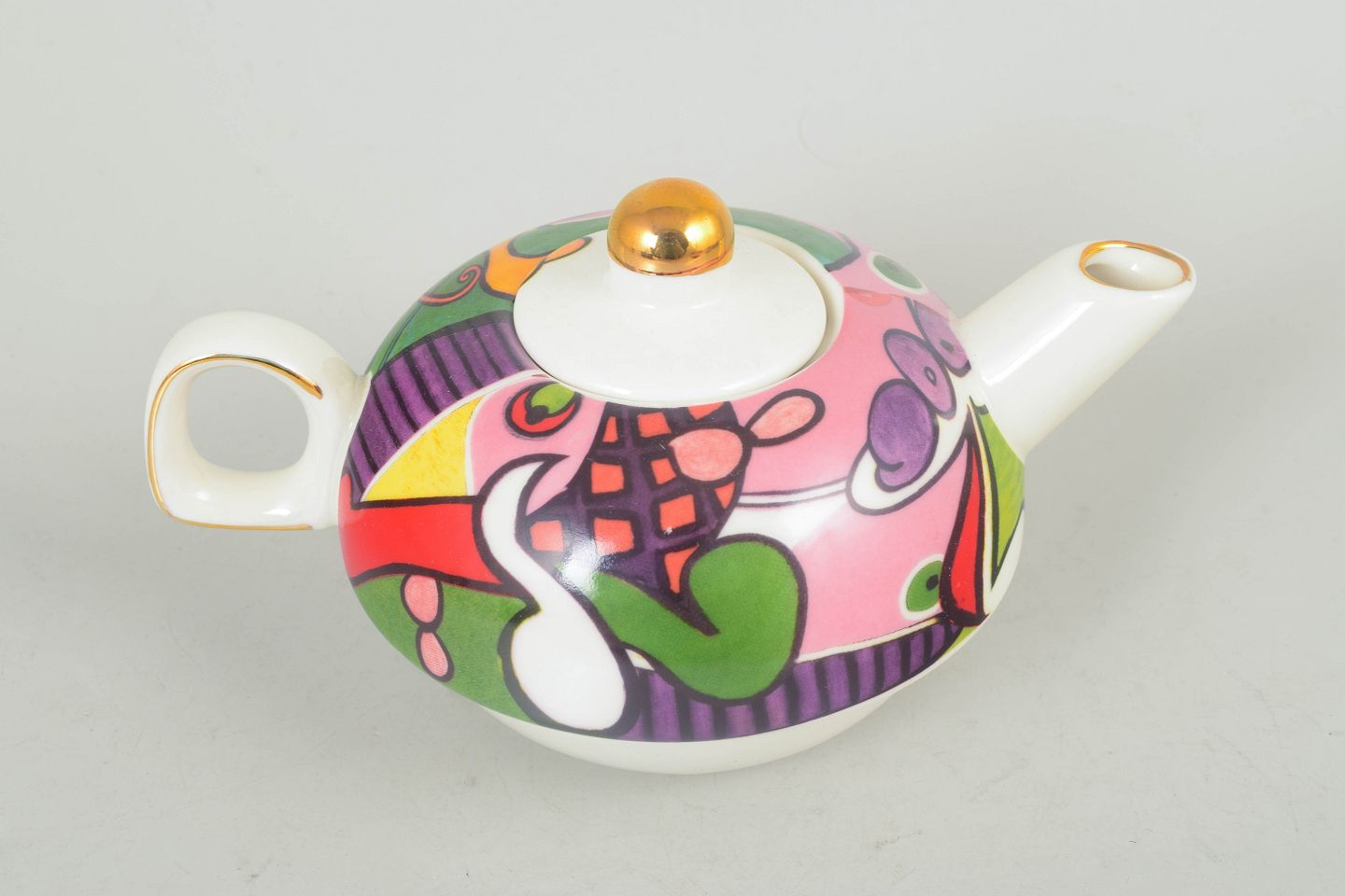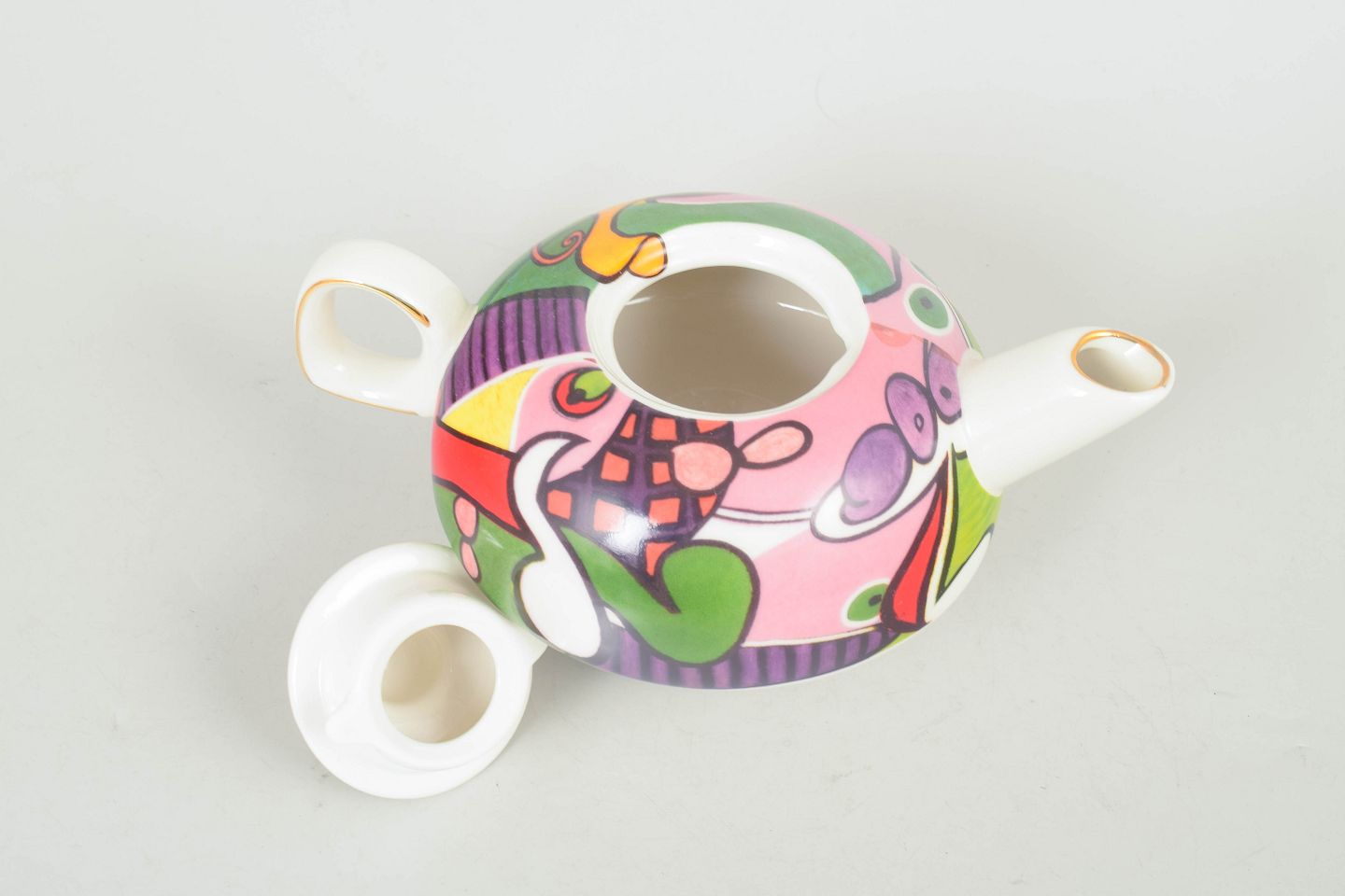 Picasso tekande.Tekande i porcelæn med låg, mærket Picasso. Rundet form med farverig dekor i stærke kontraster samt guldkant på knop og tud, typisk for sen 1900-tals produktion.