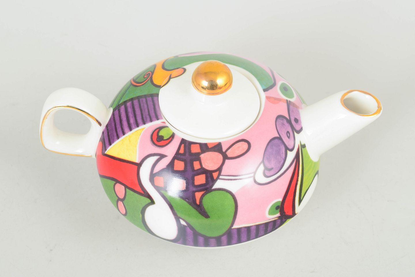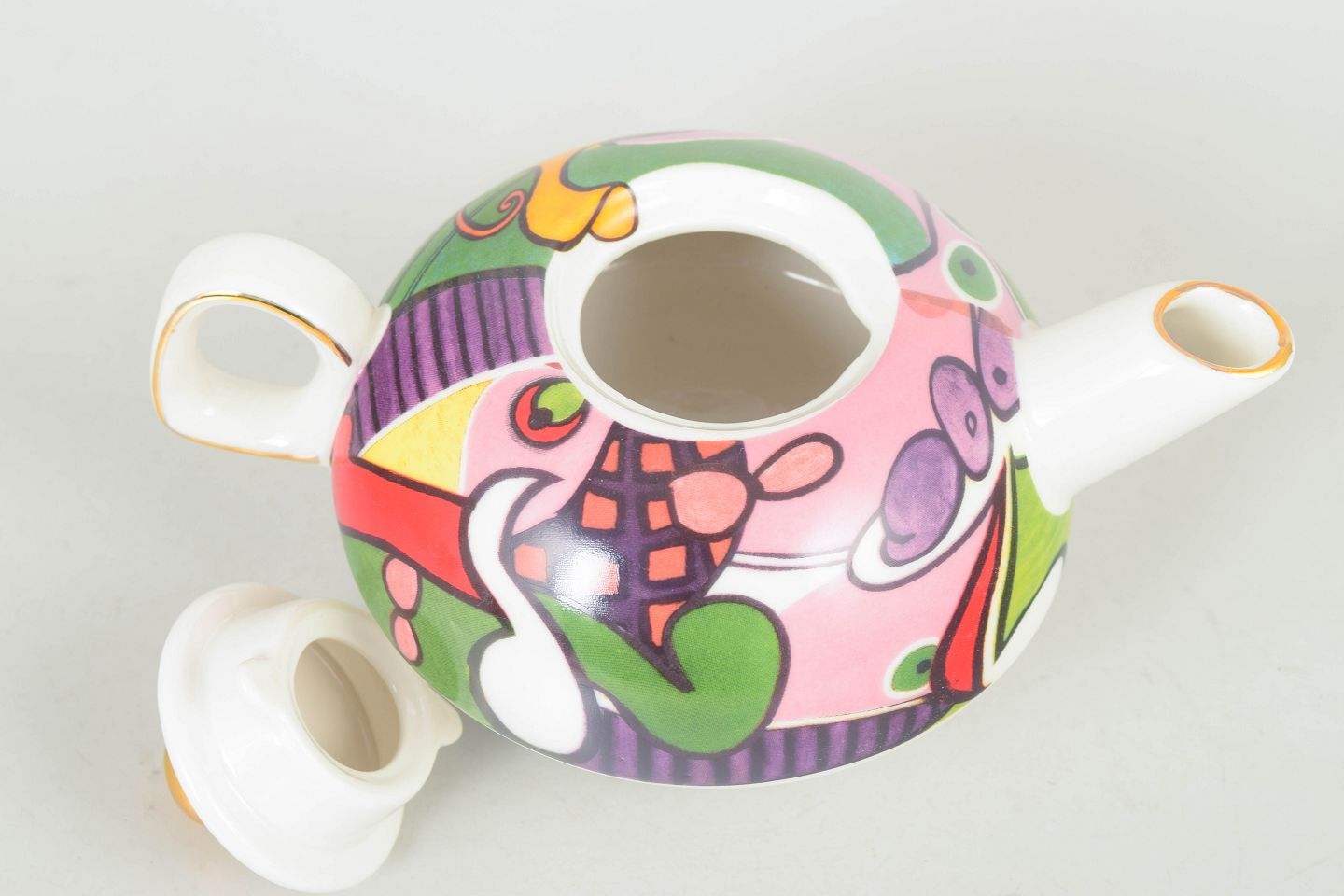 Picasso tekande.Tekande i porcelæn med låg, mærket Picasso. Rundet form med farverig dekor i stærke kontraster samt guldkant på knop og tud, typisk for sen 1900-tals produktion.