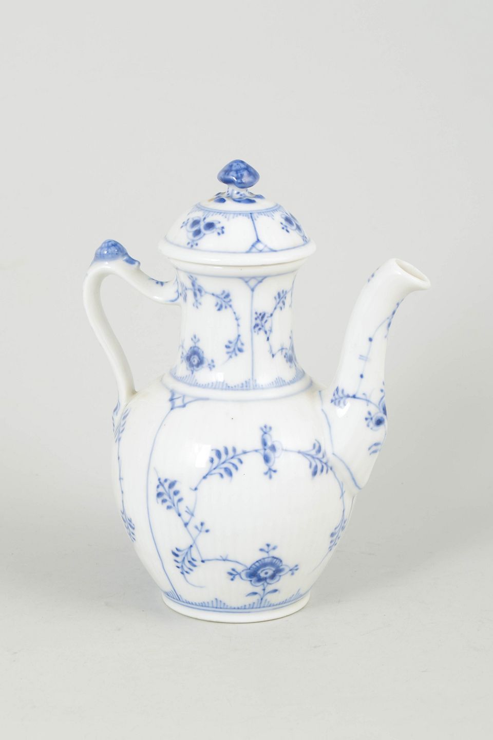 Håndmalet espressokande i porcelæn med klassisk musselmalet riflet dekoration, model 1/45, første sortering.