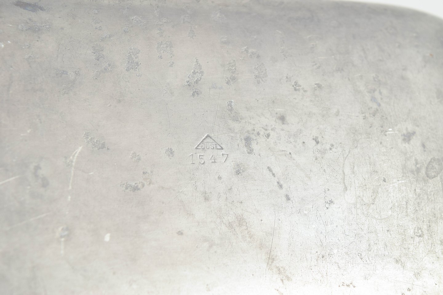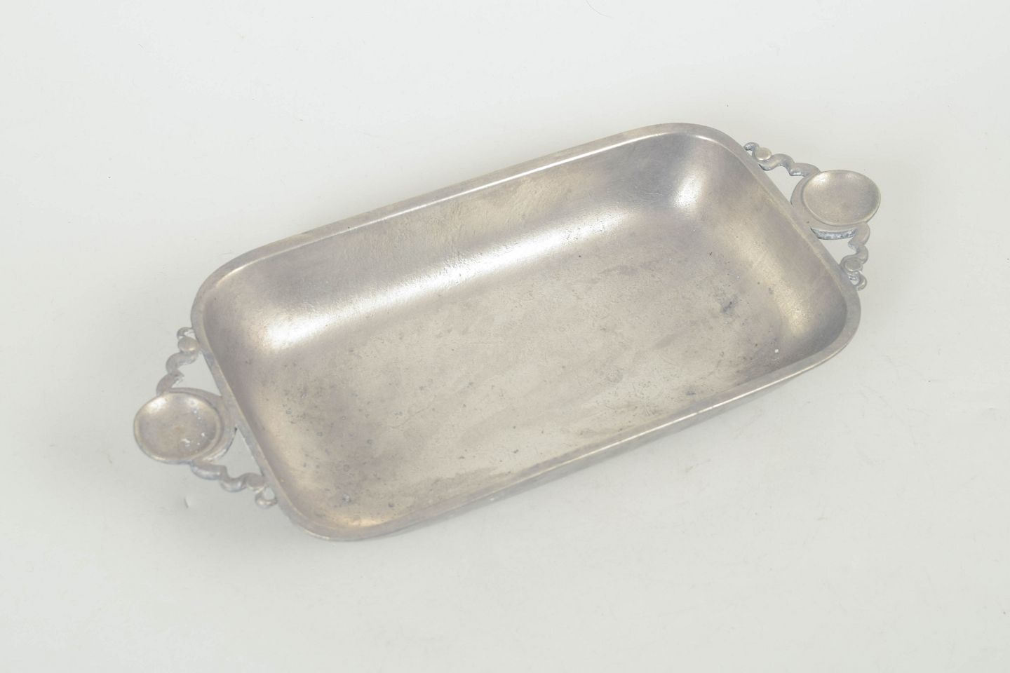 Rektangulært tinfad med integrerede greb, model 1547, udført i en enkel og funktionel form med bløde afrundinger. Klassisk dansk design fra mellemkrigstiden med let patineret overflade.