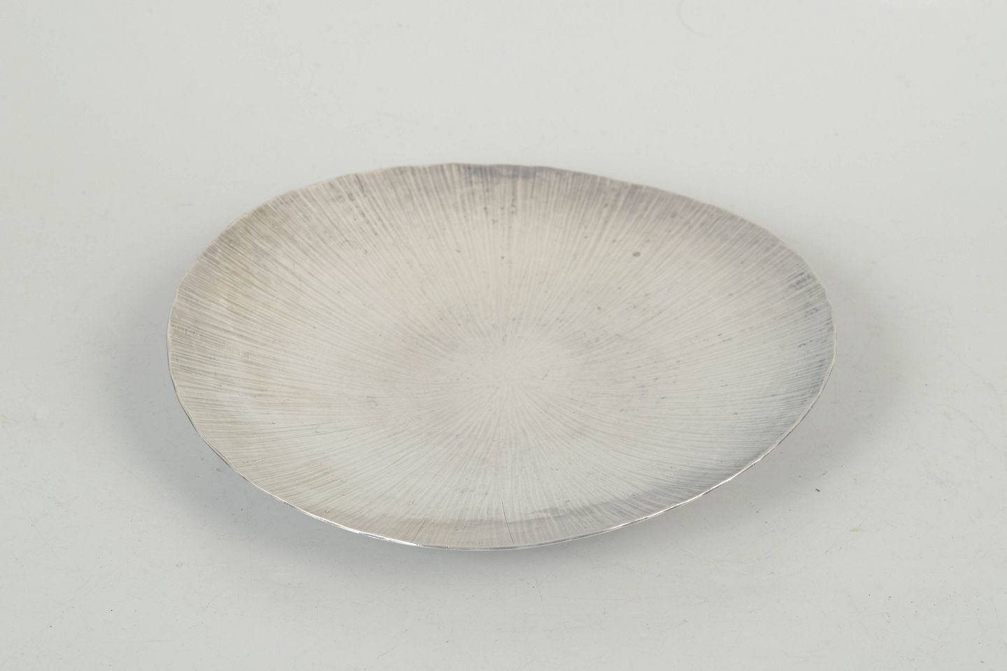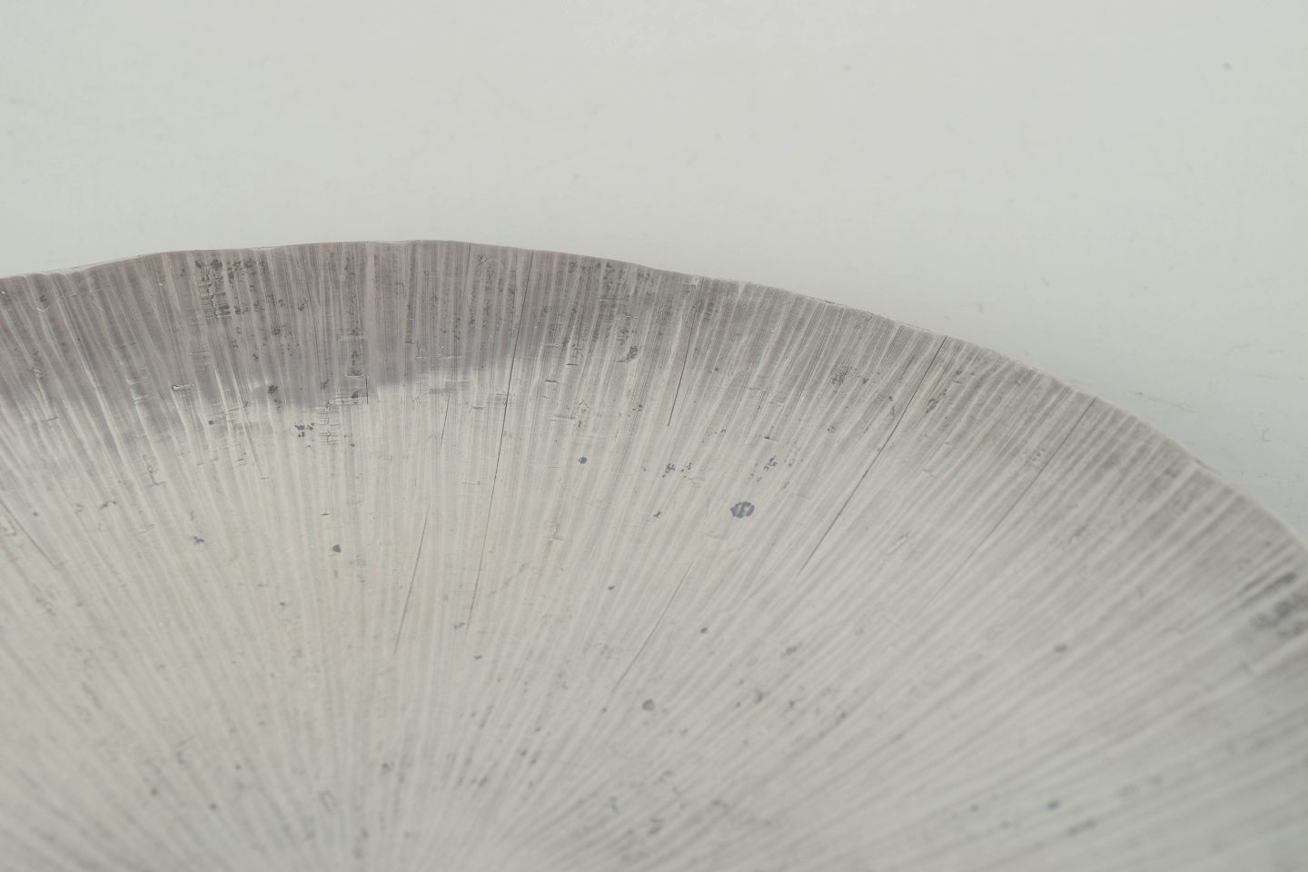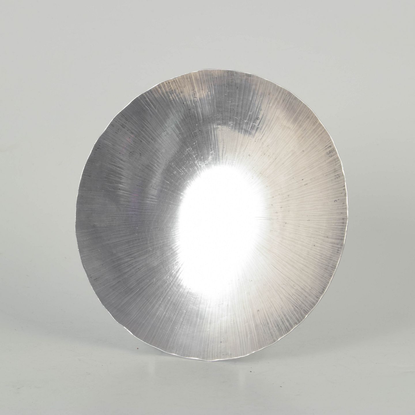 Cirkulær skål udført i sterlingsølv med karakteristisk håndhamret overflade og radiært mønster, model fra 1989, signeret.