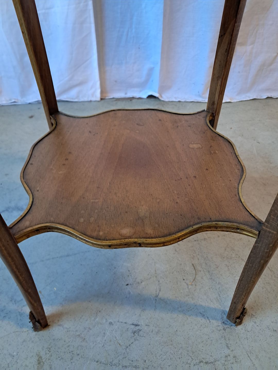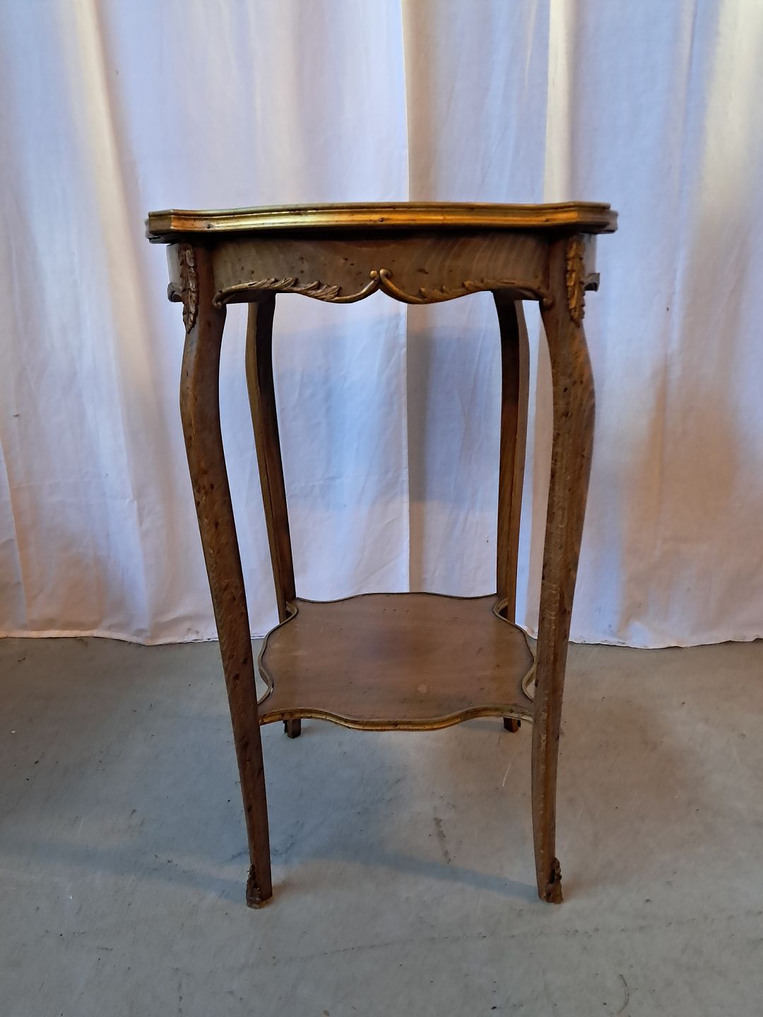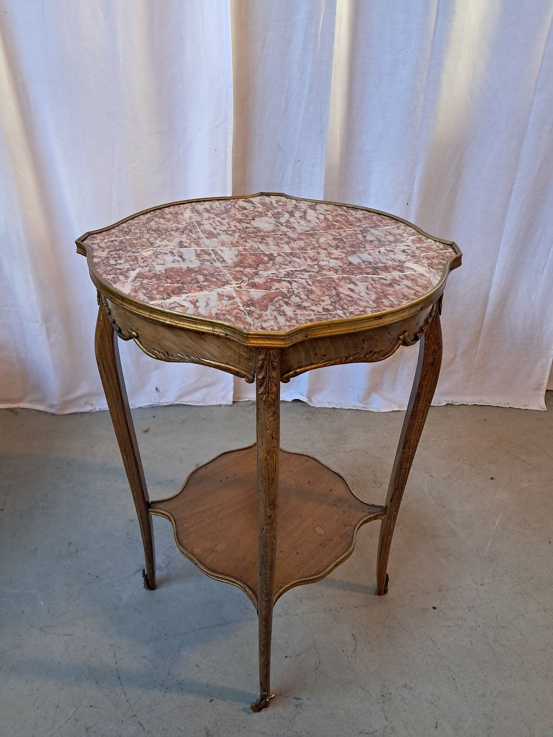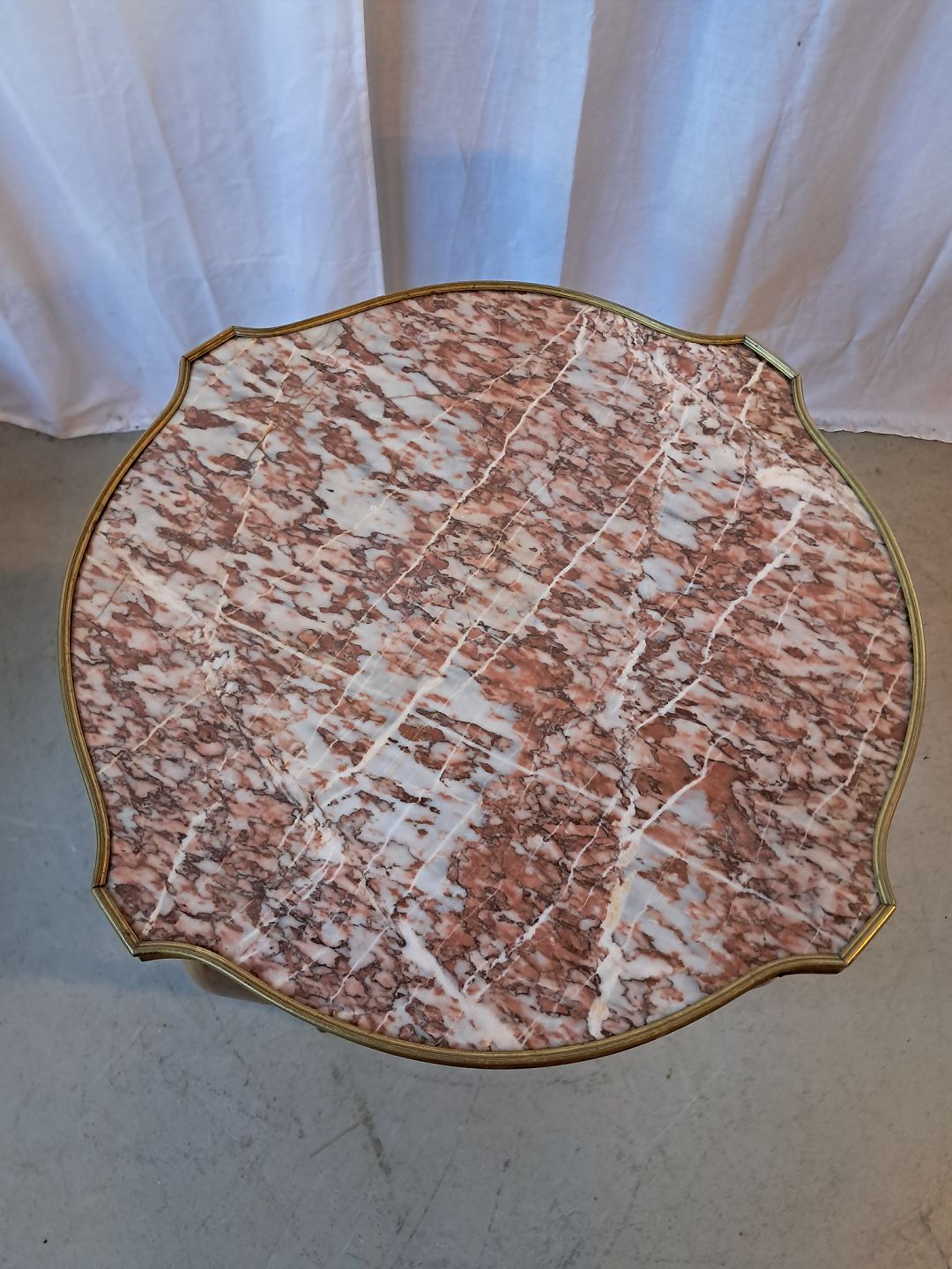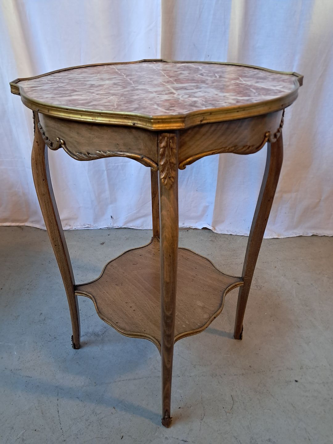 Sidebord i bøgetræ med marmorplade med metalkant, fra 1950erne.Det har brugsspor.