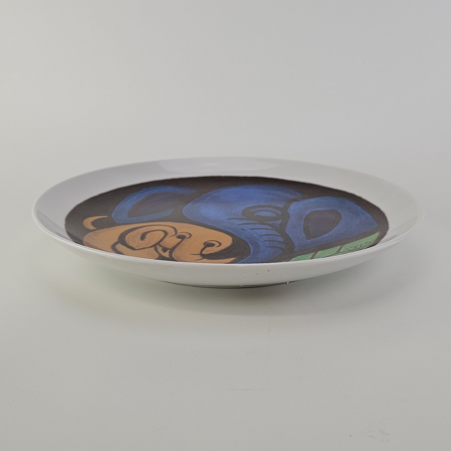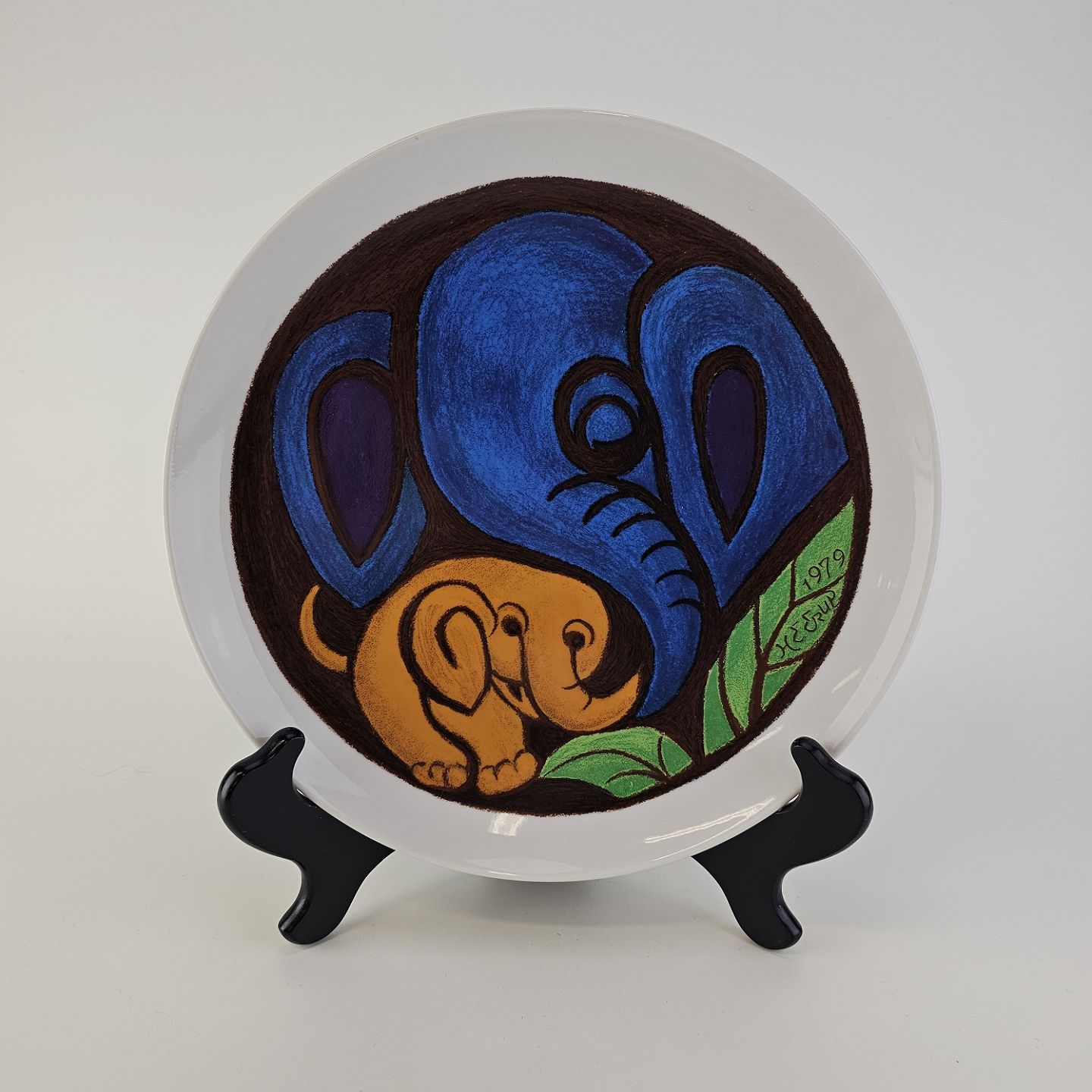 Platte af kongeligt porcelæn med motiv af elefanter i blå, orange og grønne farver. Nr. 115/1200