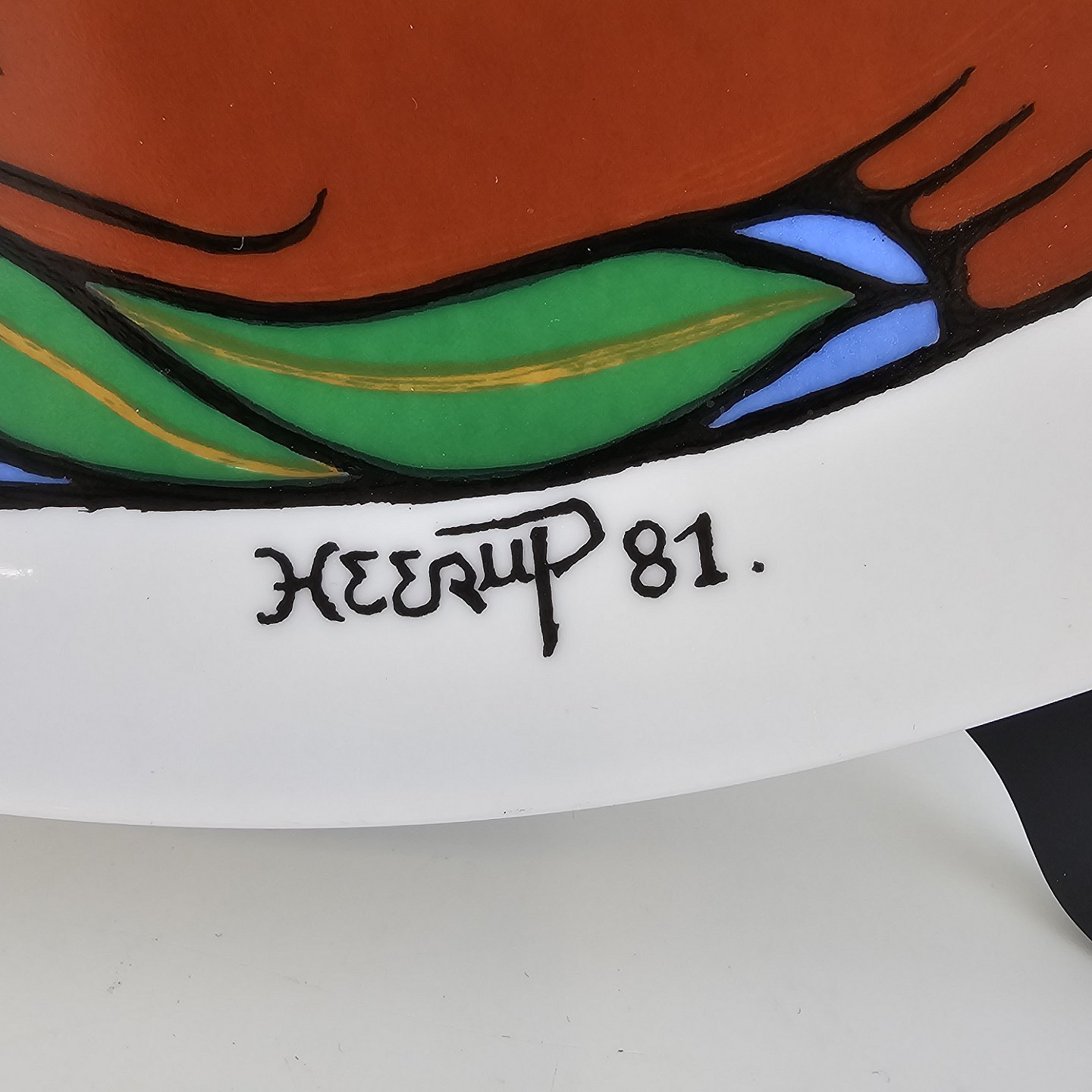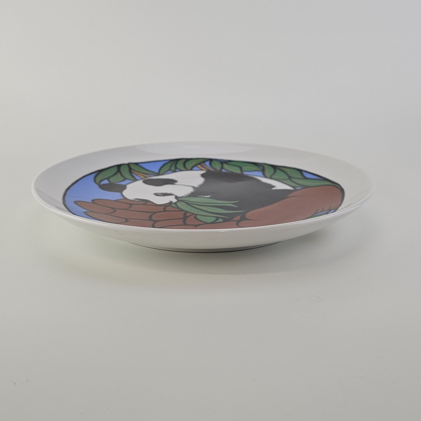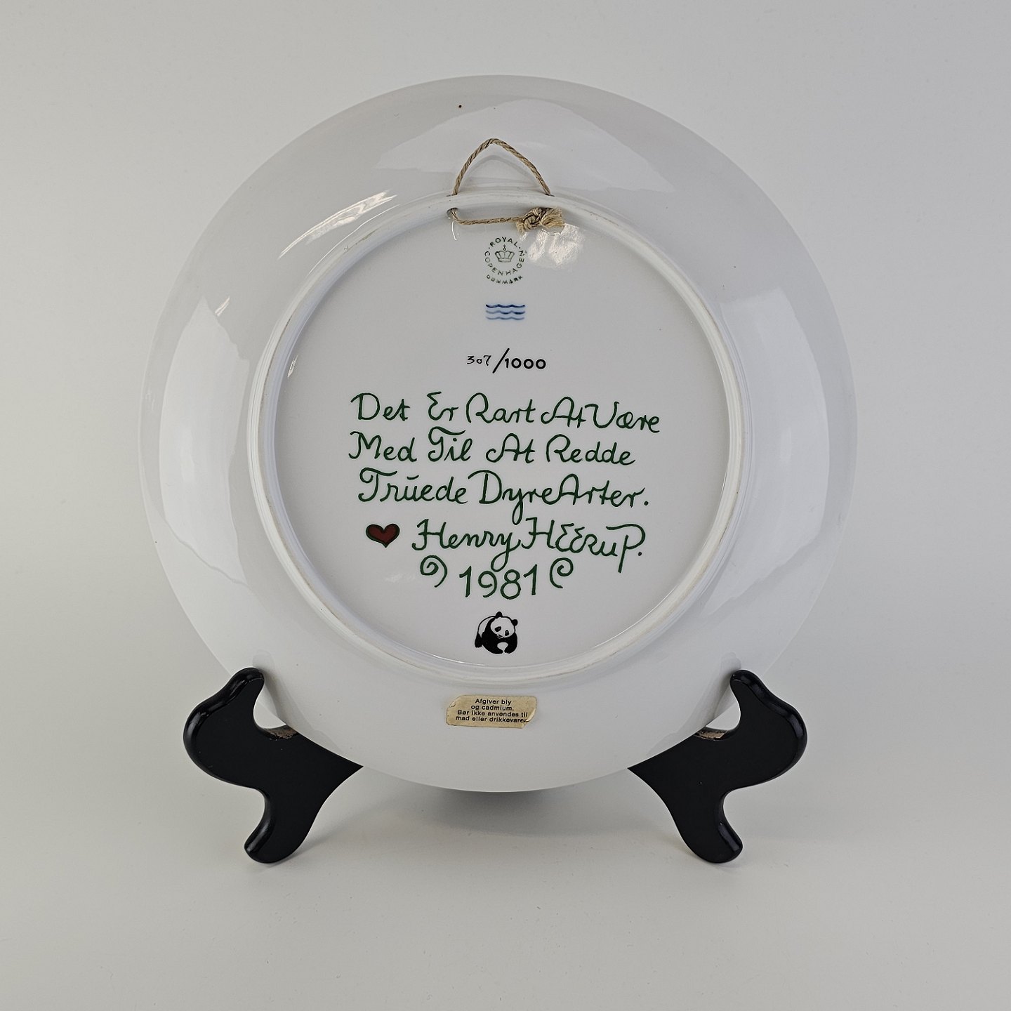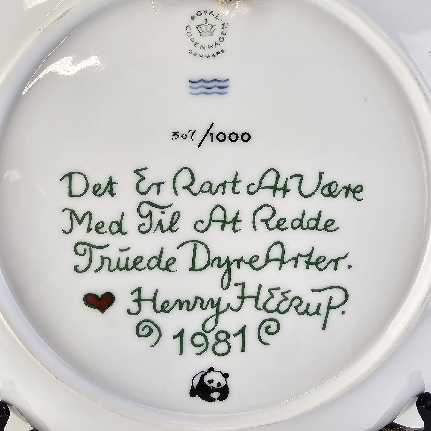 Platte af kongeligt porcelæn med motiv af en panda, som sidder i en åben hånd. Nr. 307/1000Signeret Heerup 1981 og dedikeret til Verdensnaturfondens arbejde med truede dyrearter