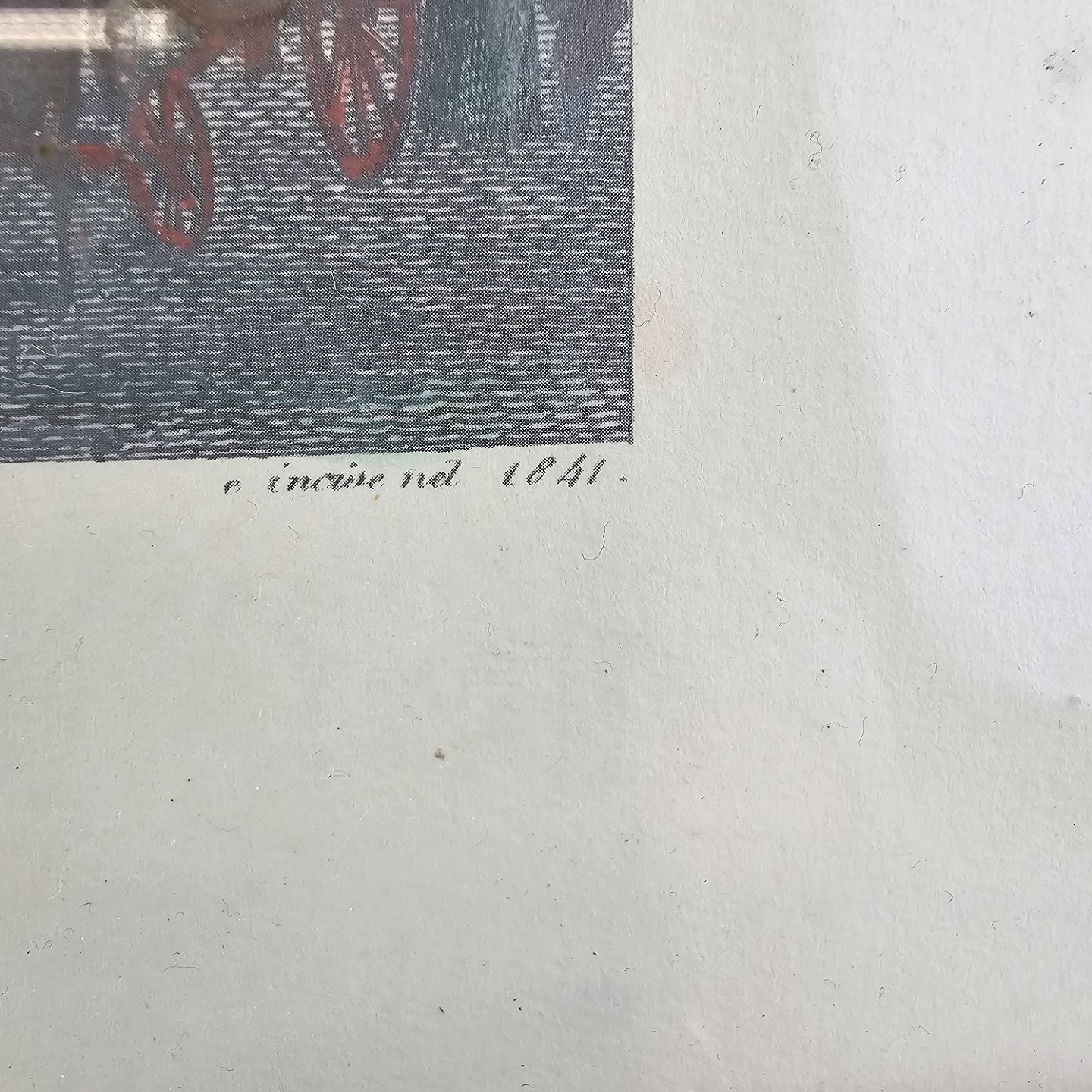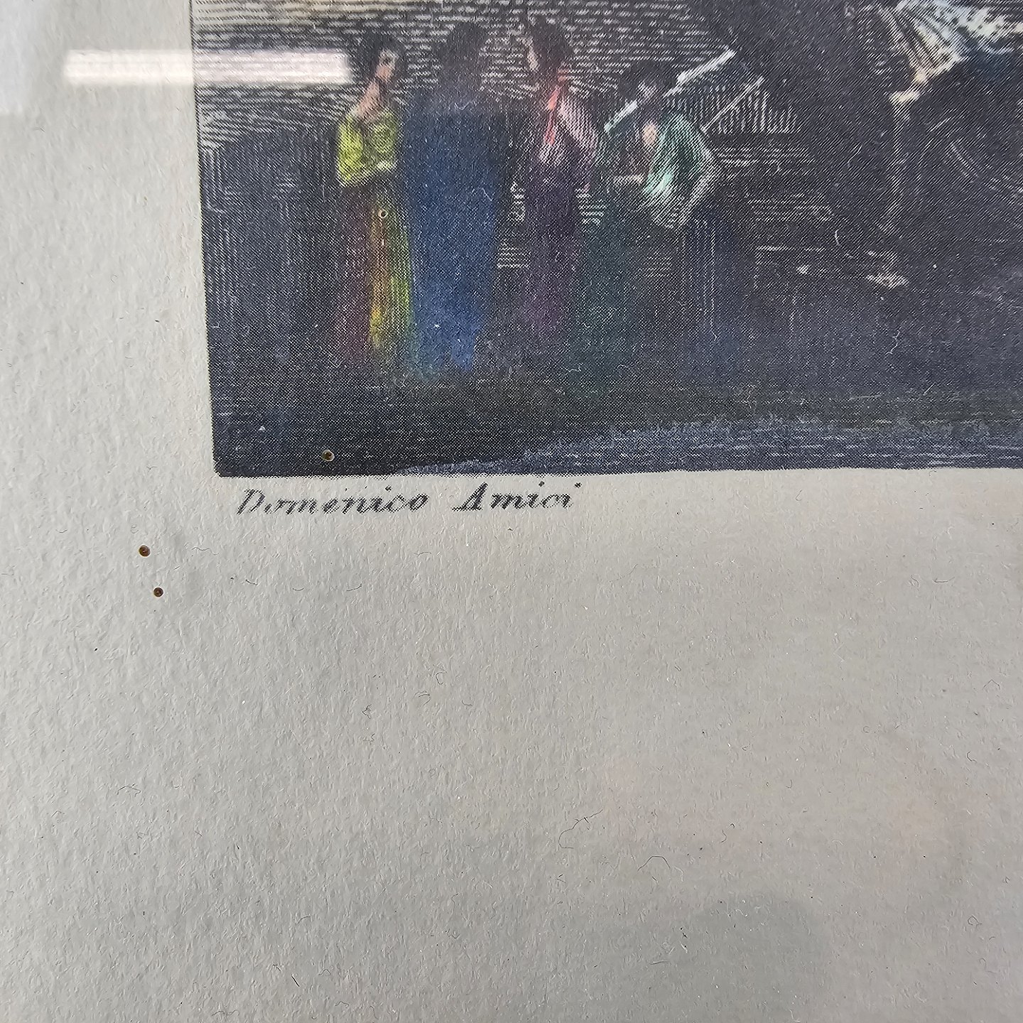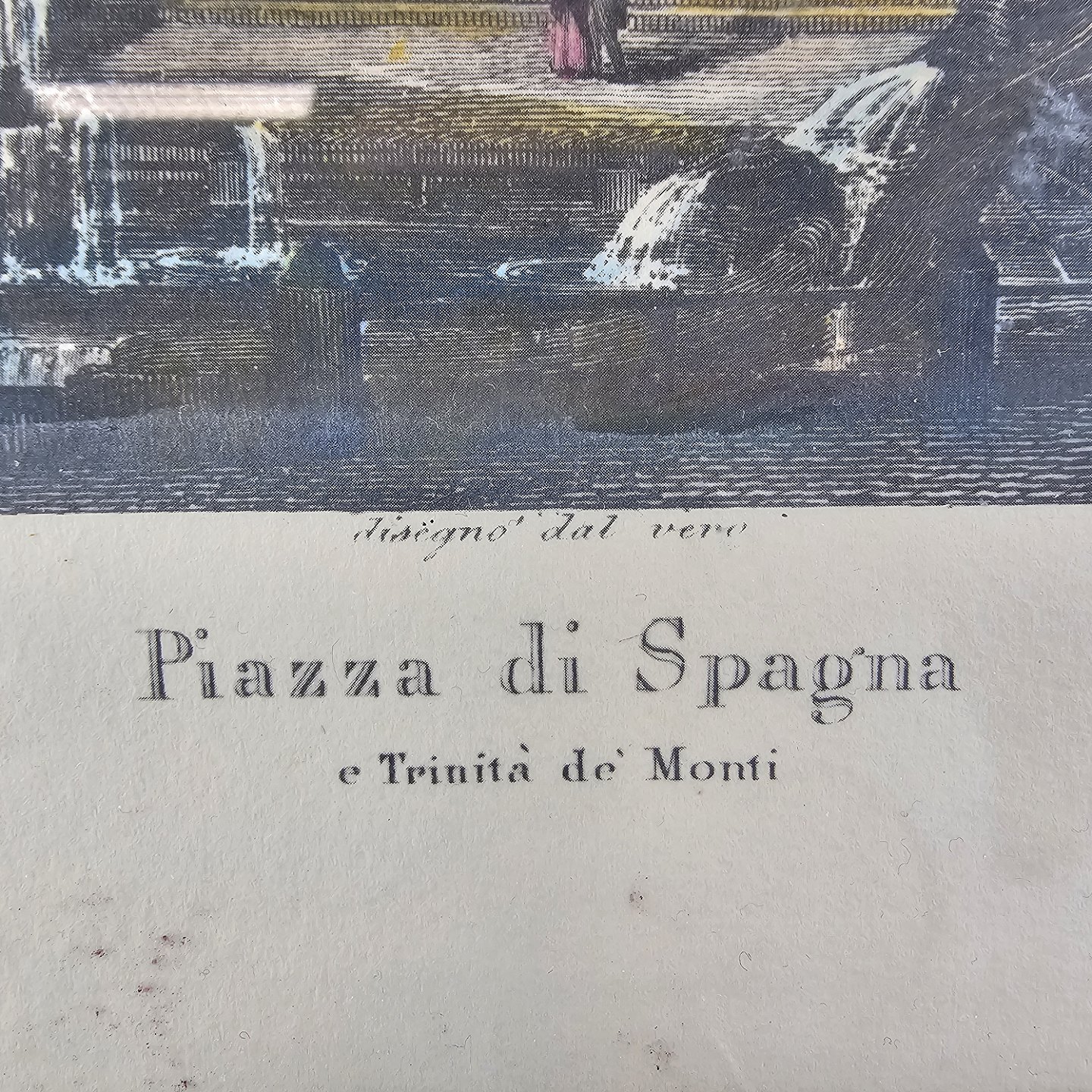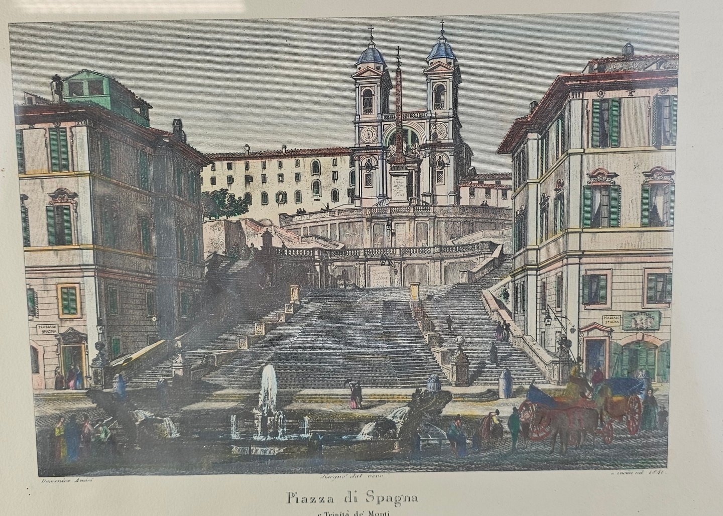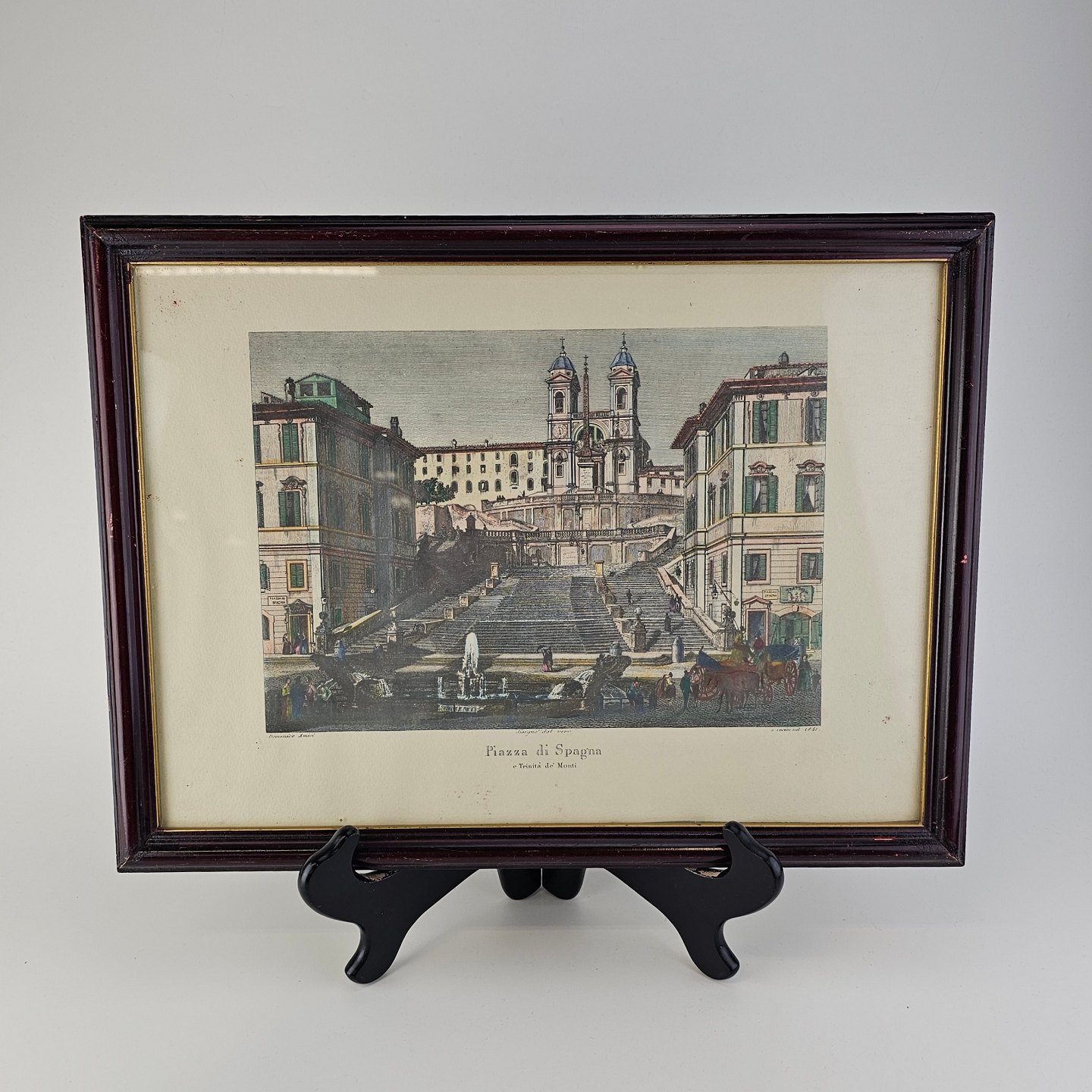 Bogtryk på papir med motiv af Piazza di Spagna i Rom, monteret i sort rammeKunstner Domenico Amici (1808-1871)
