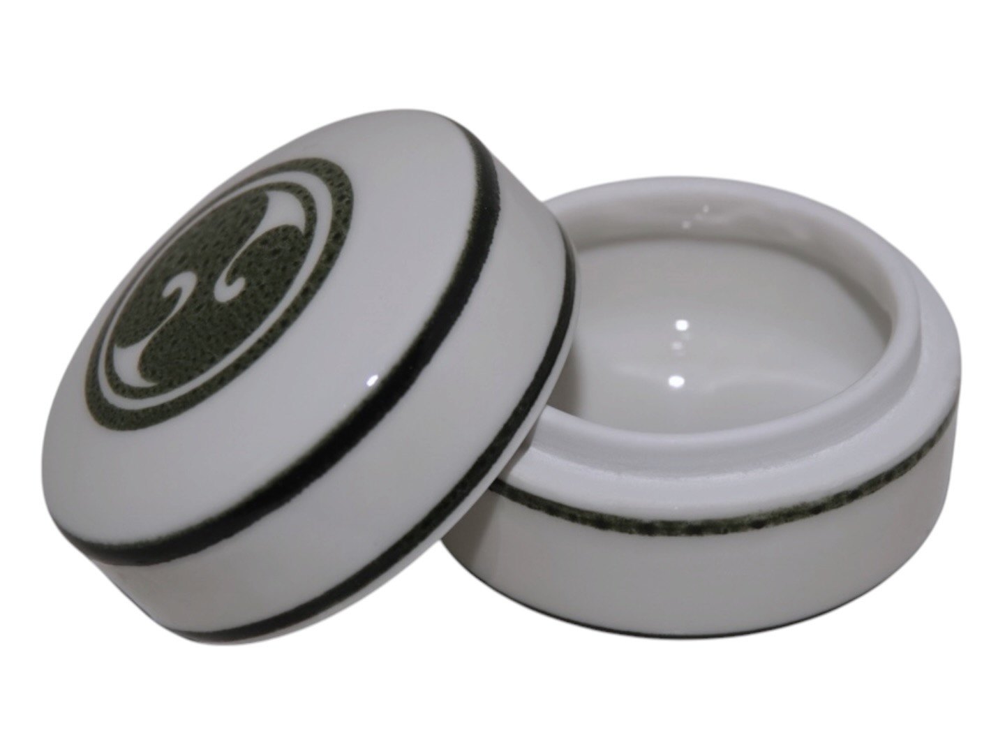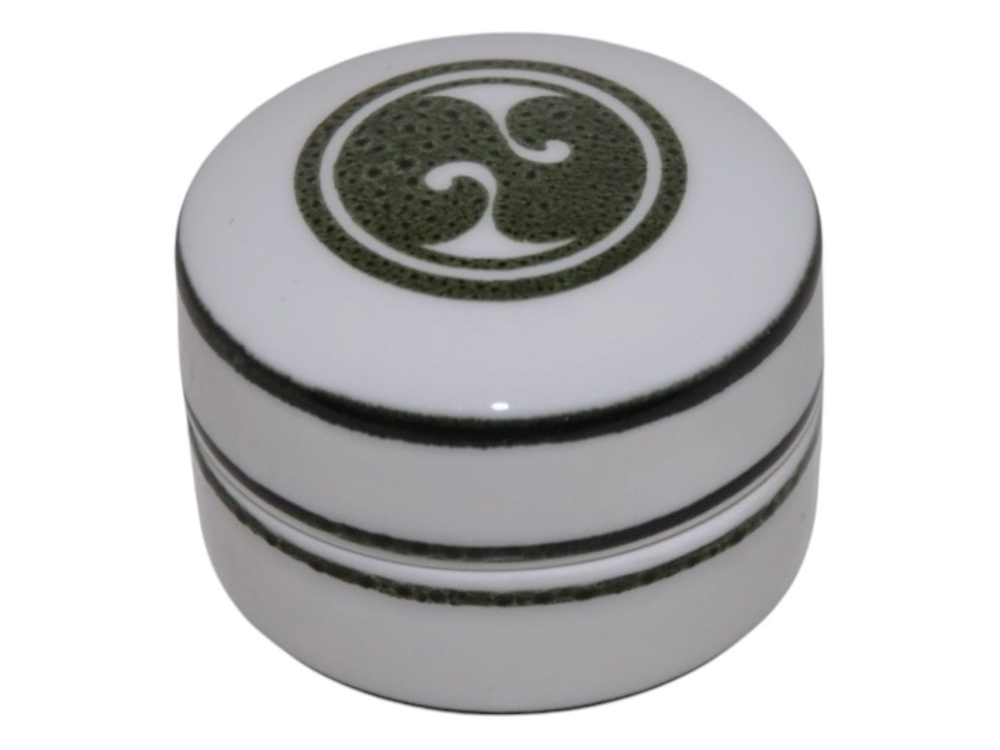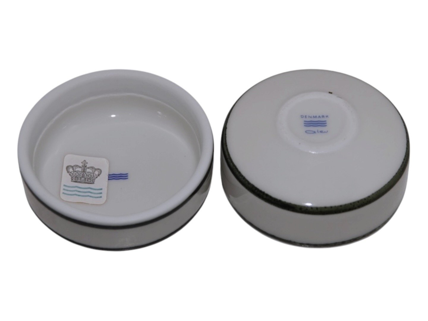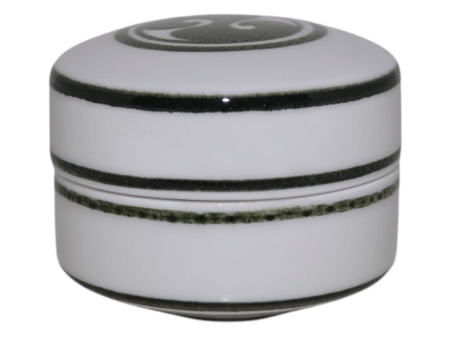 Royal Copenhagen kunstporcelæn, lille lågkrukke med grøn dekoration designet af Alev Siesbye.1. sortering.