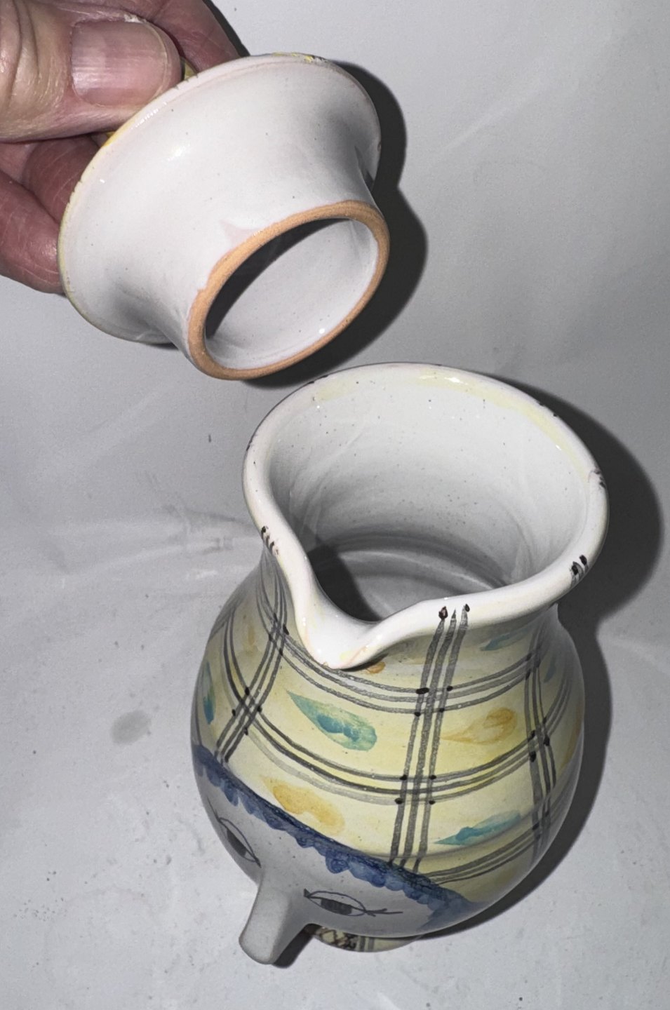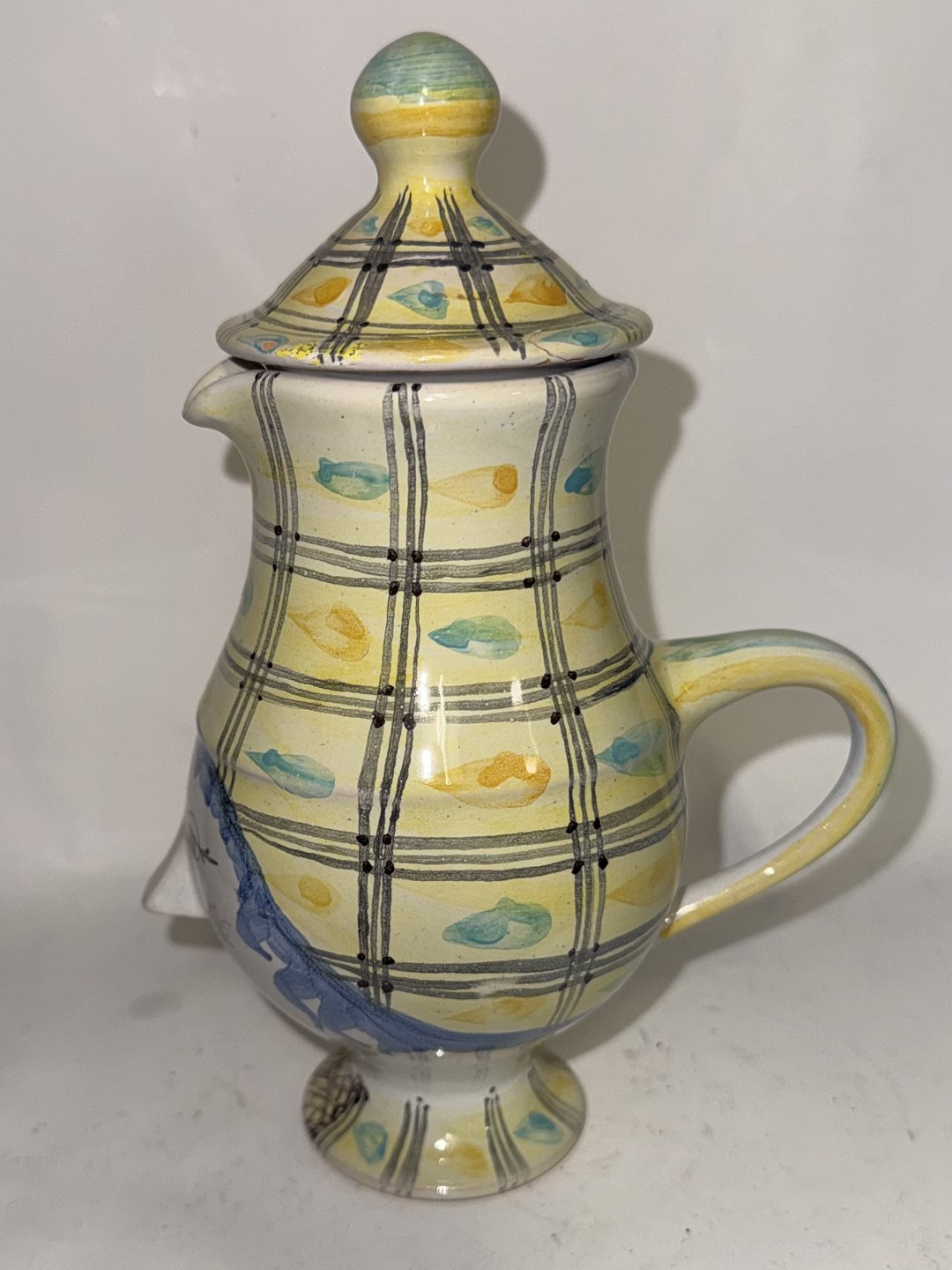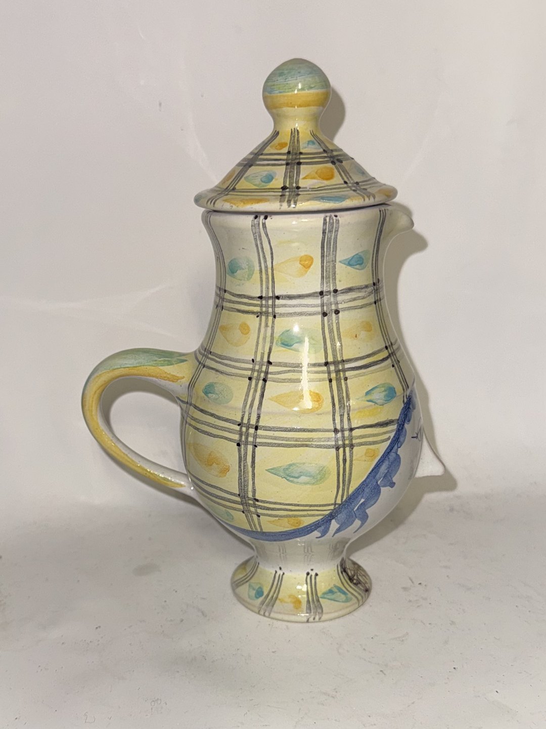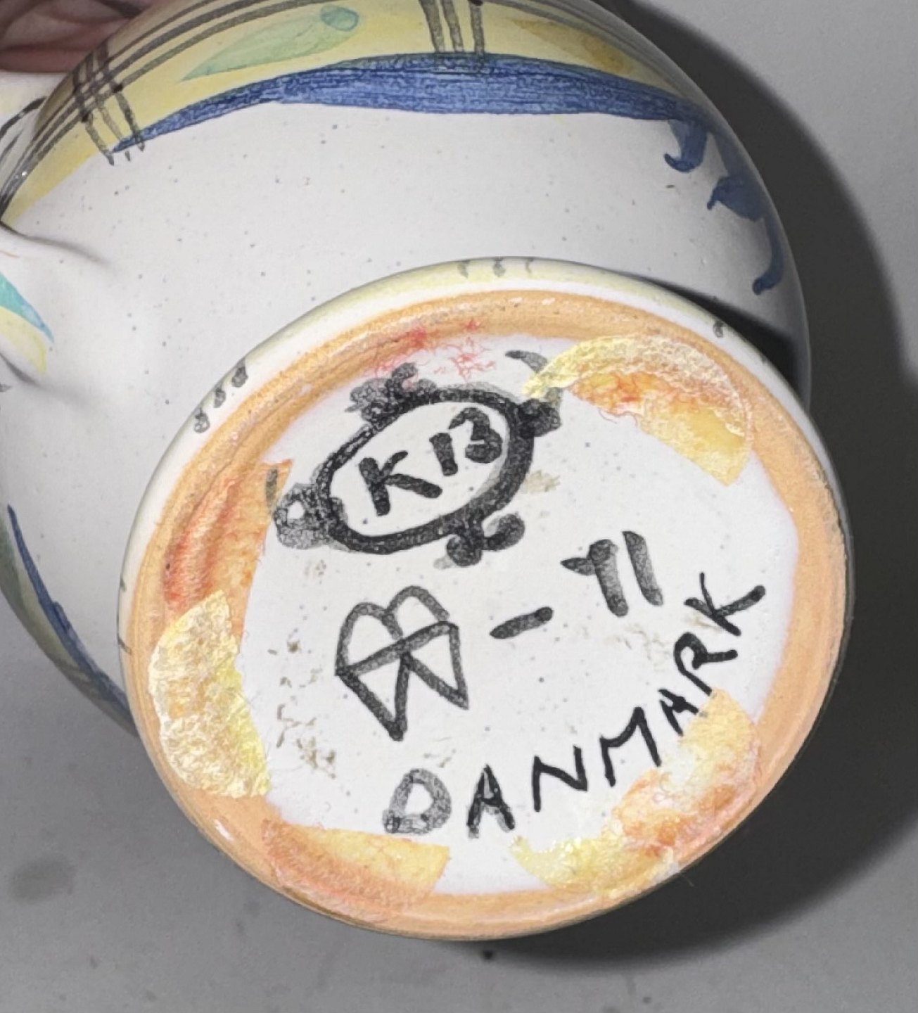 Bjørn Wiinblad kande med hank og låg. Fremstår i god stand. Signerer på undersiden. Fremstillet i 1971. H. 18 cm