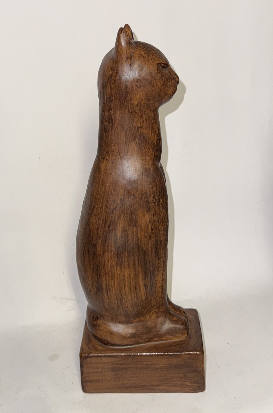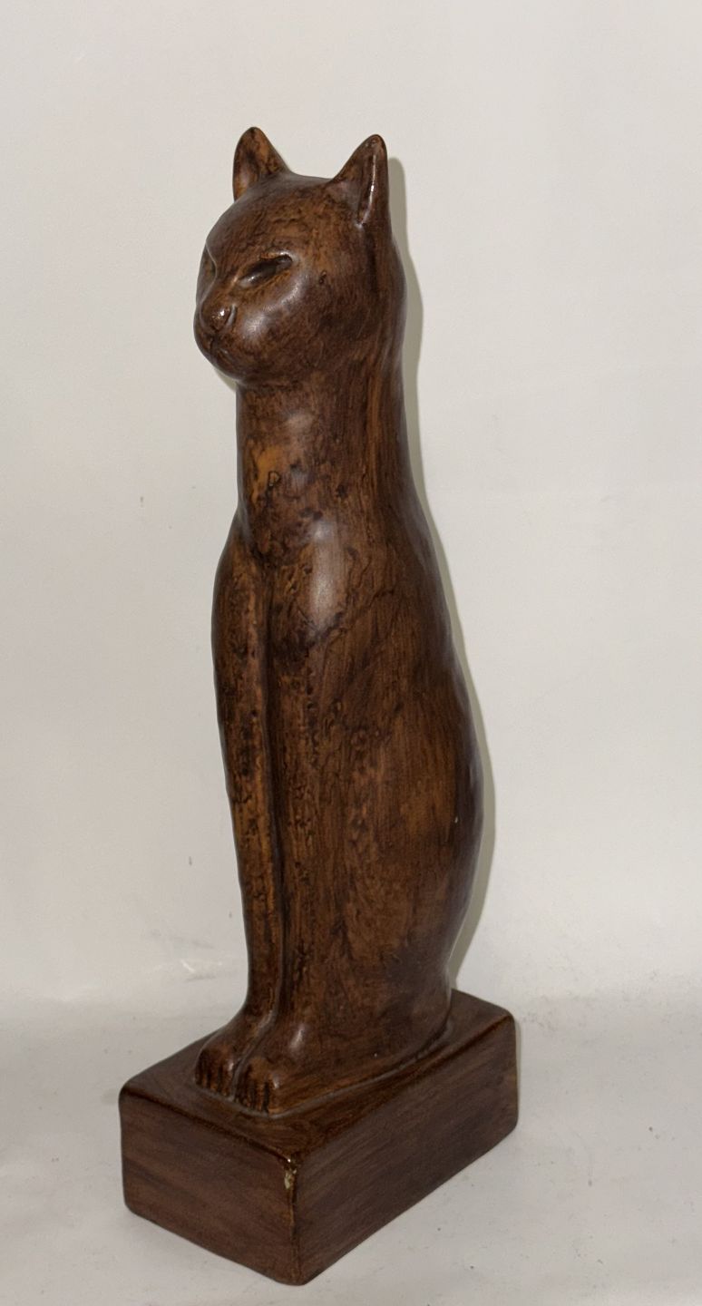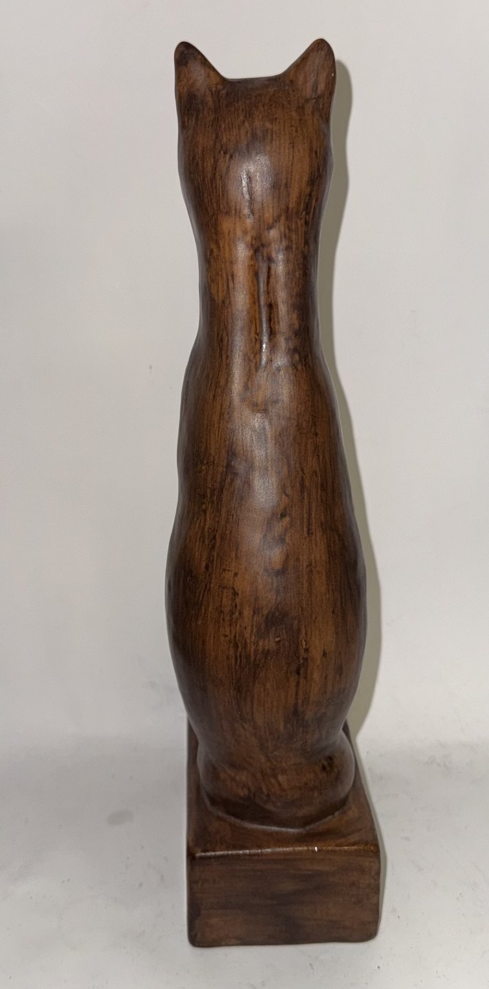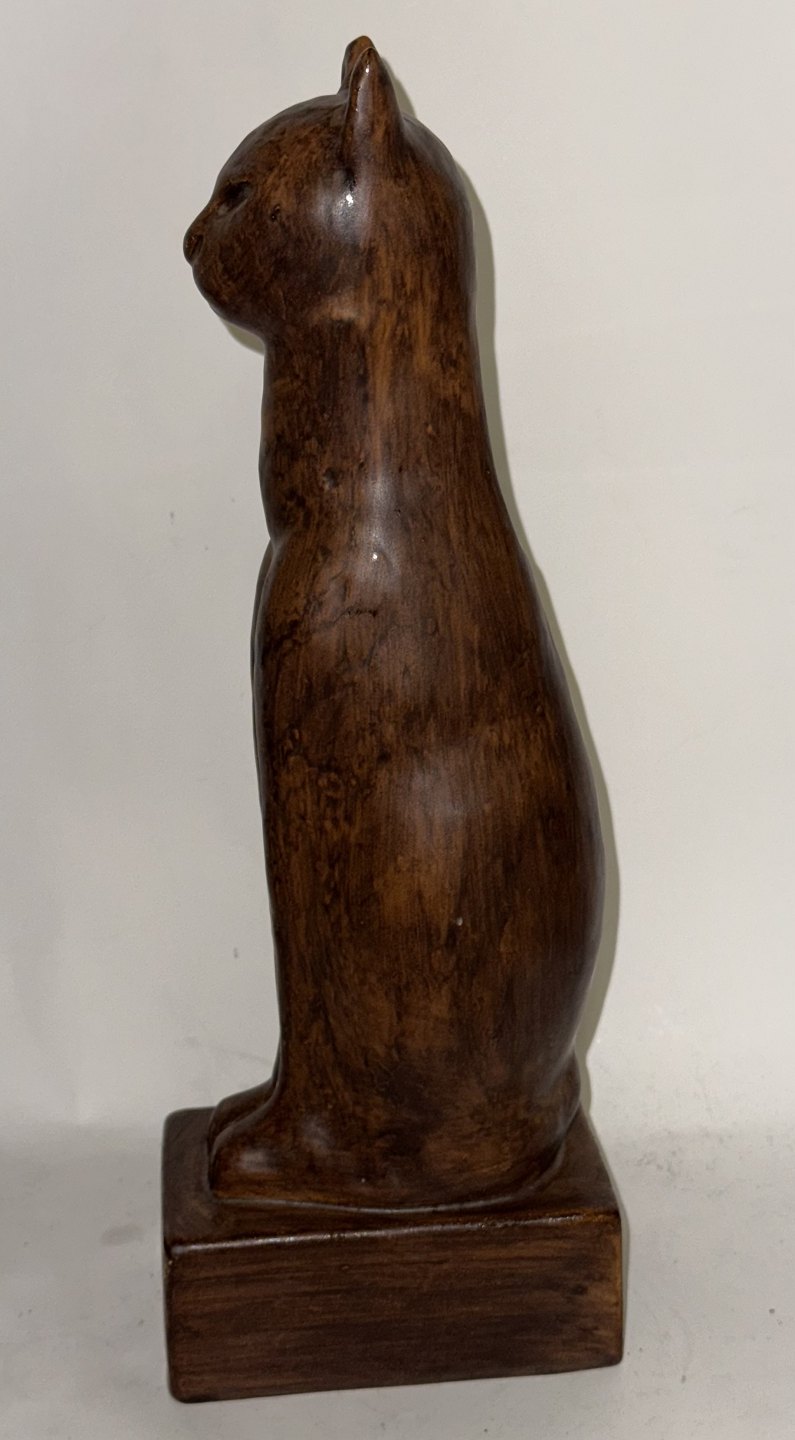 Figur af siddende kat i keramik af Emil Ruge. Dækket af brun glasur. Fremstår i god stand. Signeret af kunstneren på soklens inderside. H. 30 cm