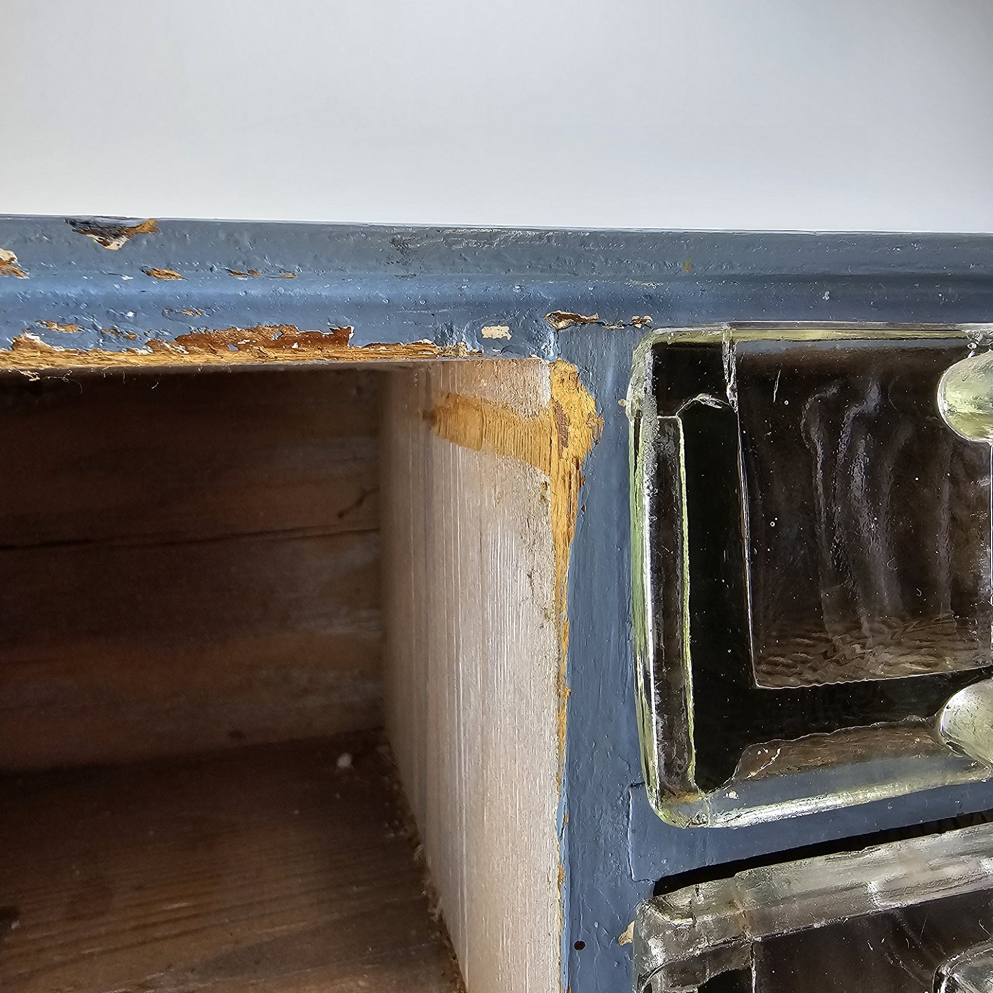 Fremstår med brugsspor på malingen på begge sider, små mærker på glas skufferne og et afslag på bagsiden af den ene skuffe