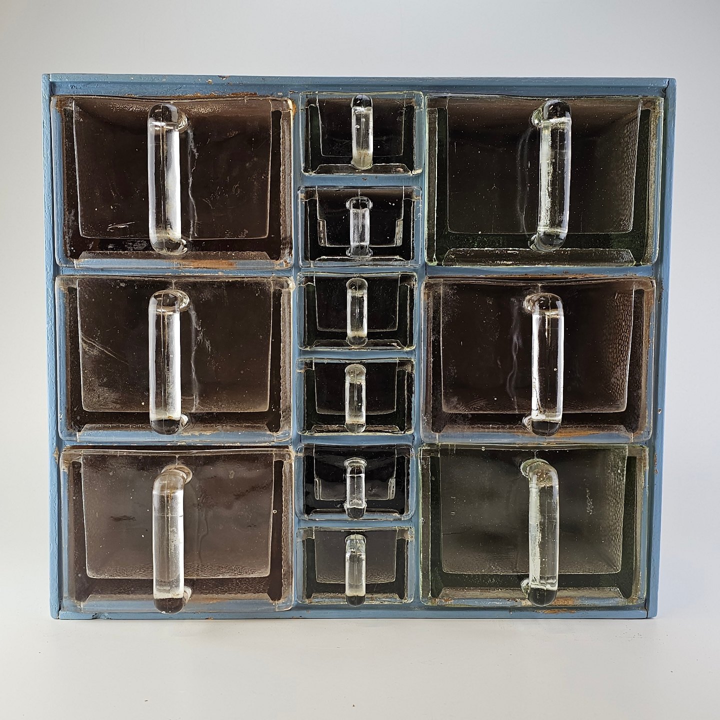 Flot patineret krydderihylde i blåmalet træ med skuffer af glas og to træskeer. Har 6 store skuffer og 6 små skufferProducent af nogle af glasskufferne VEWAG Eschebach. Formentlig dansk produceret.