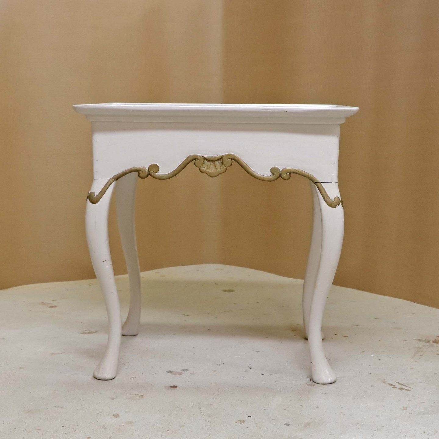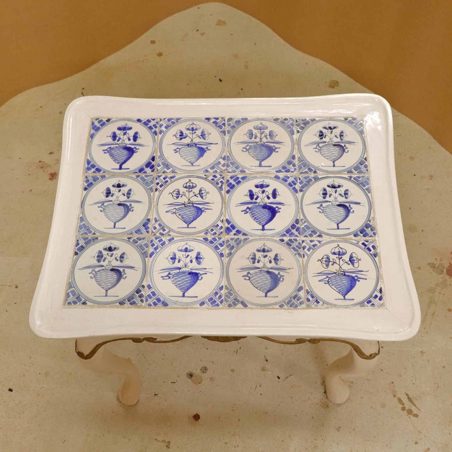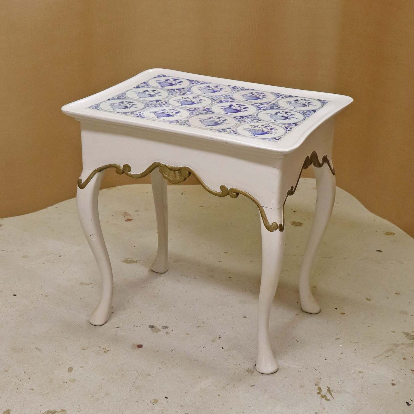Antik hollandsk entrebord med svungne ben fra 1800-tallet i hvidmalet træ med guldmalet mønster og håndmalede delft kakler i blå streng med motiv af blomsterkrukker (Blumenpot) og hjørnedekoration i Wan Li stil.Producent ukendt.