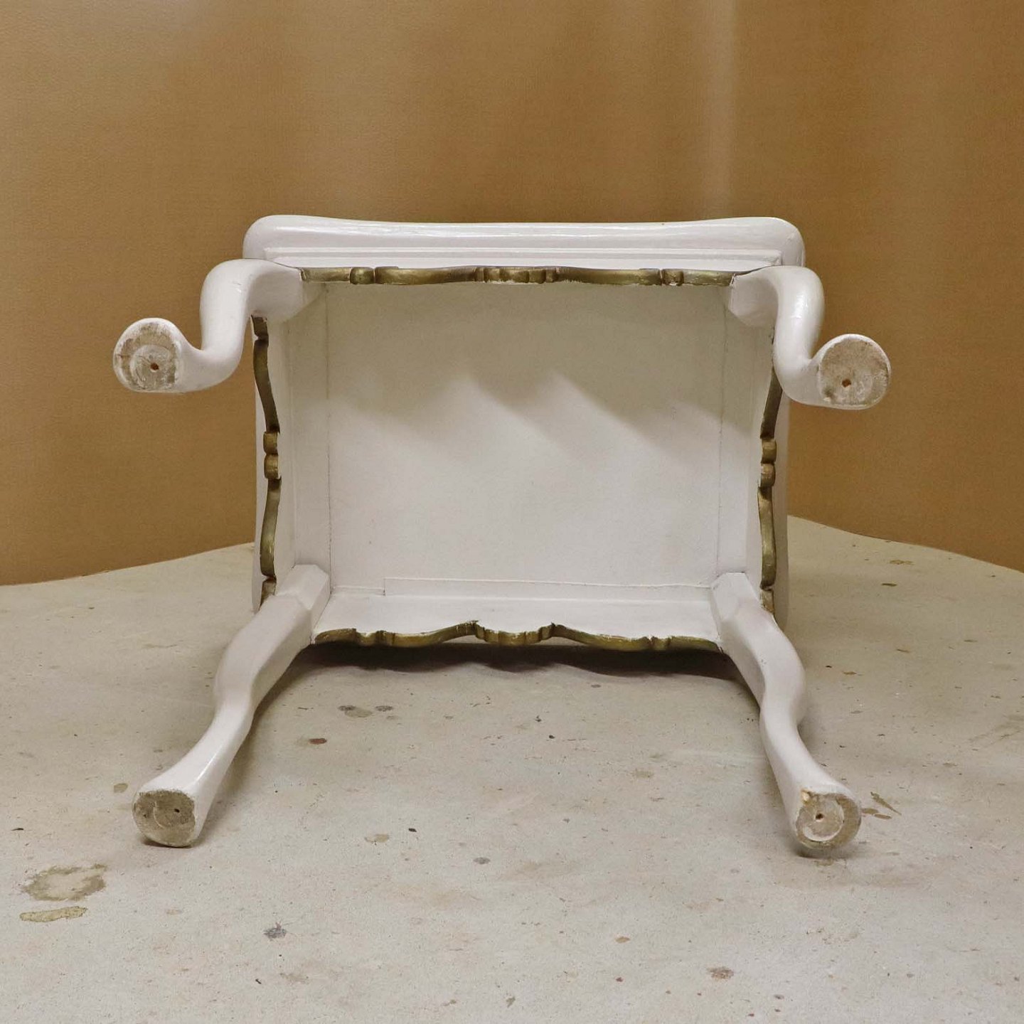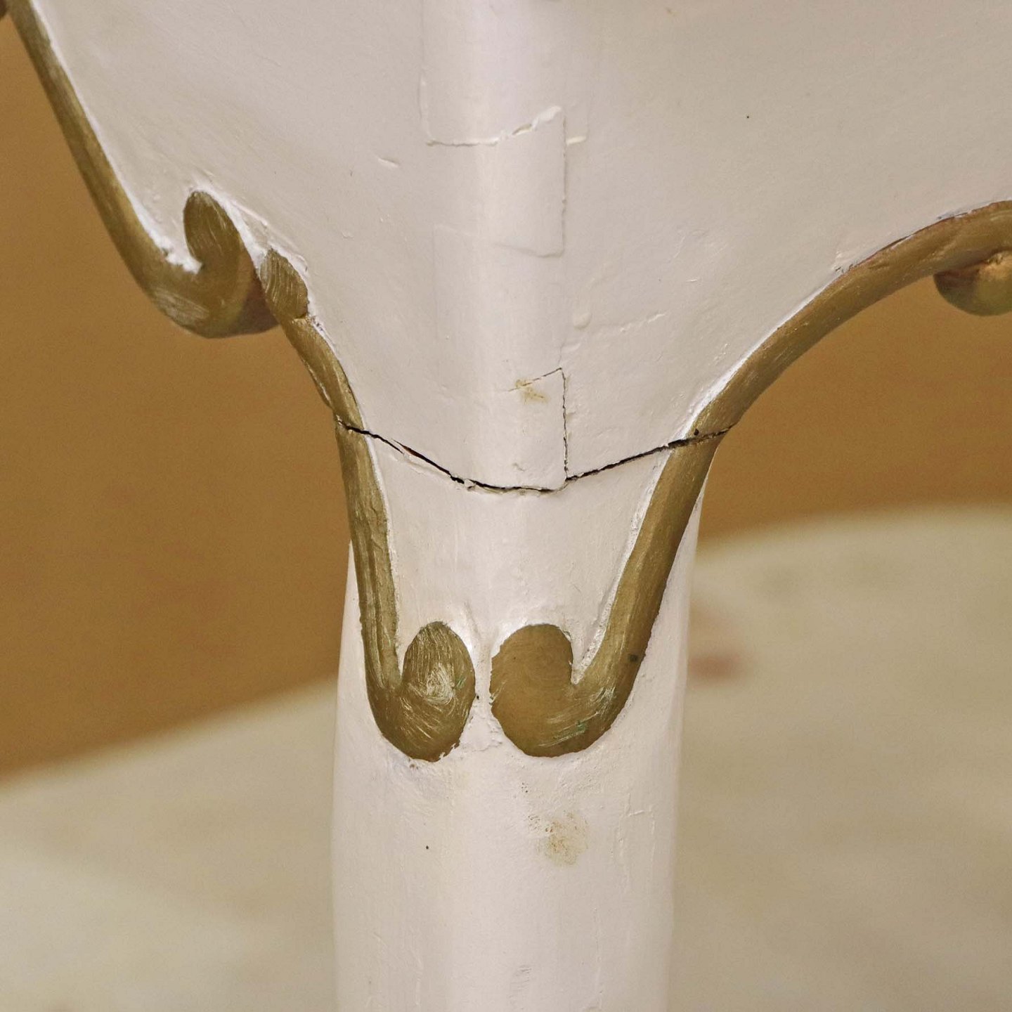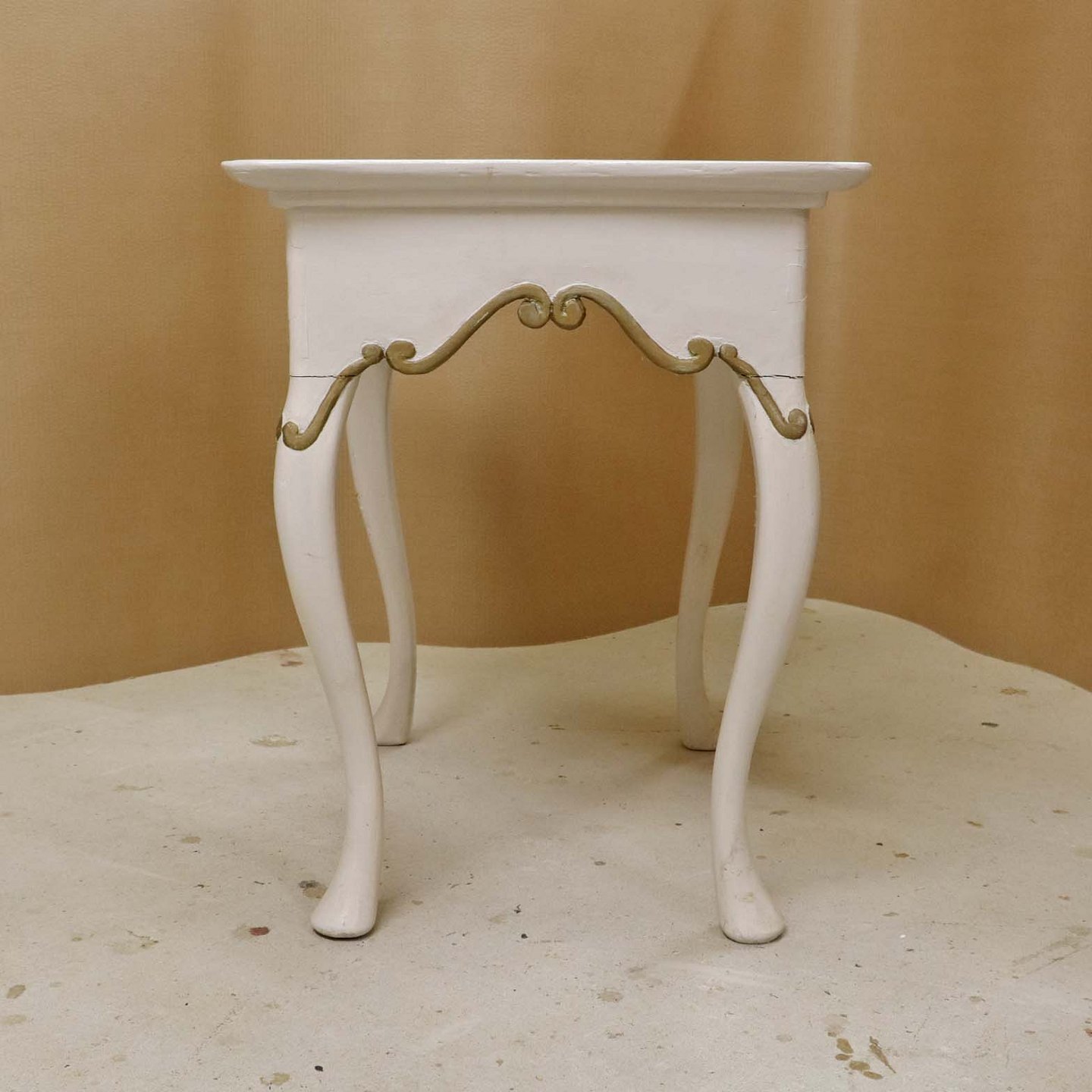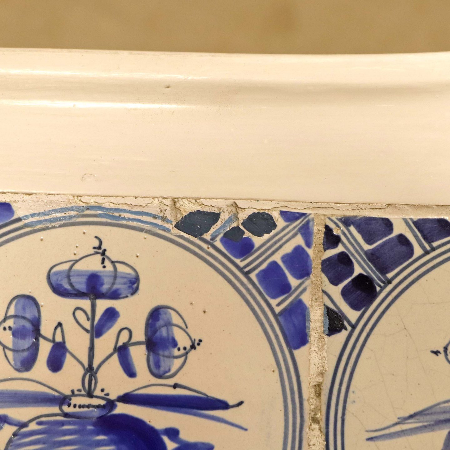 Antik hollandsk entrebord med svungne ben fra 1800-tallet i hvidmalet træ med guldmalet mønster og håndmalede delft kakler i blå streng med motiv af blomsterkrukker (Blumenpot) og hjørnedekoration i Wan Li stil.Producent ukendt.