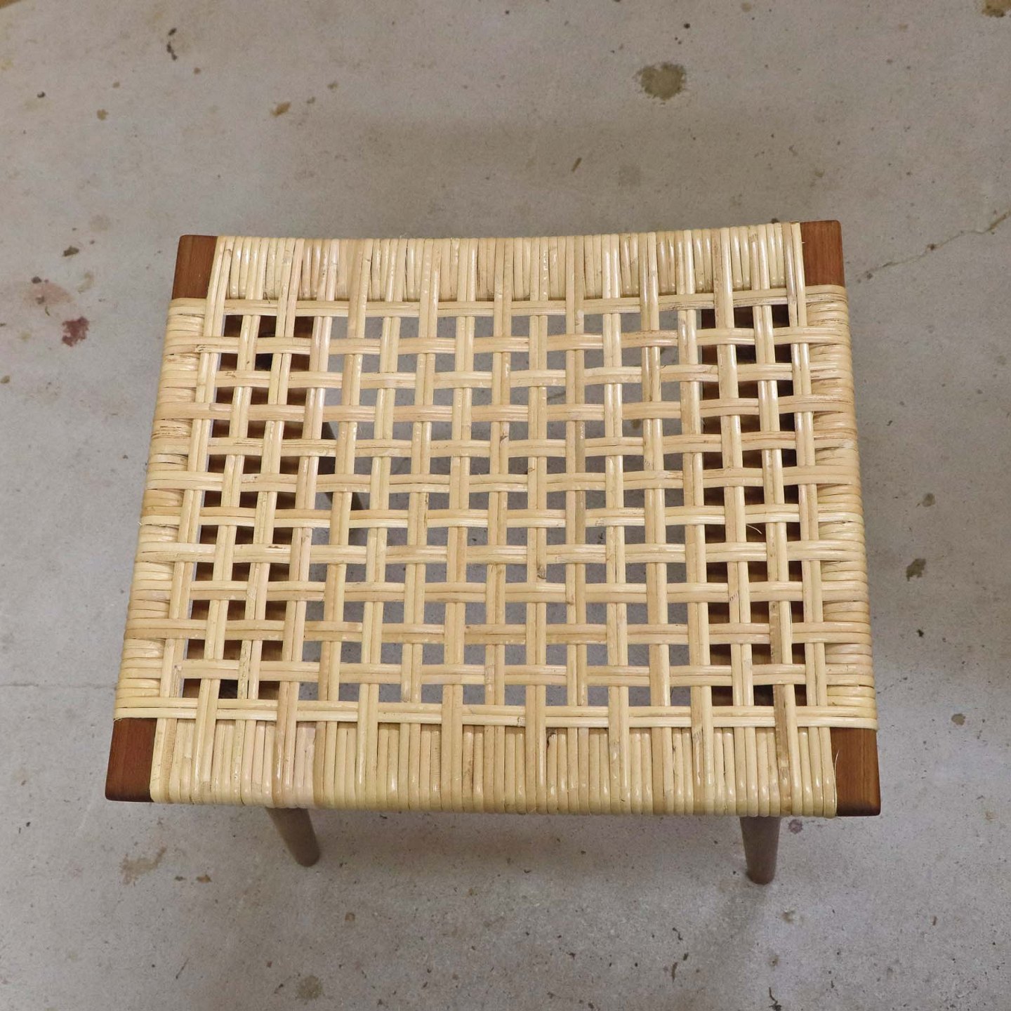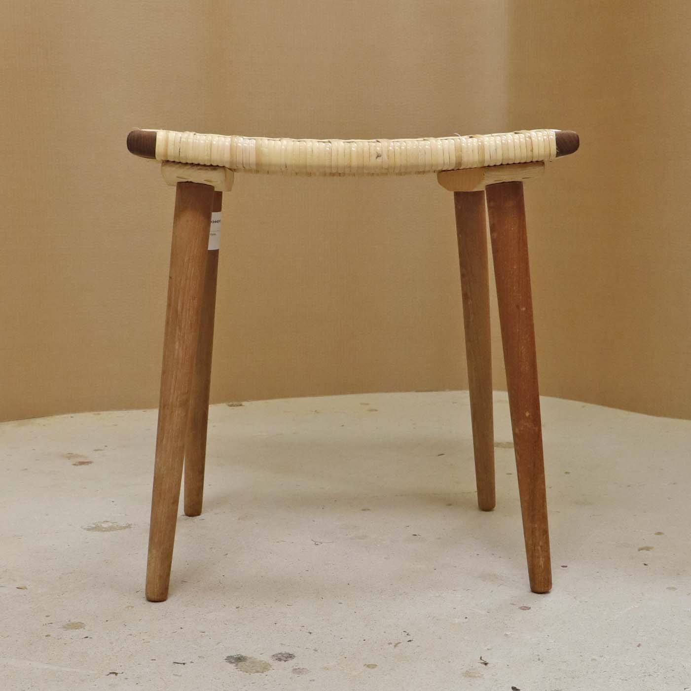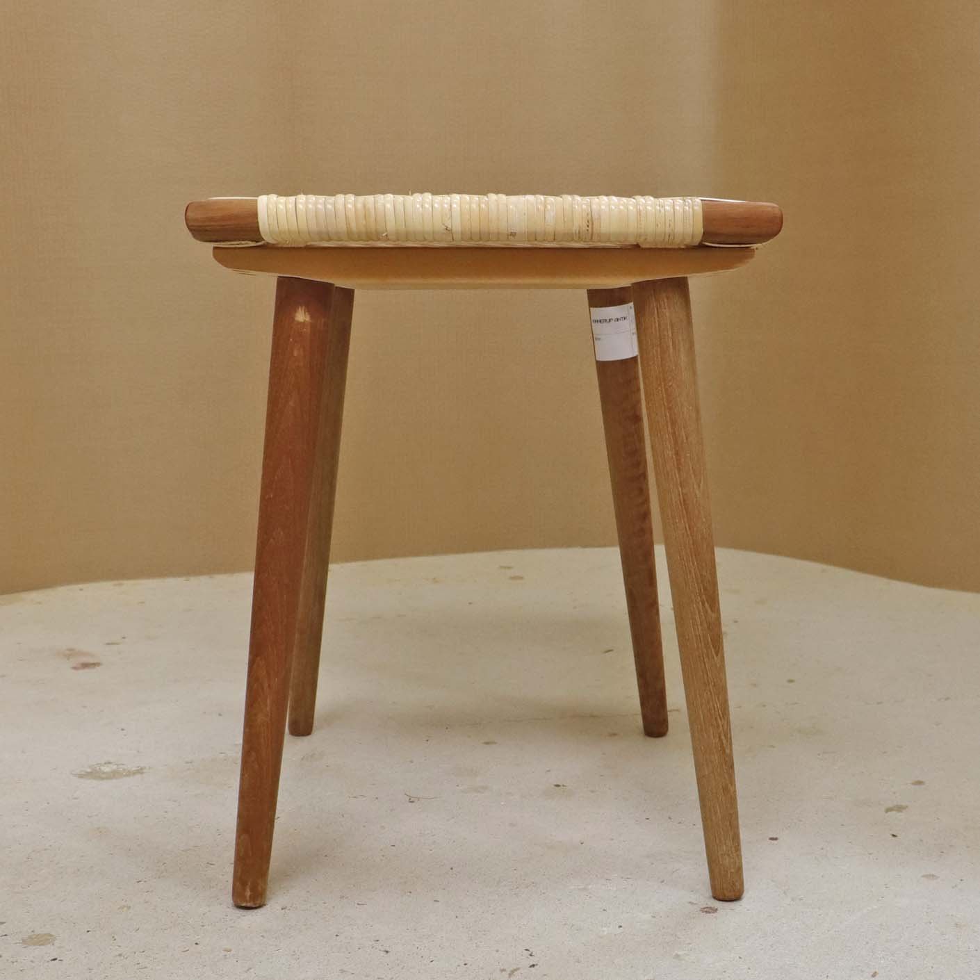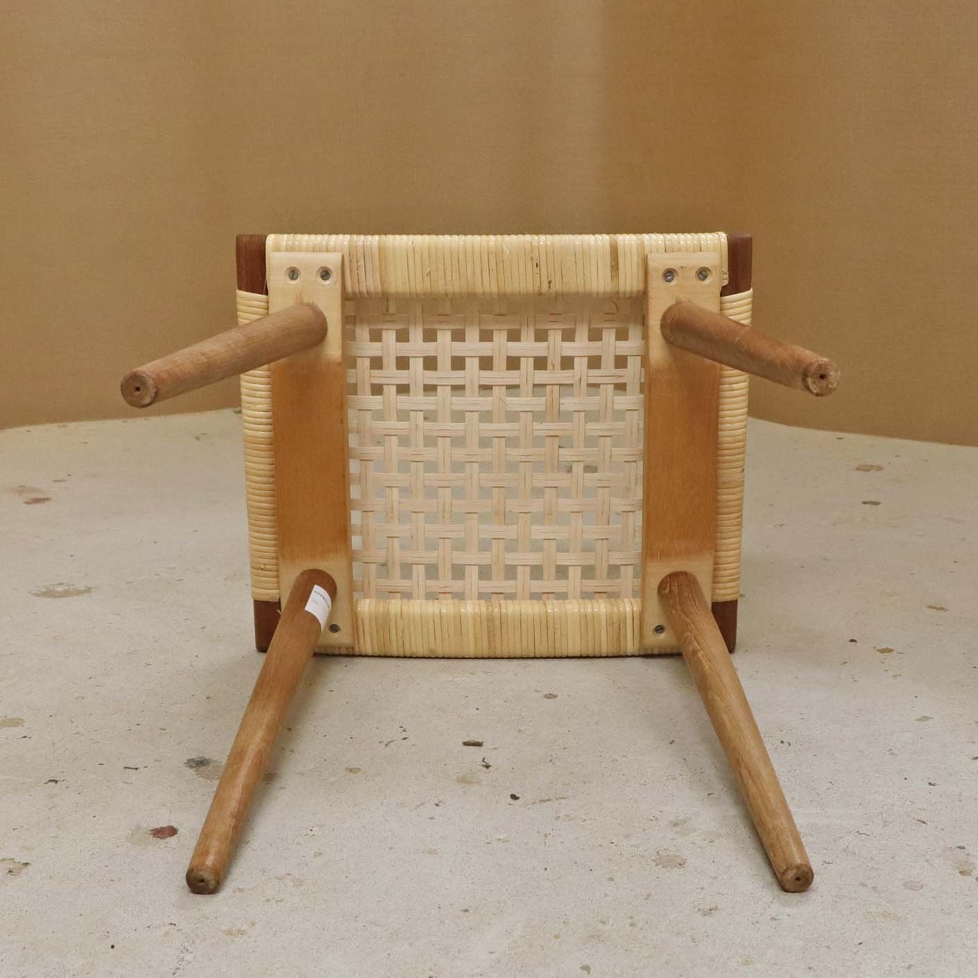 Lille skammel med stel i teaktræ og sæde i ny rørflettet bambus.Producent ukendt