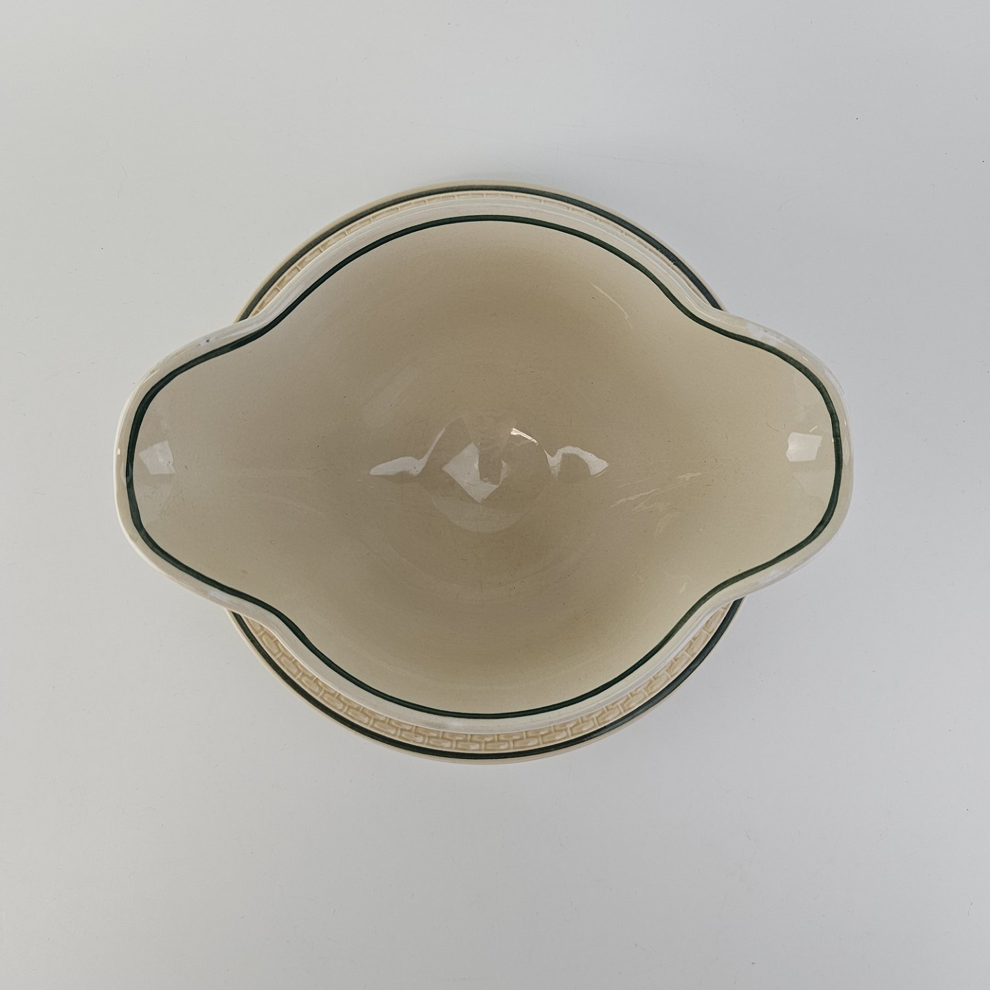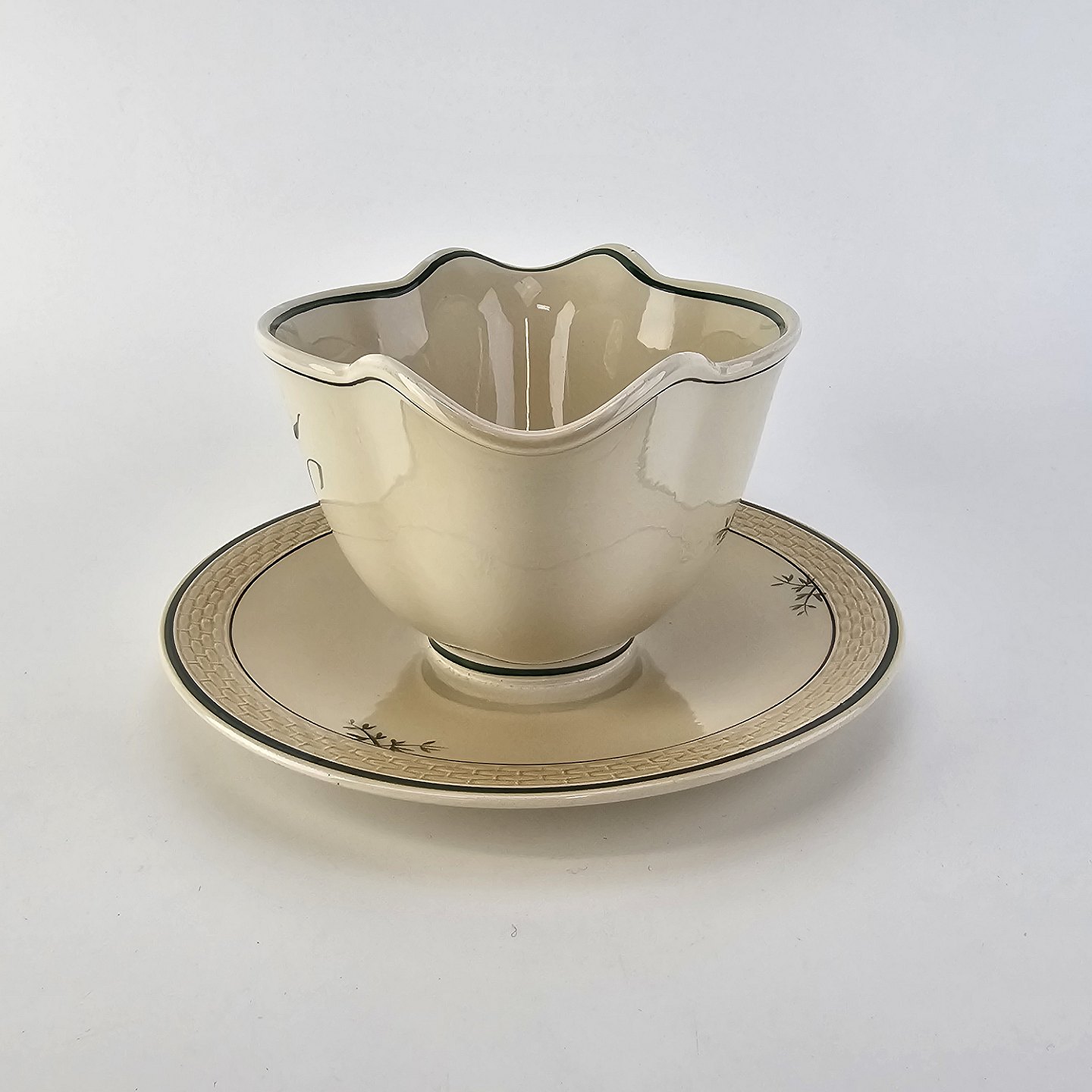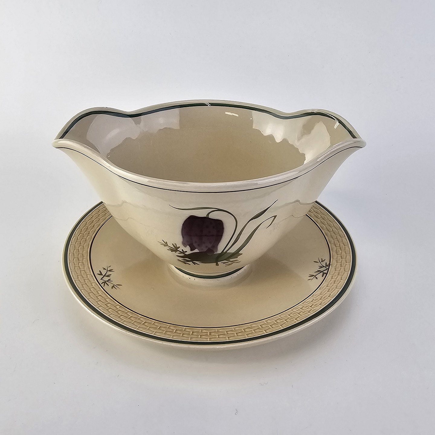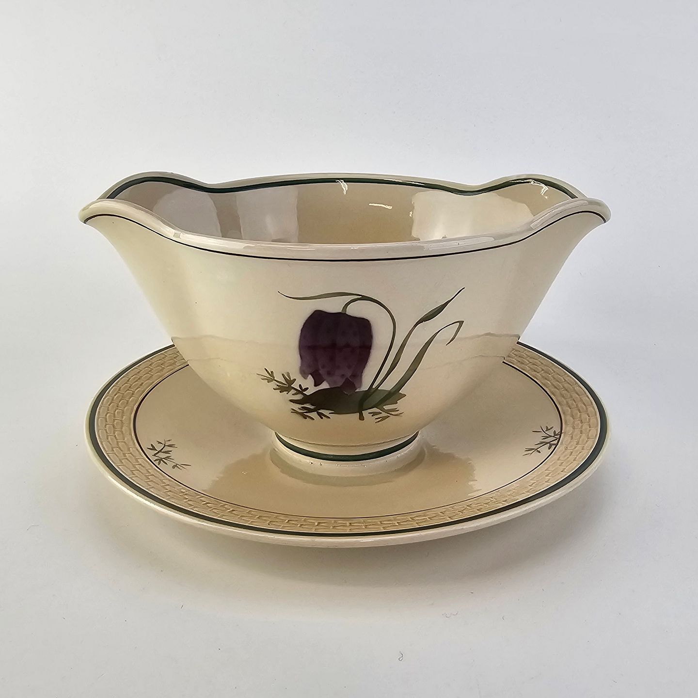Fajancestel i stelform Viktoria II (Fletværk) med flettet kant og dekoration af en vibeæg blomst i violet og grøn, fremstillet i perioden 1934-1967
