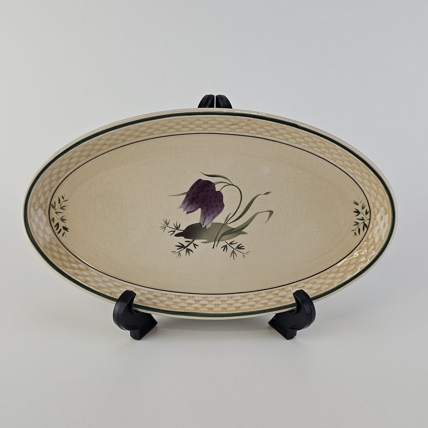 Fajancestel i stelform Viktoria II (Fletværk) med flettet kant og dekoration af en vibeæg blomst i violet og grøn, fremstillet i perioden 1934-1967