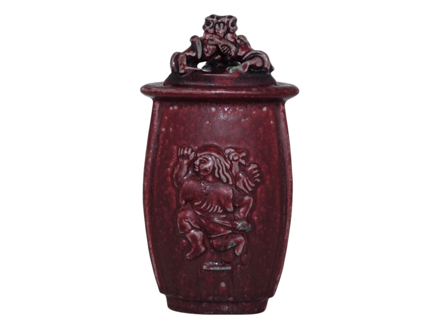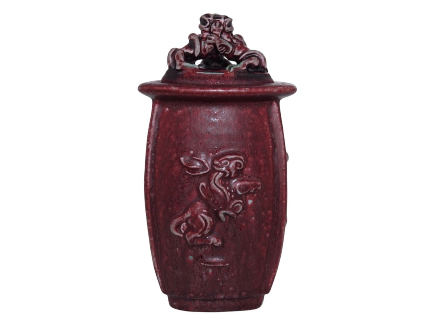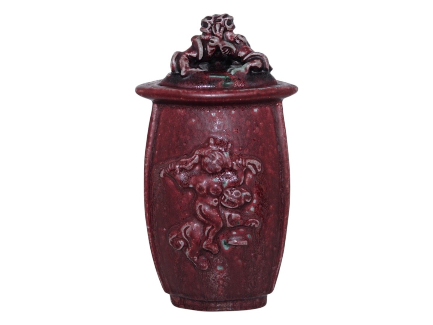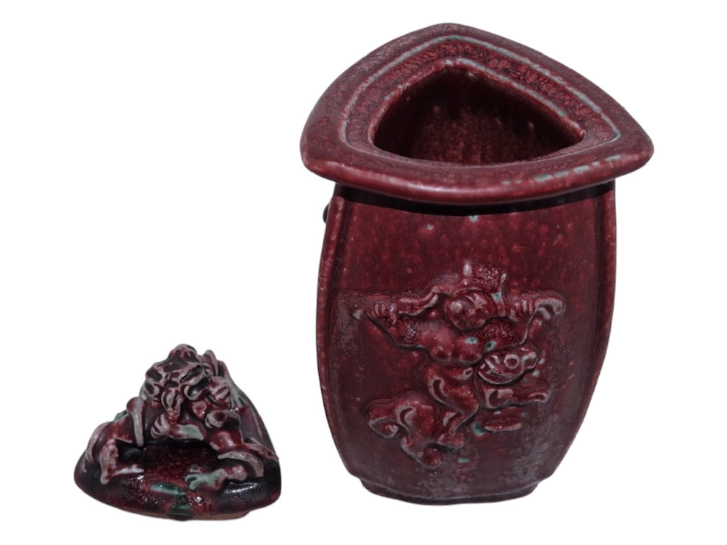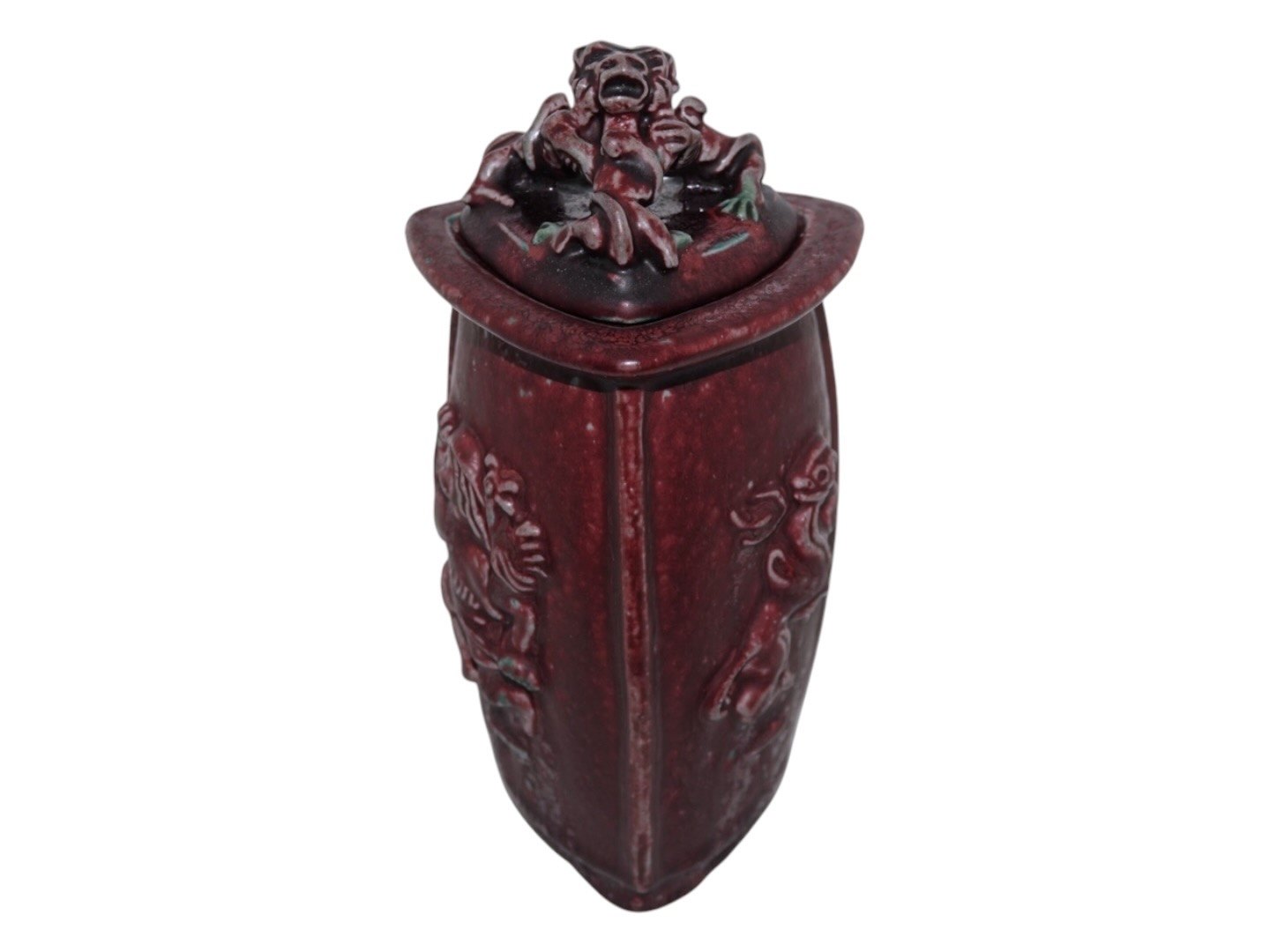 Royal Copenhagen keramik med rød okseblodsglasur, trekantet vase med låg udført og signeret af Bode Willumsen.Dekorationsnummer 20160.
