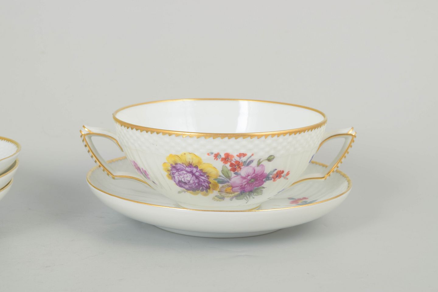 Sæt af fire bouillonkopper med tilhørende underkopper i porcelæn dekoreret med håndmalede blomster i saksisk blomst-mønster og afsluttet med forgyldt kant. Model 4/1872. 1. sortering.