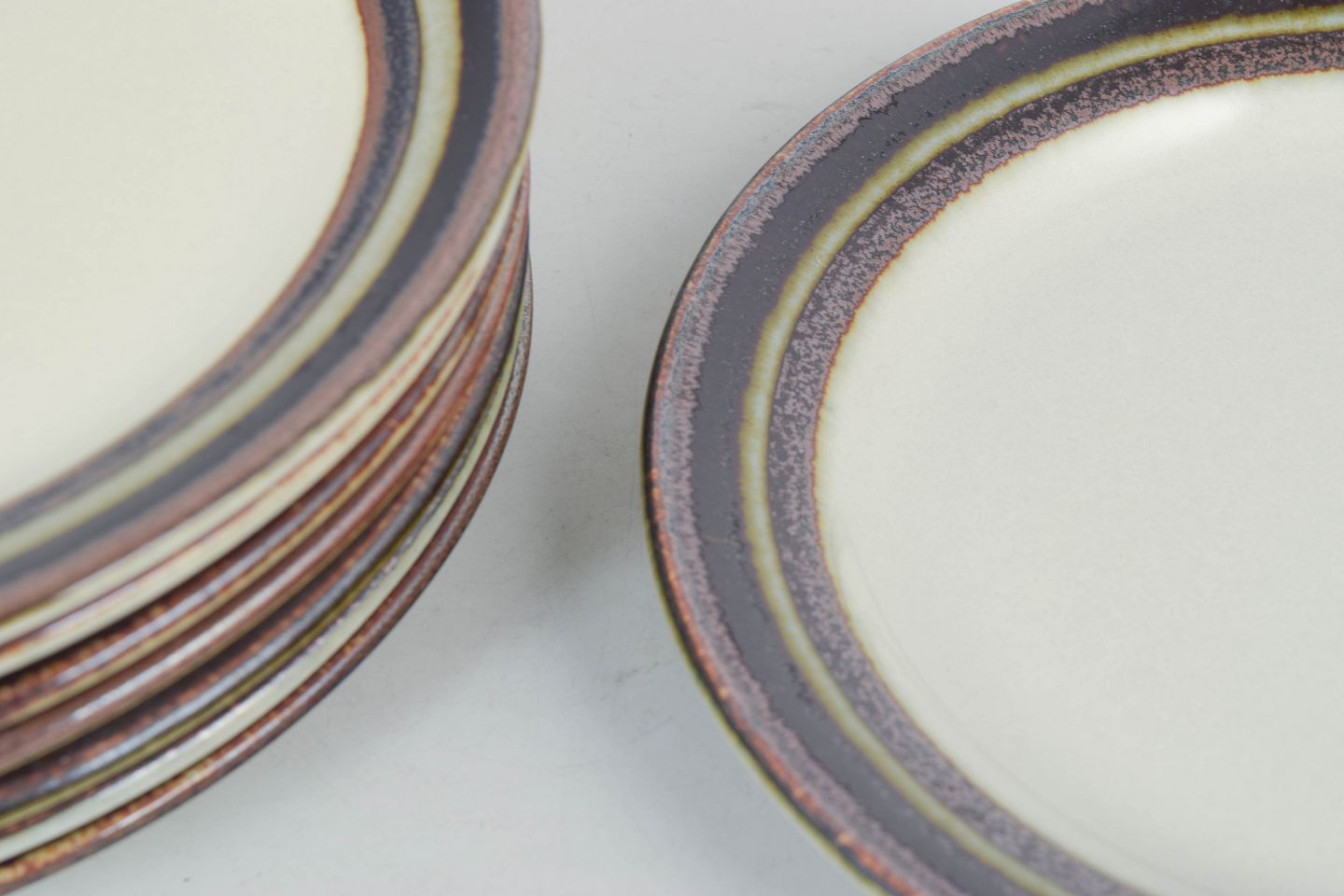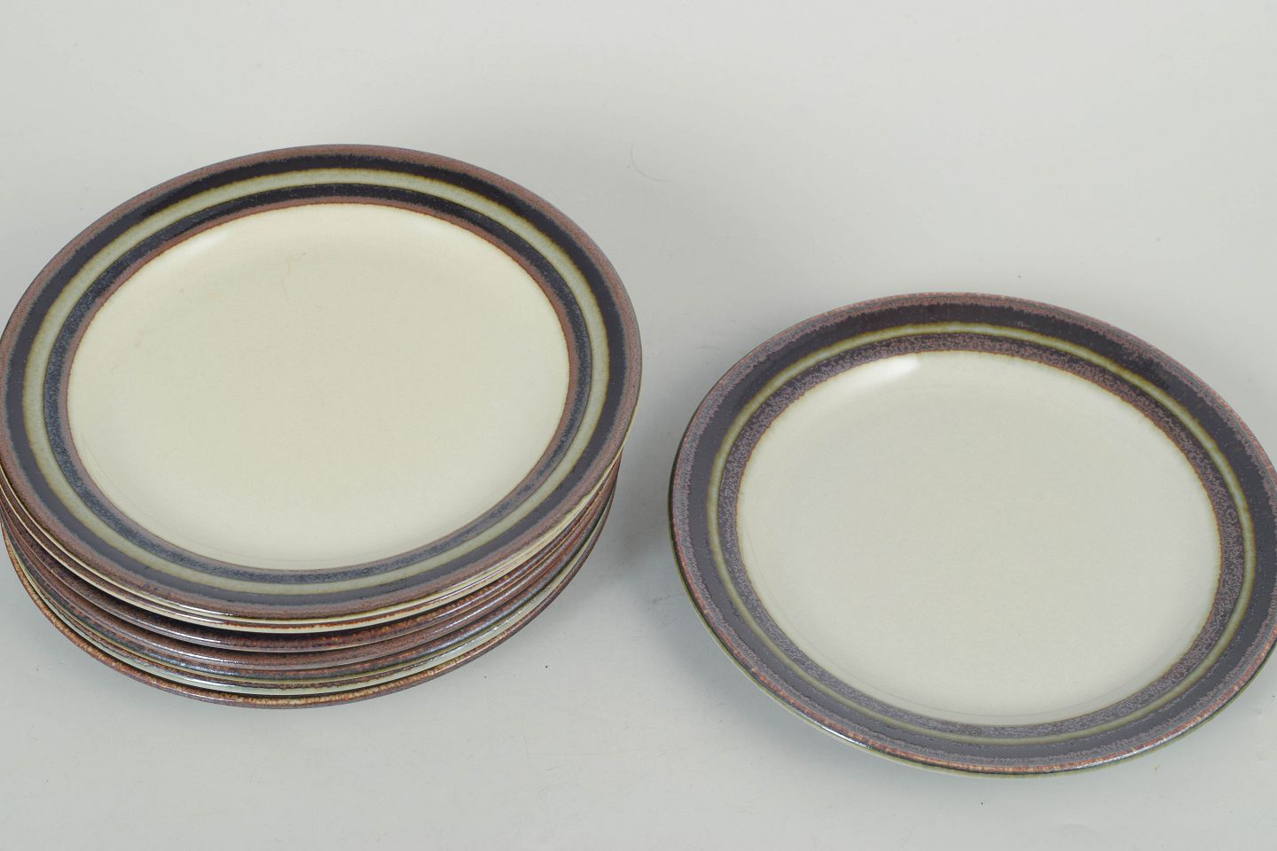 Arabia Karelia, sæt af otte tallerkener.Klassiske tallerkener i stentøj med karakteristisk stribet kantdekoration i brune, grønne og mørke toner, model Karelia fra Arabia.