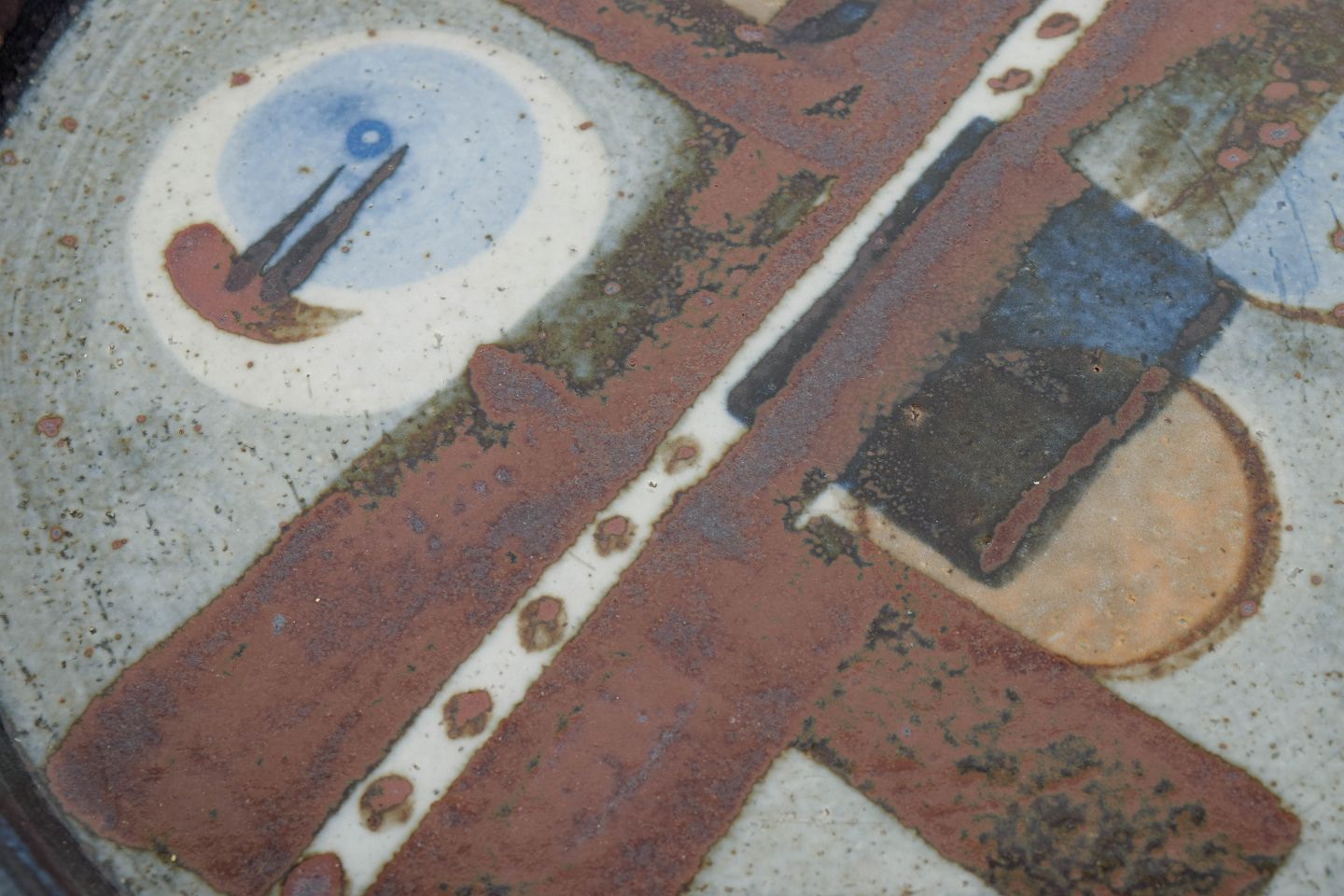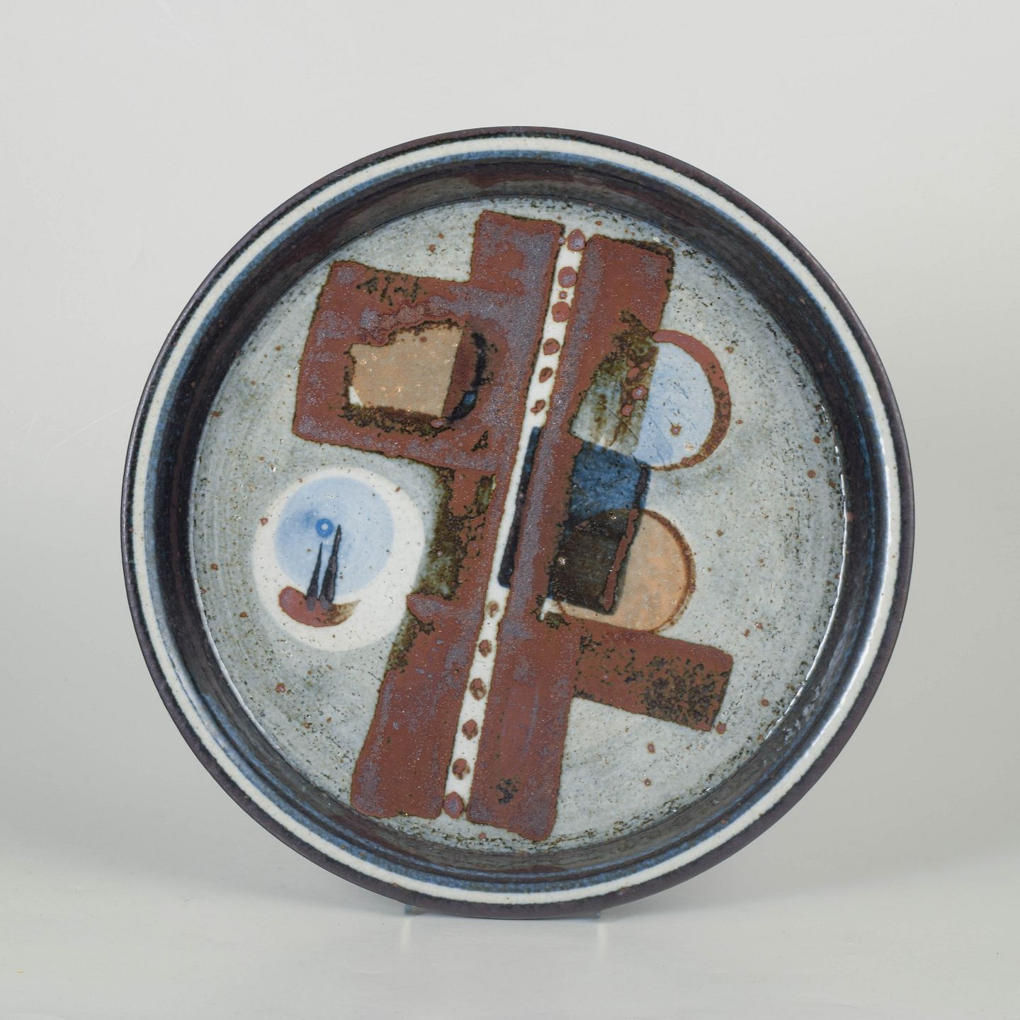 Carl-Harry Stålhane for Rörstrand, Drejar-gruppen fad.Stort rundt fad i stentøj med kunstnerisk dekoration i geometriske former og jordfarvede nuancer. Model Drejar-gruppen, fremstillet 1976.