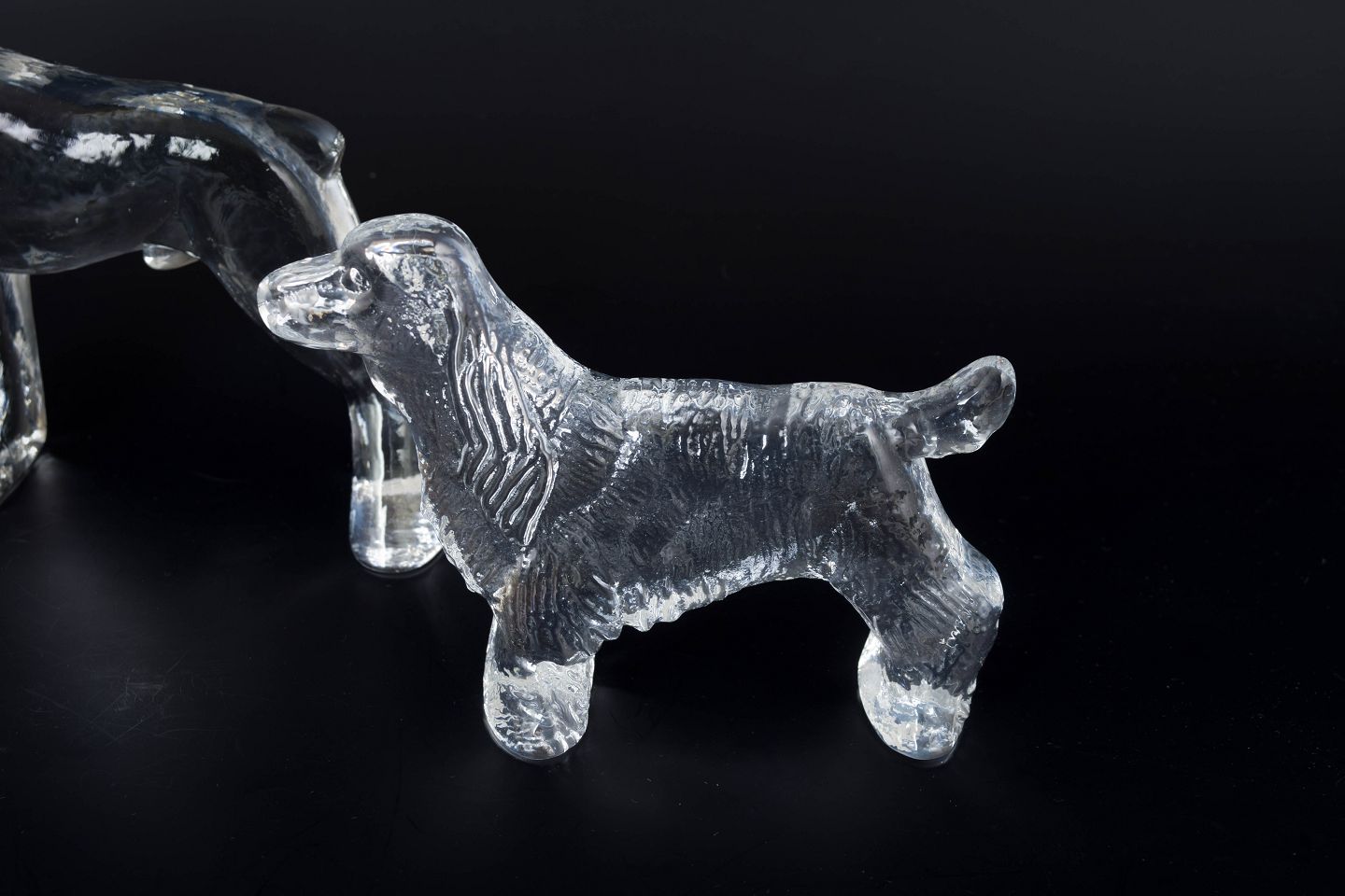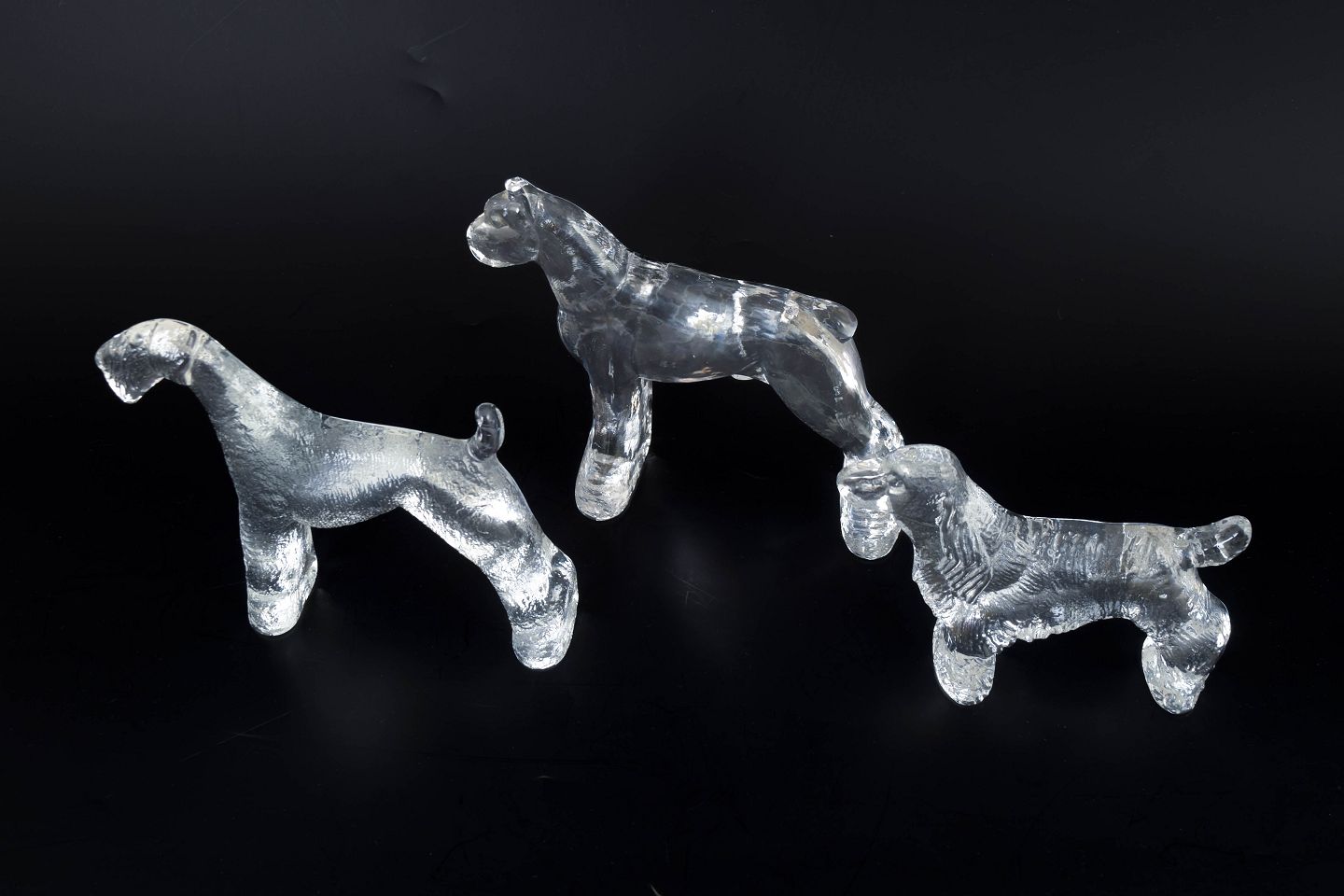 Bertil Vallien for Kosta Boda, sæt af tre glasfigurer “Kennel”.Dekorative glasfigurer udført i klart presset glas med struktureret overflade, forestillende tre hunde i forskellige positurer. Model “Kennel” fra Kosta Boda.