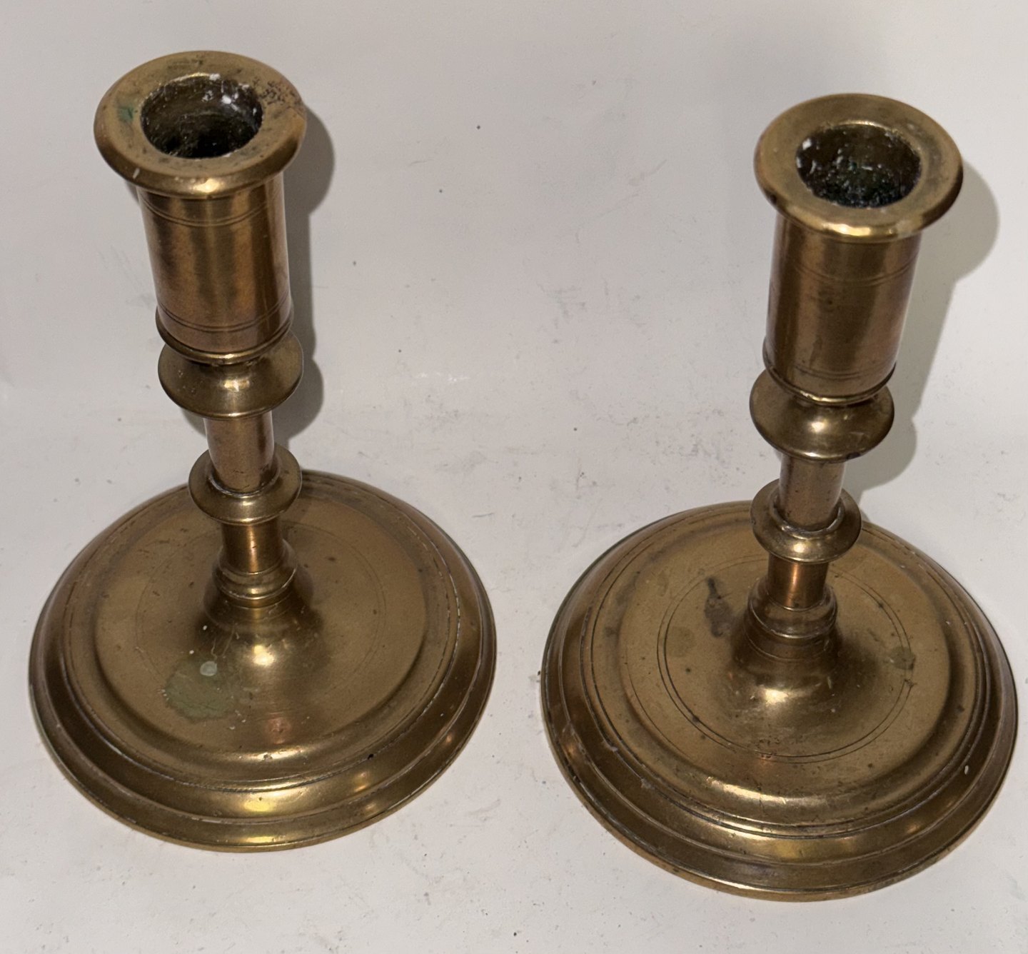Par lysestager i barok-stil. Formodes at være fremstillet i første halvdel af 1700-tallet. Fremstår i god stand. Den ene stage er loddet. På den anden er det muligt at skrue “piben” af foden. H. 15,3 cm
