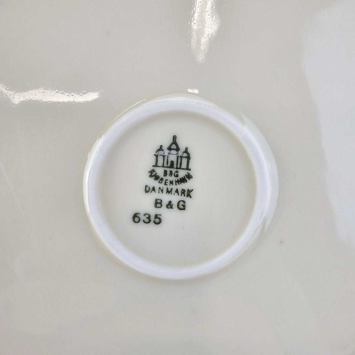 Rundt fad med hanke af porcelæn fra stellet Prik 25Producent Bing & Grøndahl