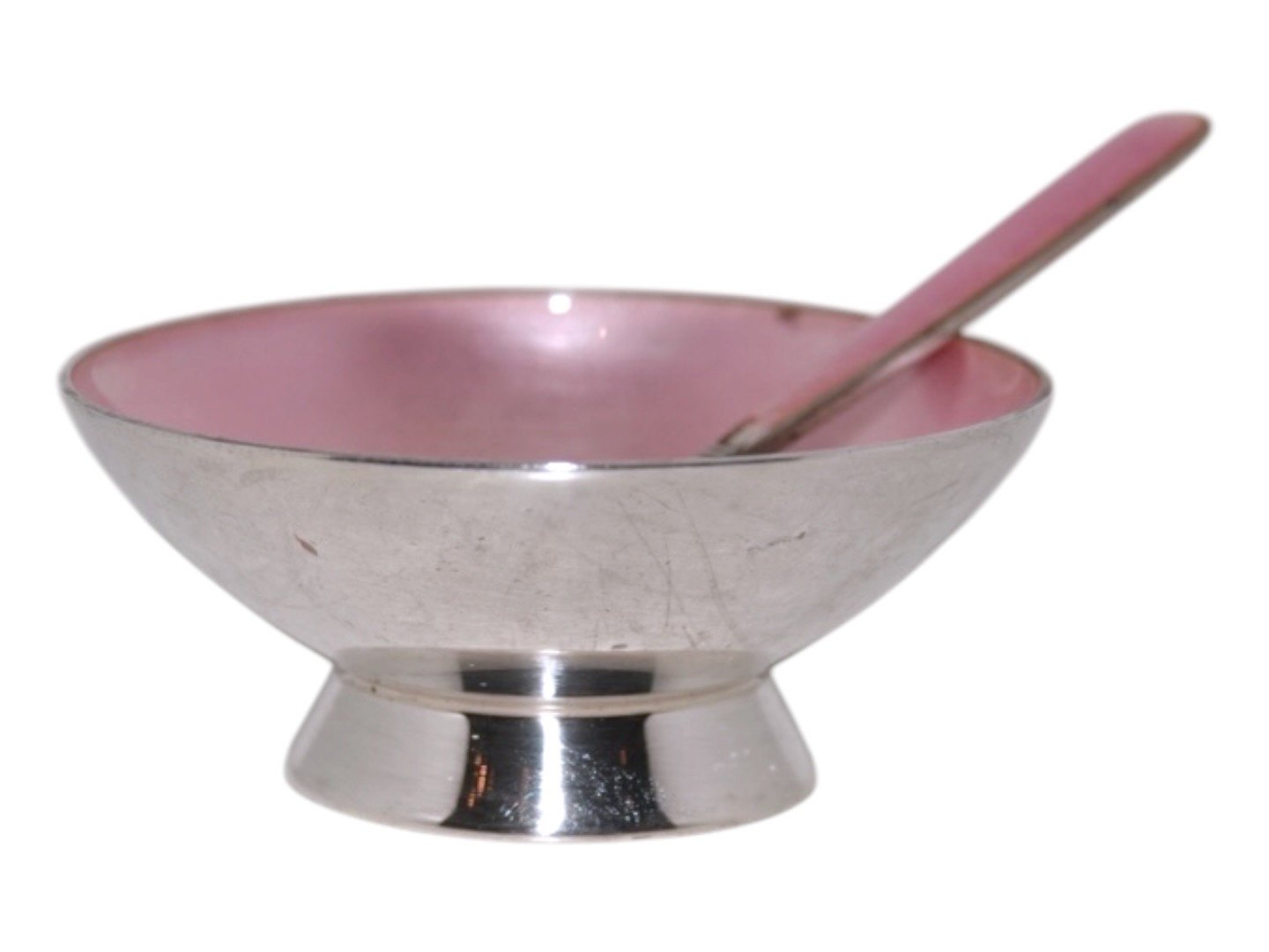 Lille rundt saltkar med tilhørende saltske med lyserød emalje.