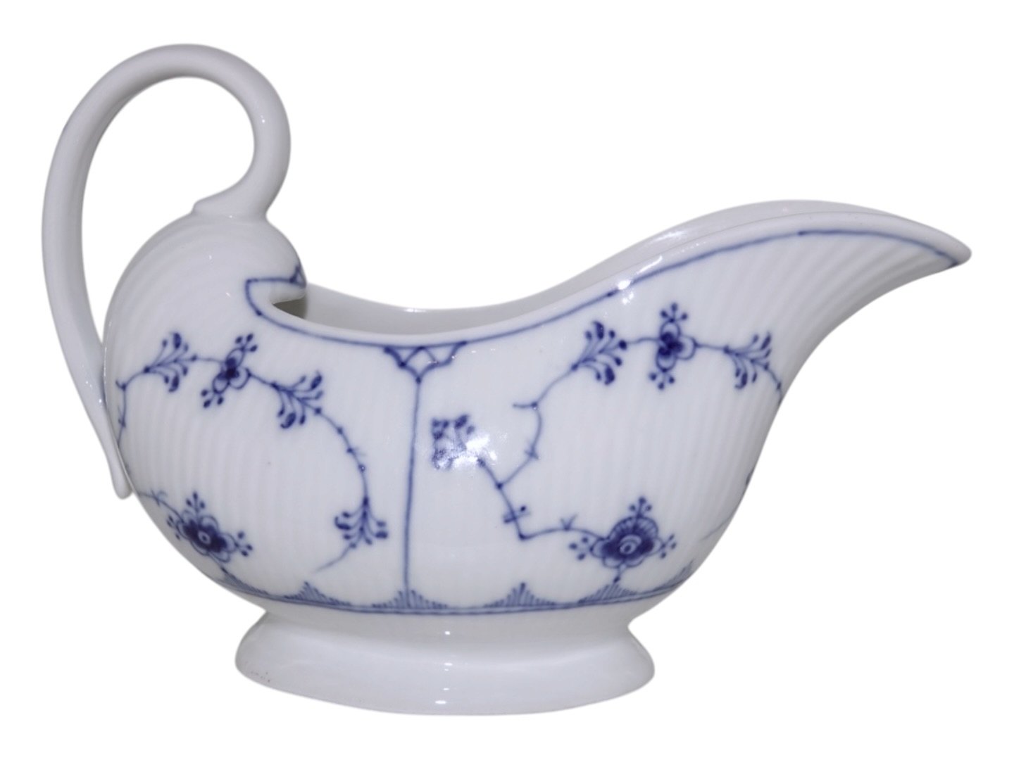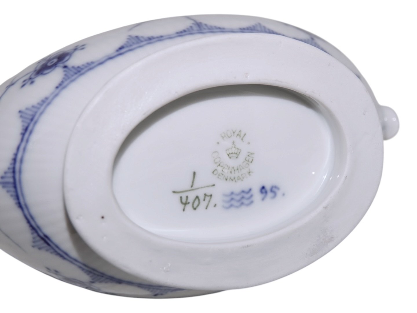 Royal Copenhagen Musselmalet Riflet, sjældent set sovsekande.Af fabriksmærket ses det, at denne er produceret mellem 1923 og 1928.