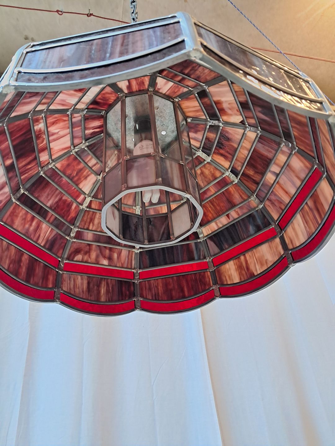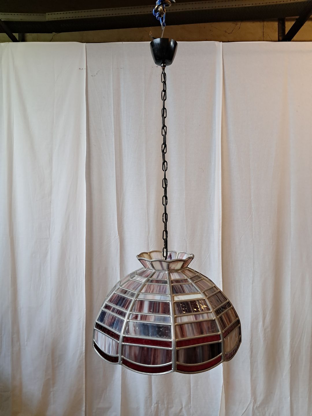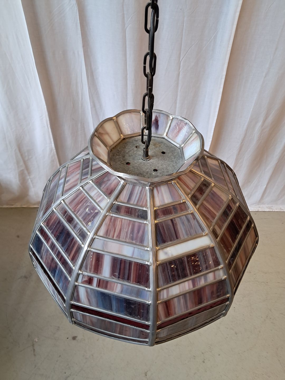 Tiffany loftlampe i glas og metal, fra 1980erne.Den har brugsspor.