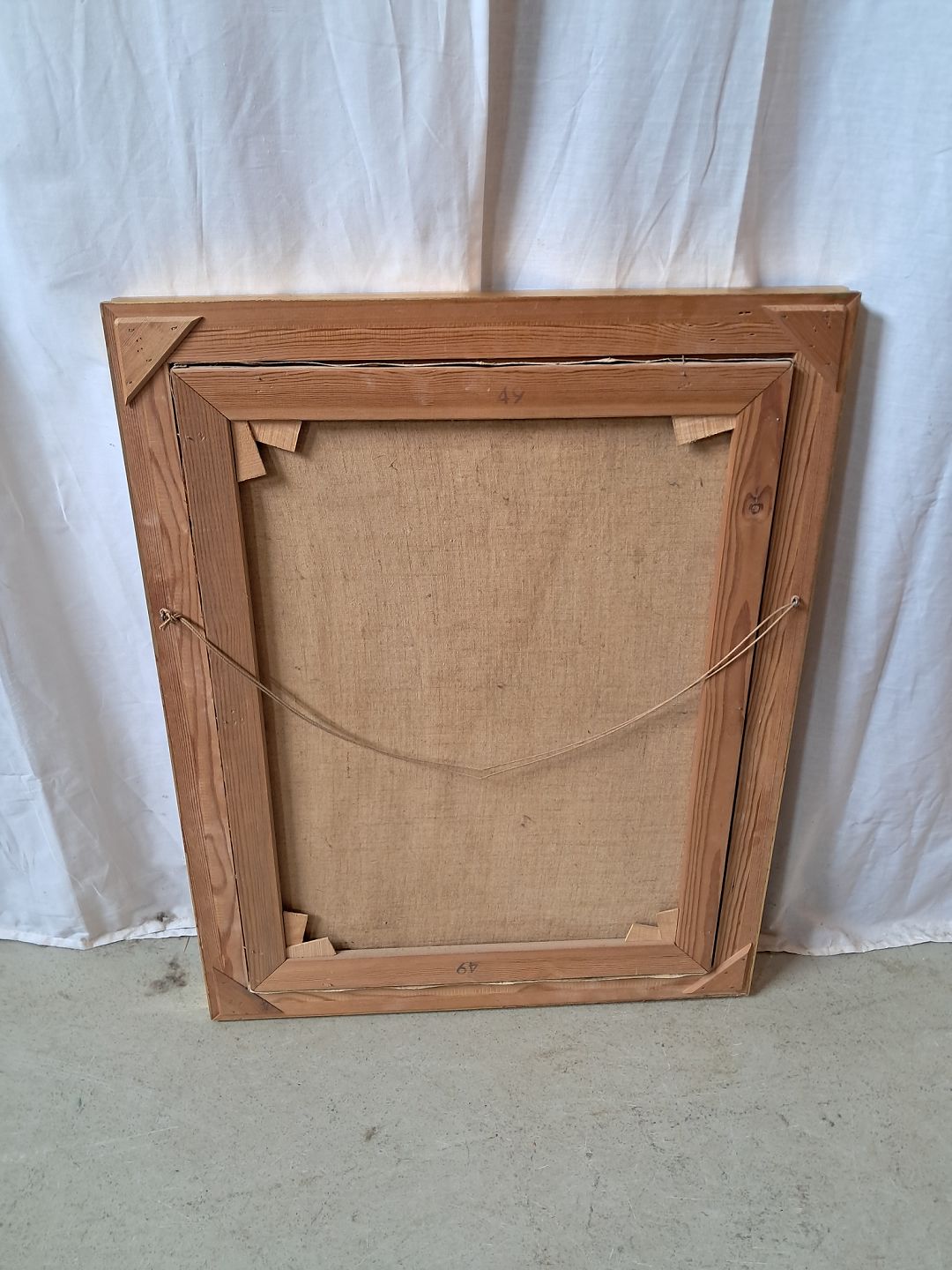 Maleri af Nikolaj kirke i guldmalet ramme, fra 1950erne.Det har brugsspor.