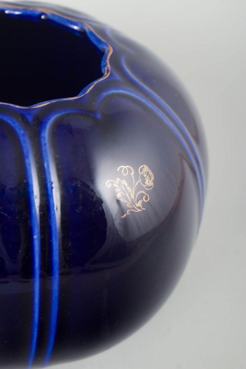 Rörstrand vase.Kugleformet vase i porcelæn med dyb koboltblå glasur, dekoreret med lodrette linjer og guldkant ved foden.