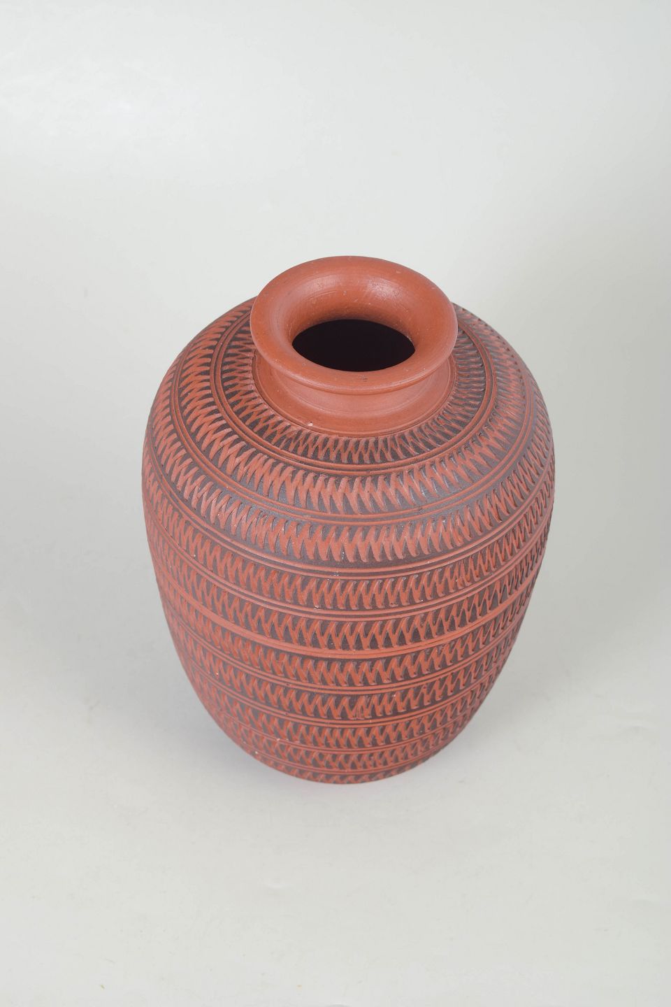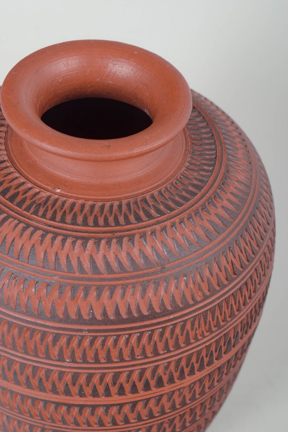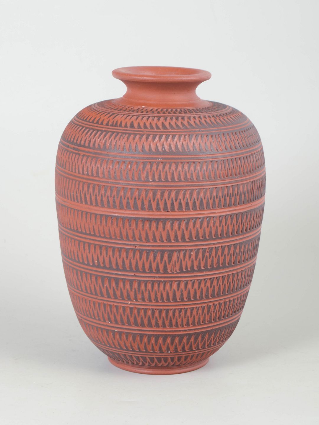 Dansk terrakotta vase fra 1930’erne.Dekorativ vase i rødbrændt terrakotta med fint indridset og gentaget geometrisk mønster i horisontale bånd. Formen er klassisk med let udsvajet hals og balusterformet krop. Mærket under bunden, men utydeligt.