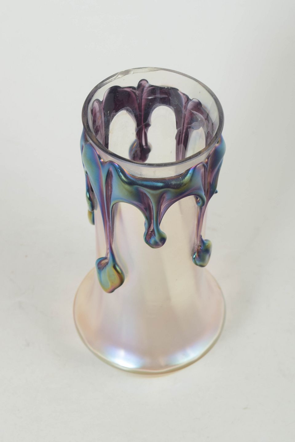 Lötz Østrig, vase.Balusterformet vase i mundblæst glas med matteret, iriserende overflade og kraftigt pålagt glas i flerfarvede, flydende former ned langs halsen.