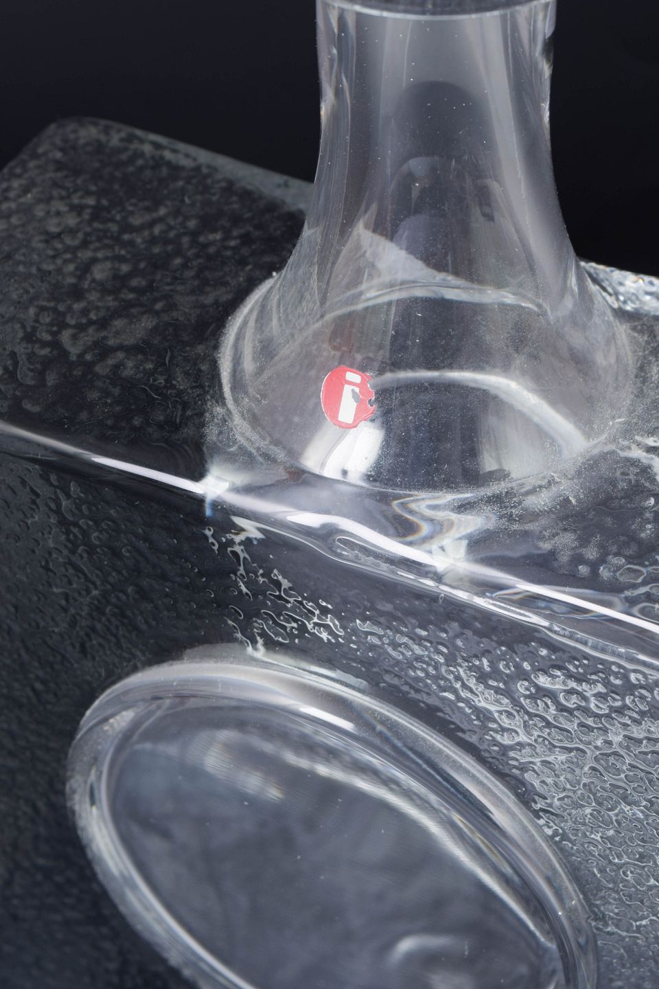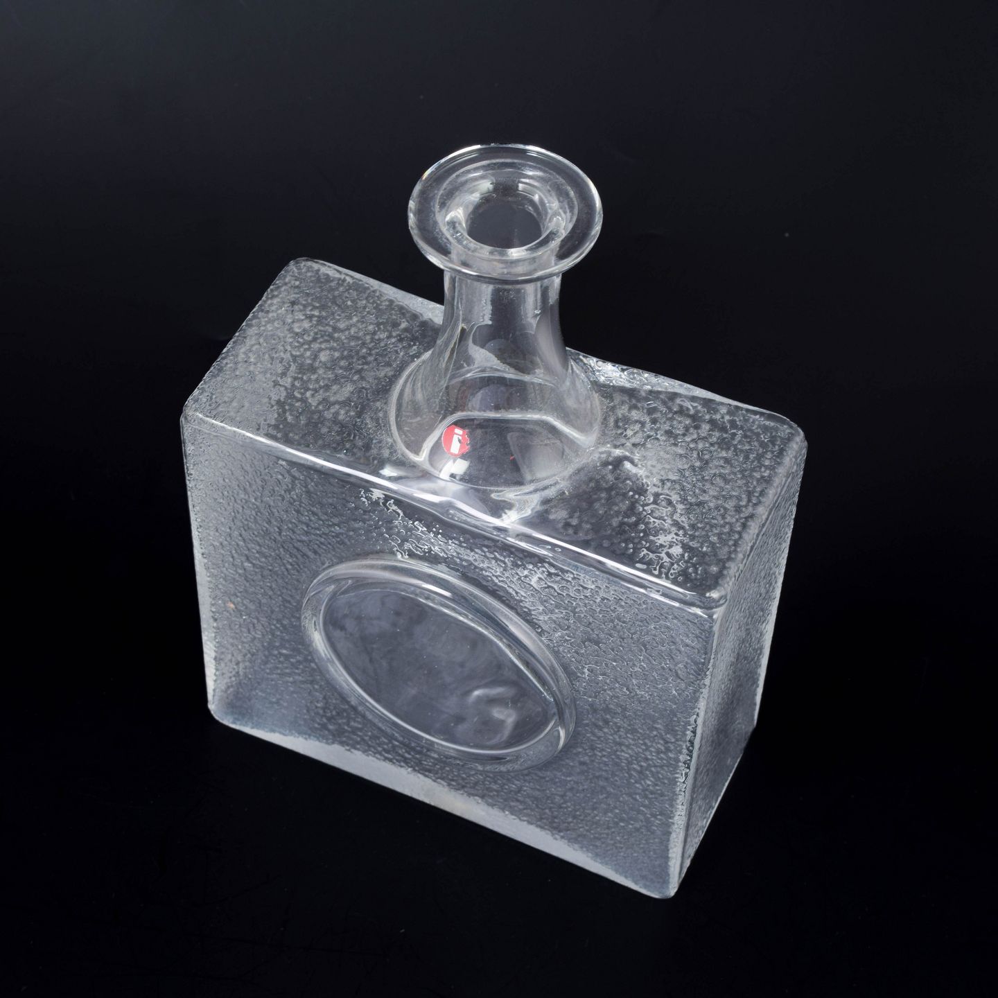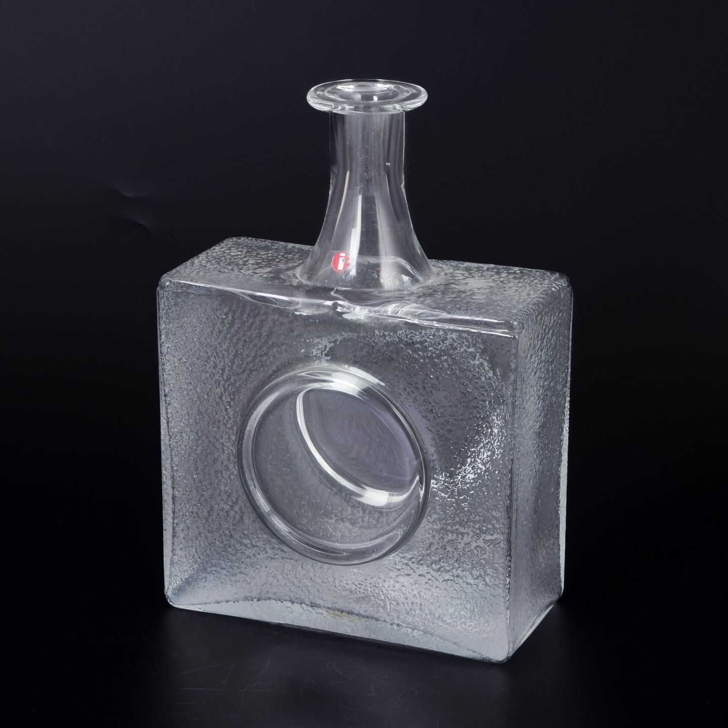 Tapio Wirkkala for Iittala, glasflaske.Kraftig kvadratisk glasflaske med integreret rund fordybning på fronten og kort hals. Udført i klart glas med let rå struktur på siderne. Original producentmærkat bevaret.