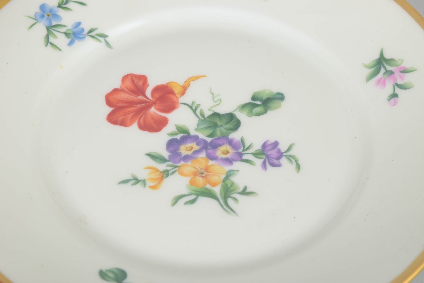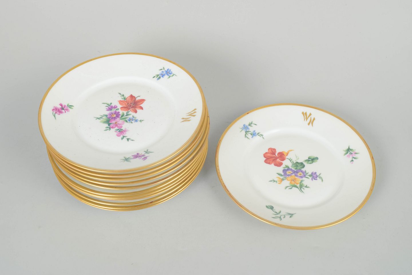 Rosenthal sæt af tolv tallerkener.Elegant sæt af tolv porcelænstallerkener med polykrom blomsterdekoration og forgyldt kant, produceret af Rosenthal i 1930’erne. Klassisk tysk porcelæn med raffineret håndværk og dekorativt udtryk. Privatdekoreret.