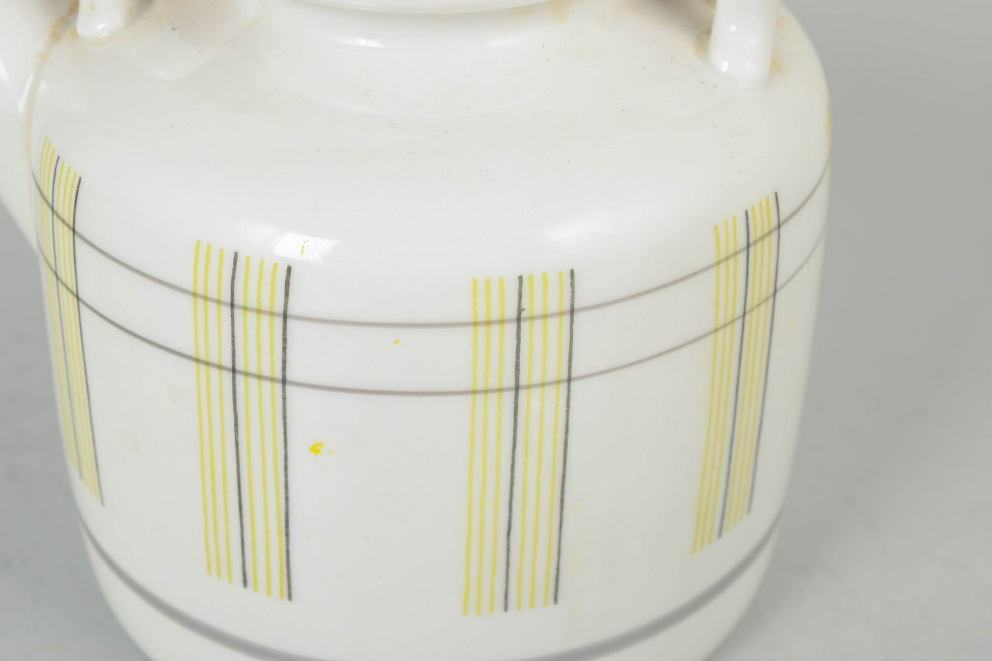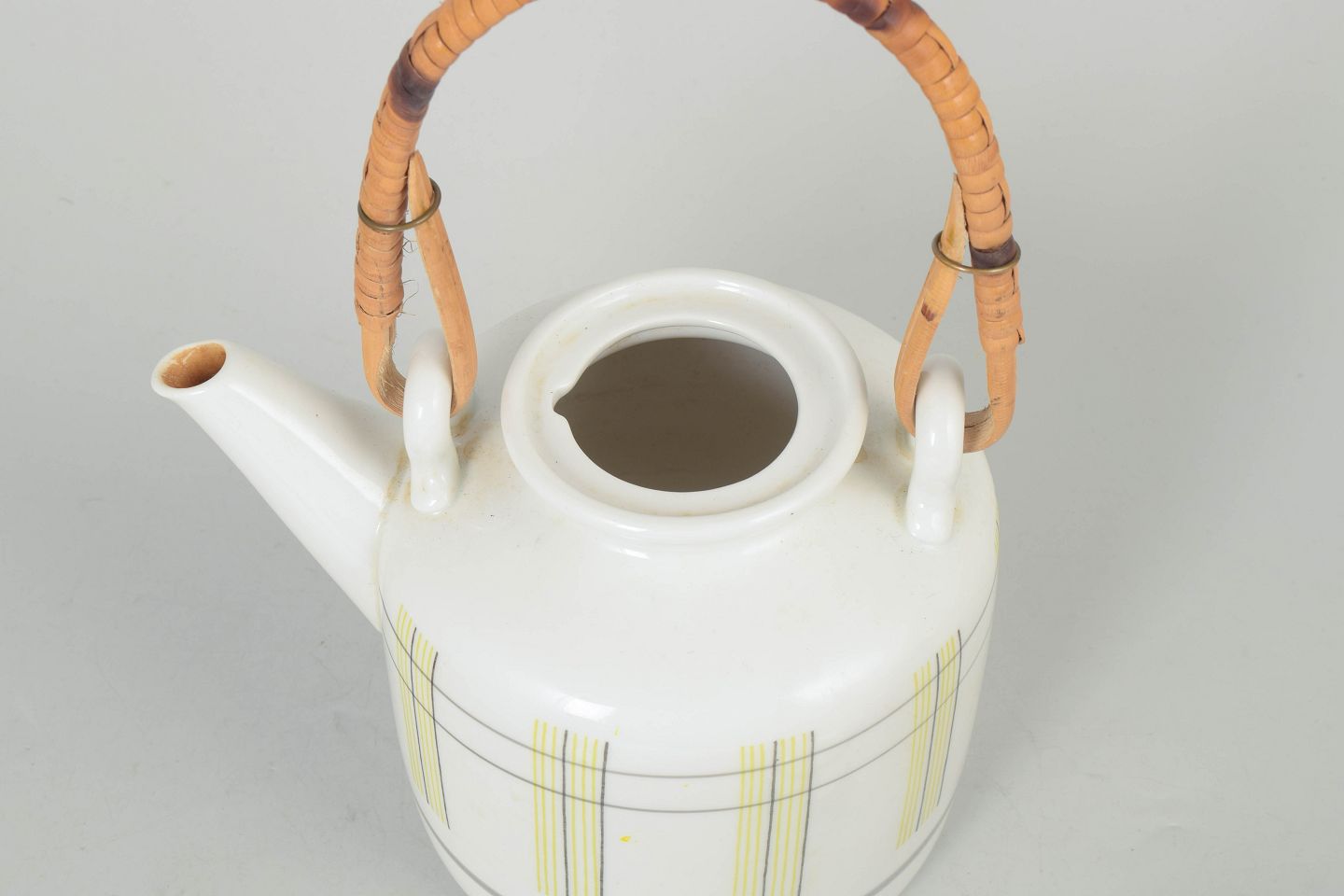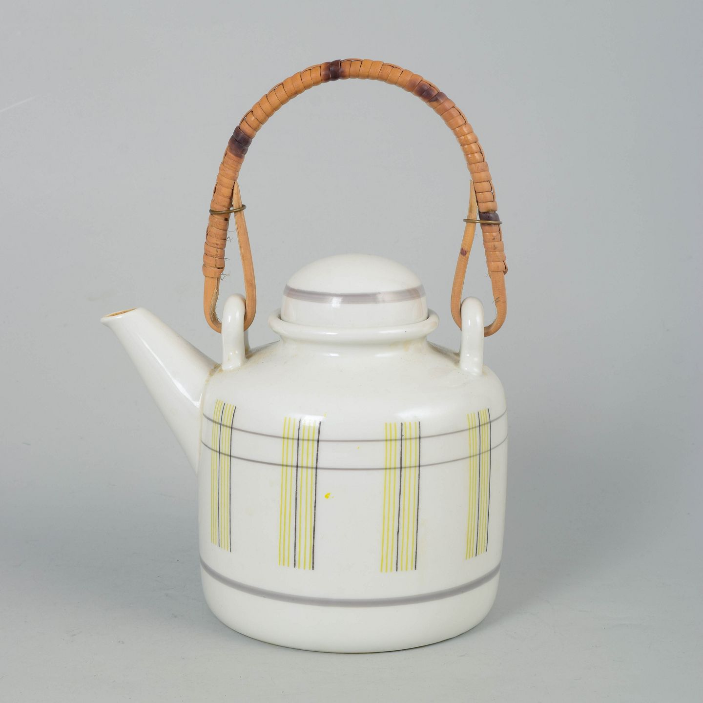 Rörstrand Swedish Grace tekande.Elegant tekande i porcelæn med karakteristisk cylindrisk form og grafisk dekoration i gule og grå linjer. Udstyret med buet hank i flettet rattan og låg med knop.