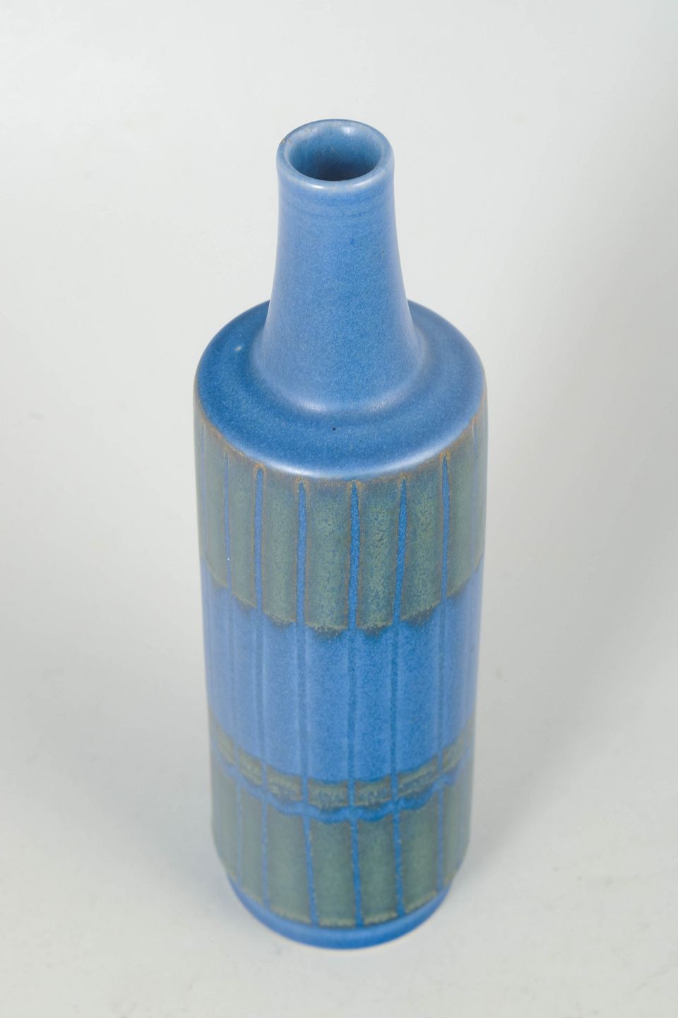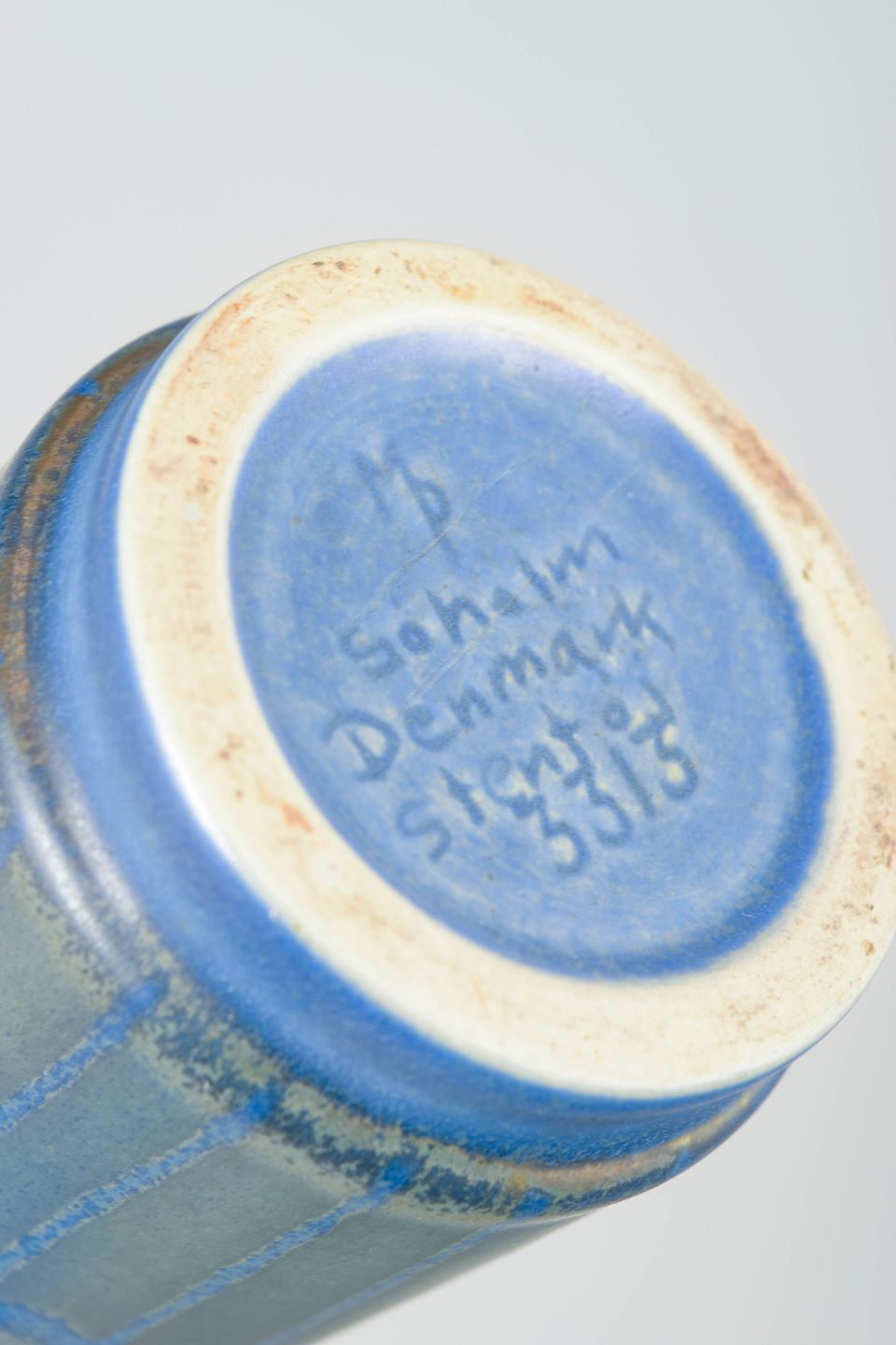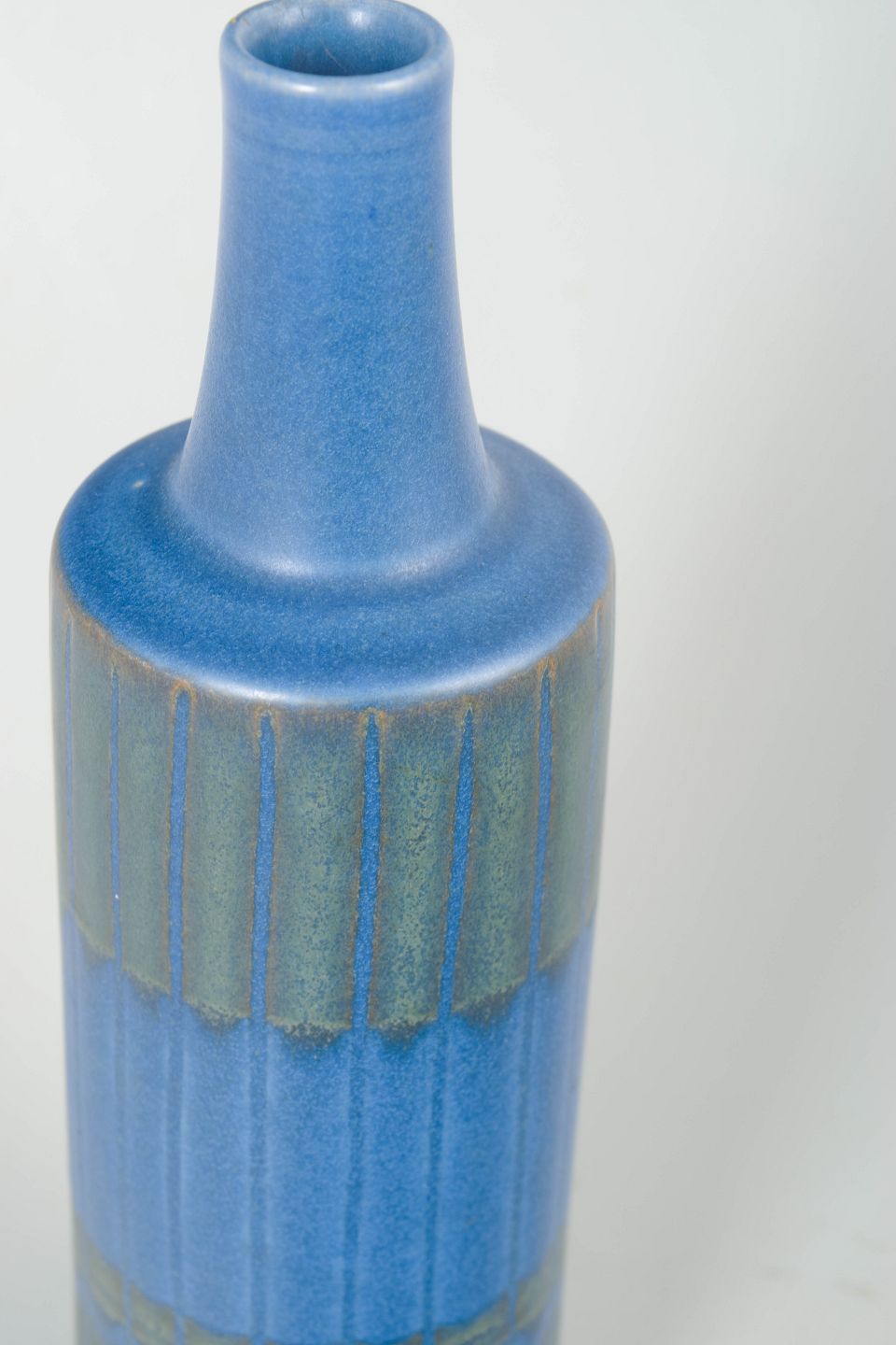 Maria Philippi for Søholm, vase.Slank cylinderformet vase i stentøj med lodrette rifler og blå glasur med grønne nuancer og dekorative bånd.