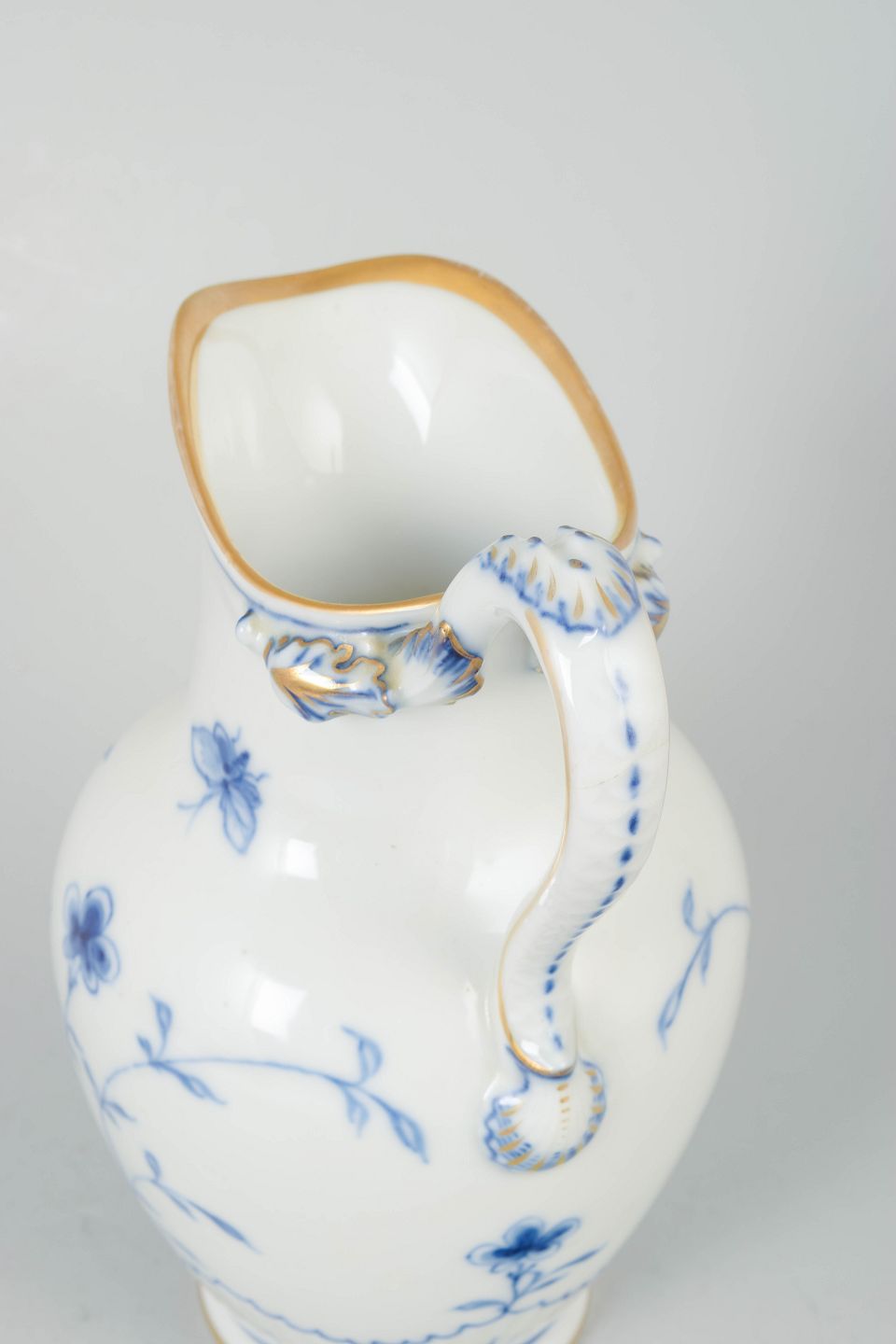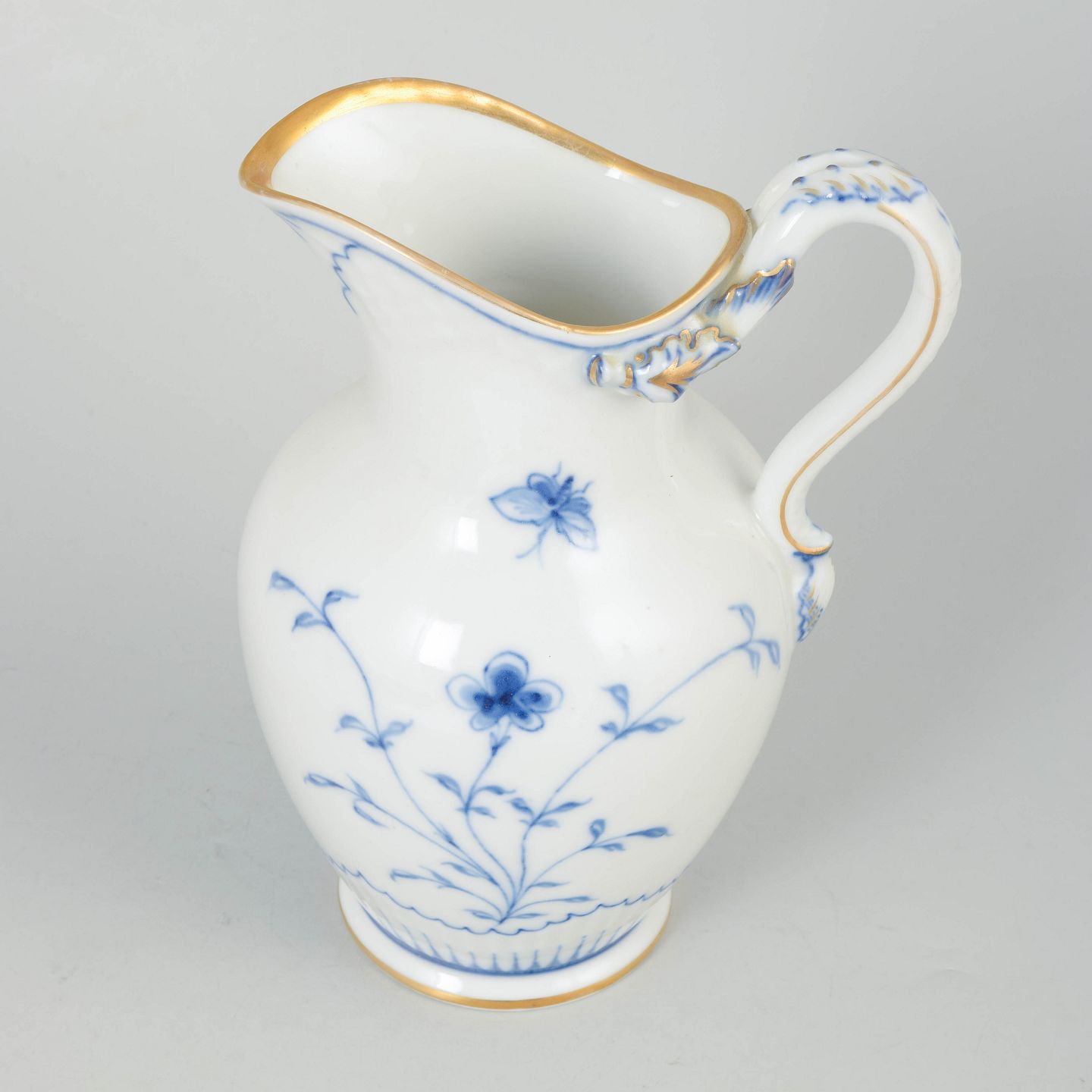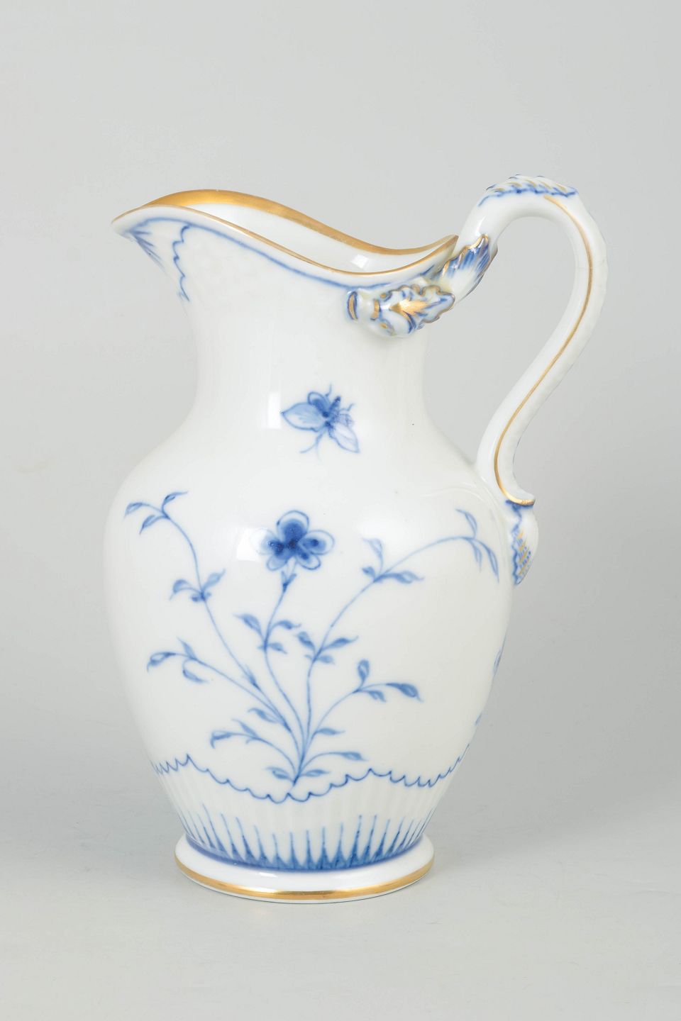 Elegant kande i porcelæn fra sommerfugl-serien med håndmalet dekoration i underglasurblå med stiliserede blomster og sommerfugl samt forgyldte detaljer langs kant og hank.