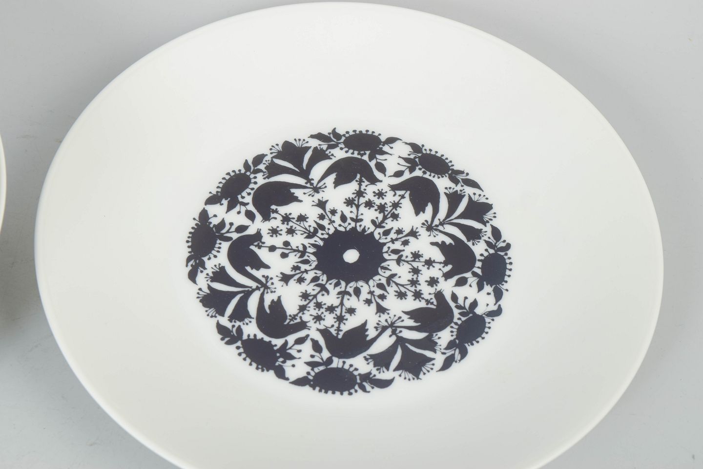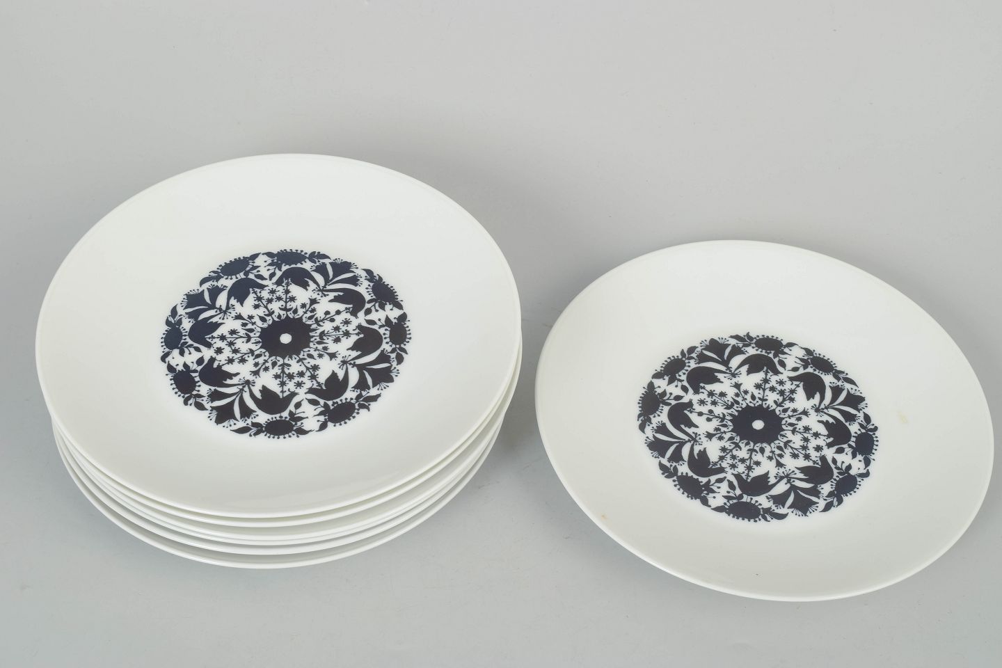Bjørn Wiinblad for Rosenthal, sæt af syv tallerkener.Tallerkener fra Hilton-serien i porcelæn med karakteristisk sort dekoration i midten på hvid bund.
