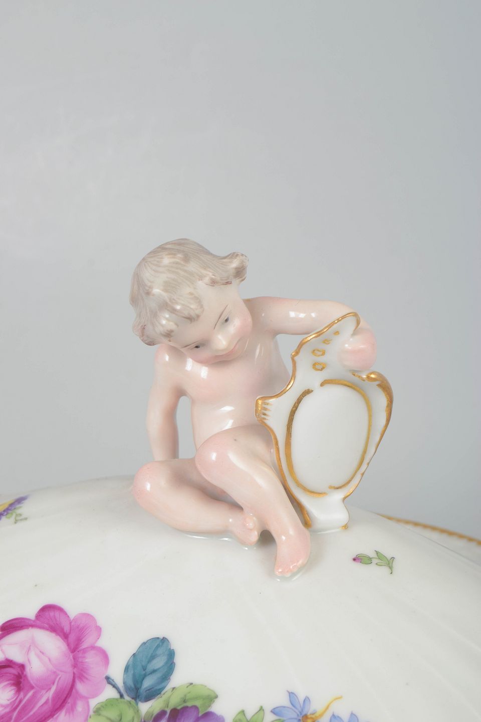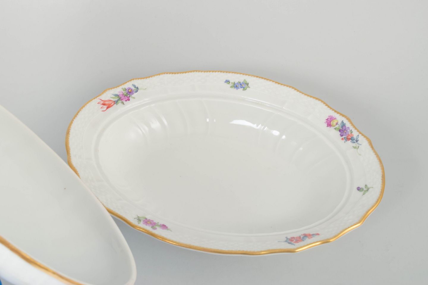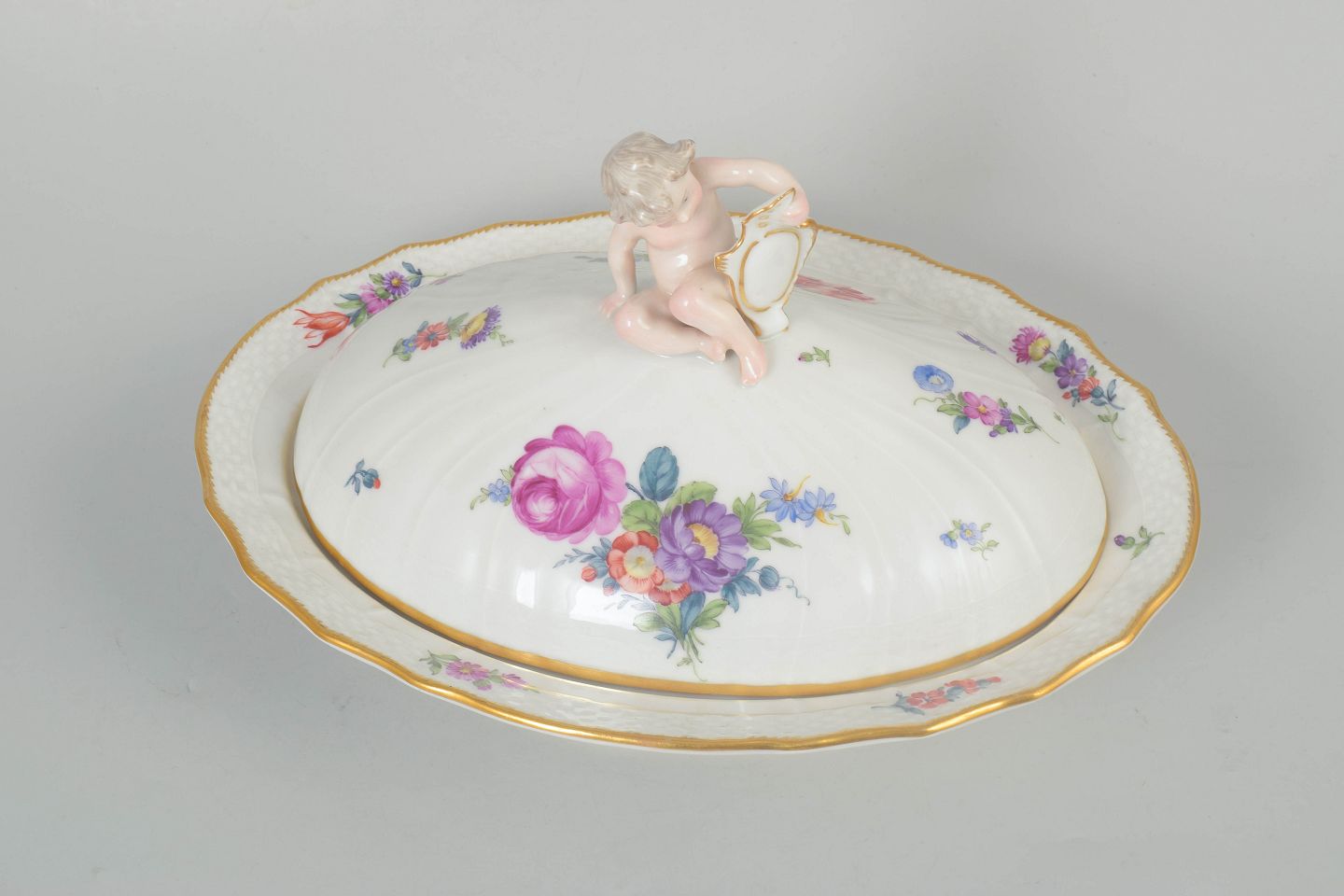 Royal Copenhagen saksisk blomst, stor lågskål.Stor oval lågskål i porcelæn med polykrom blomsterdekoration i saksisk blomst og guldkant. Låget afsluttet med knop formet som puttofigur. Model 4/1734.
