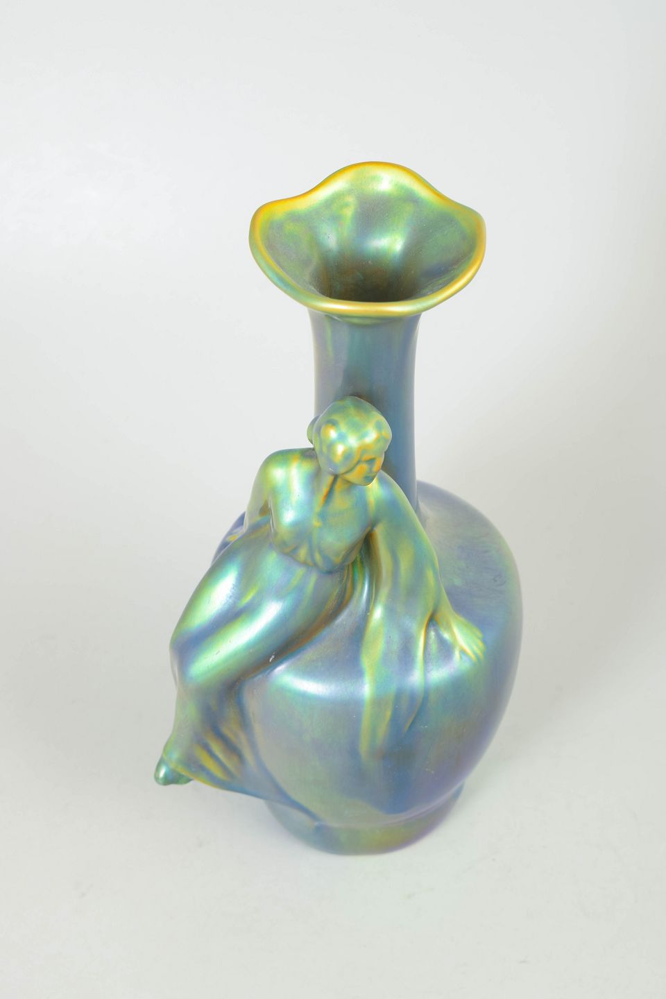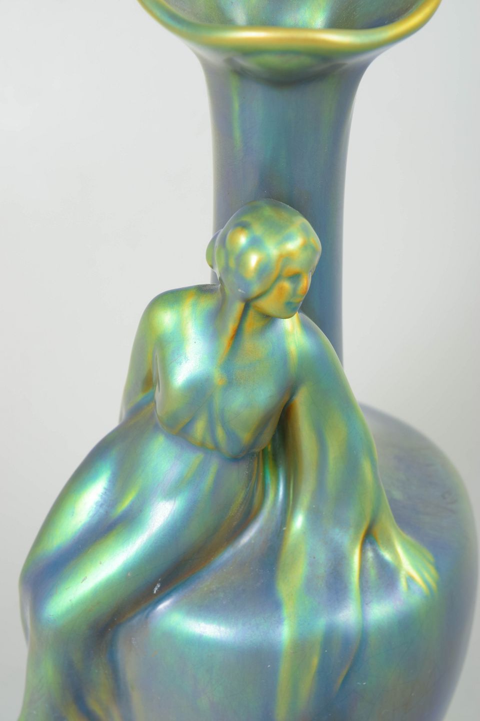 Zsolnay stor vase med figur, eosin glasur.Art nouveau vase med integreret kvindefigur i flydende, organisk form. Udført i karakteristisk iriserende eosin glasur med skiftende grønne, blå og gyldne nuancer.