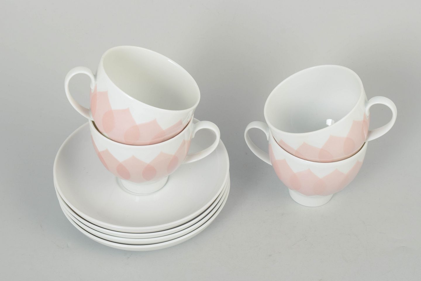 Sæt bestående af fire kaffekopper med matchende underkopper i porcelæn med rosa “Lotus” dekoration, udført med gentaget bladmotiv i bløde nuancer og et karakteristisk dekorativt udtryk.