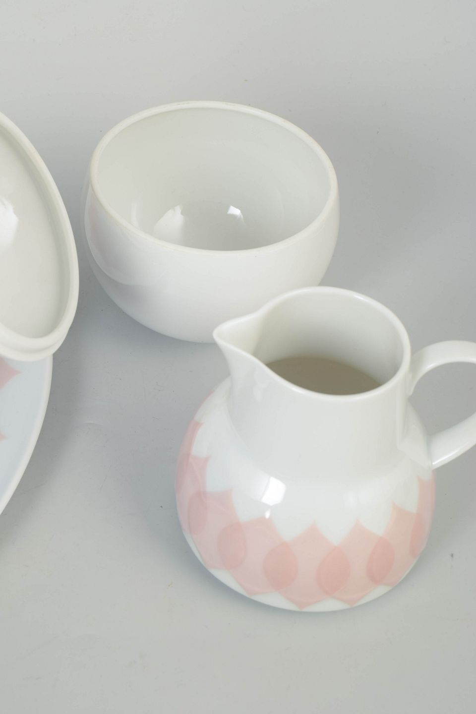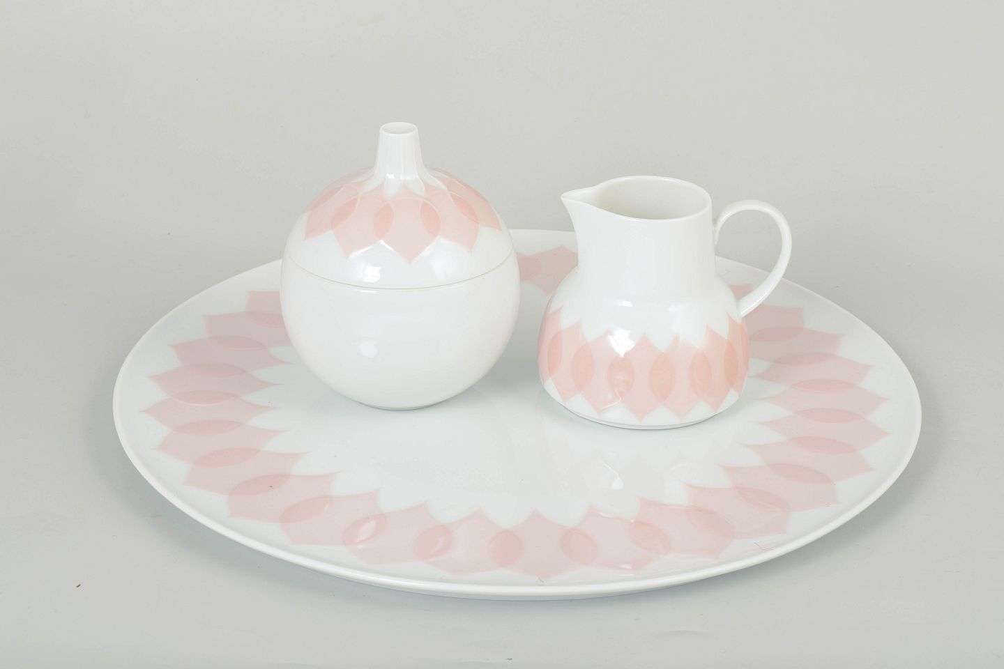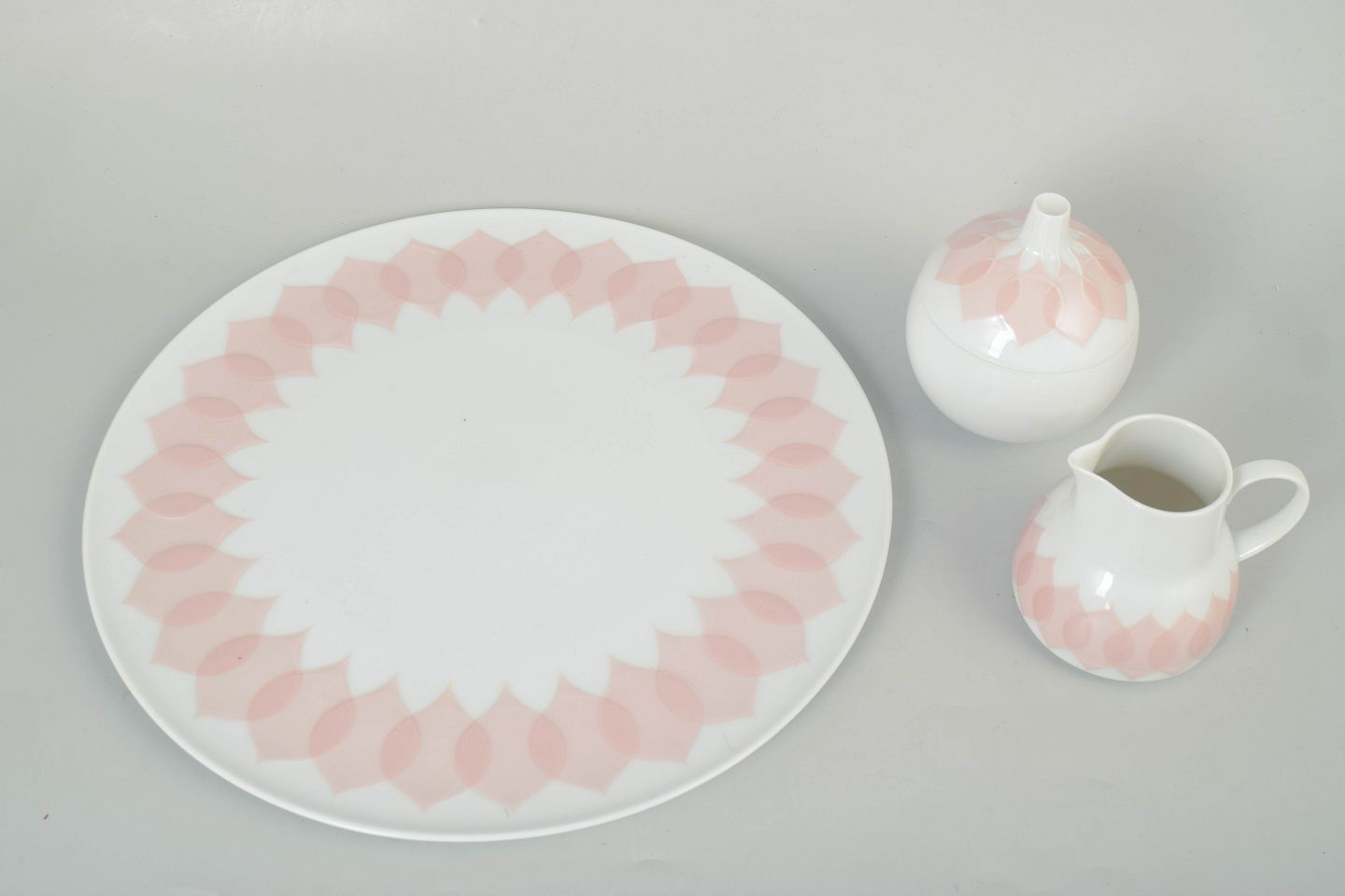 Bjørn Wiinblad for Rosenthal, sæt af tre serveringsdele.Sæt bestående af rundt serveringsfad samt sukkerskål og flødekande i porcelæn med rosa “Lotus” dekoration, kendetegnet ved et gentaget bladmotiv i bløde nuancer og dekorativ rytme.
