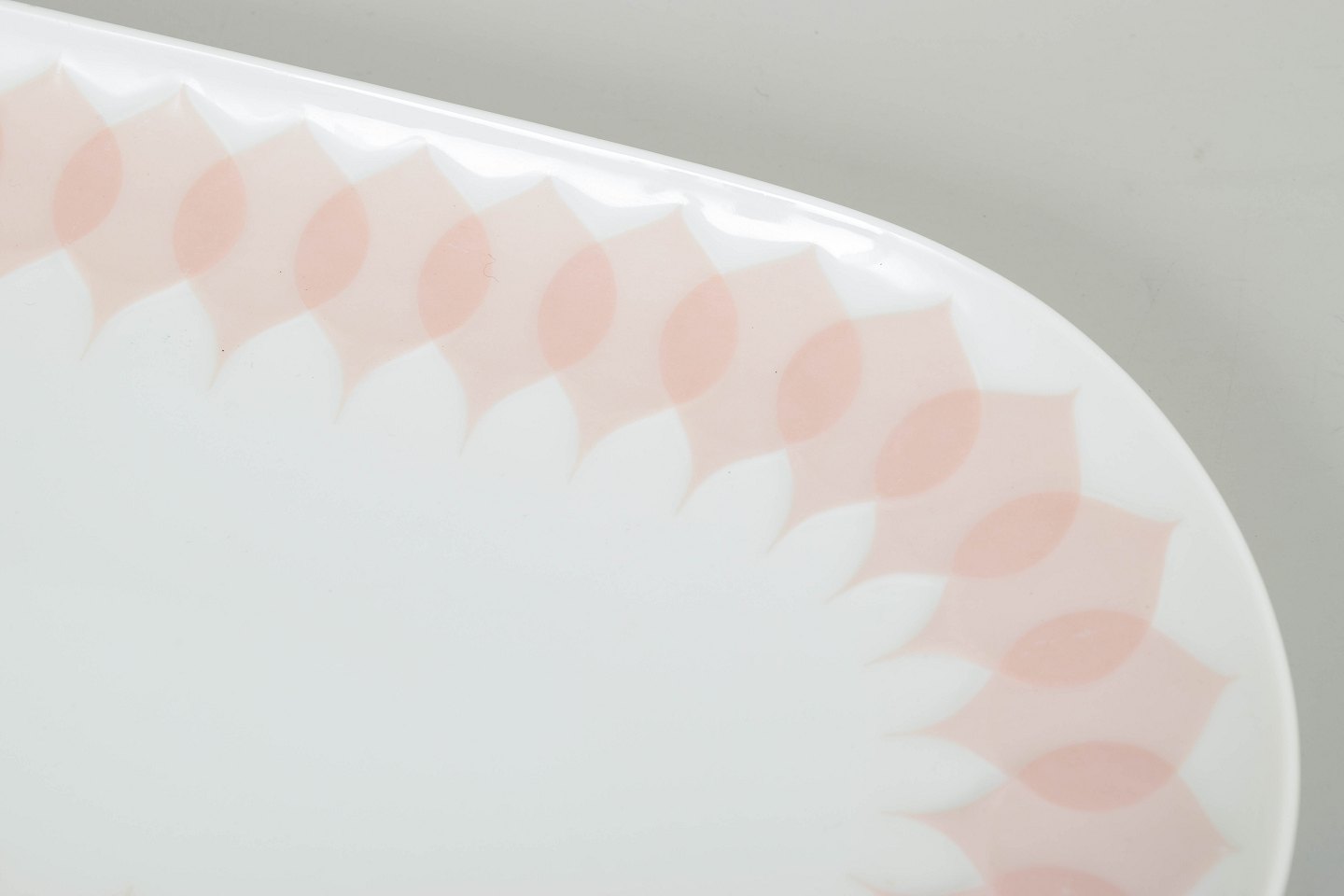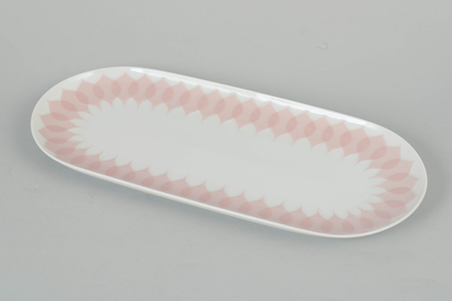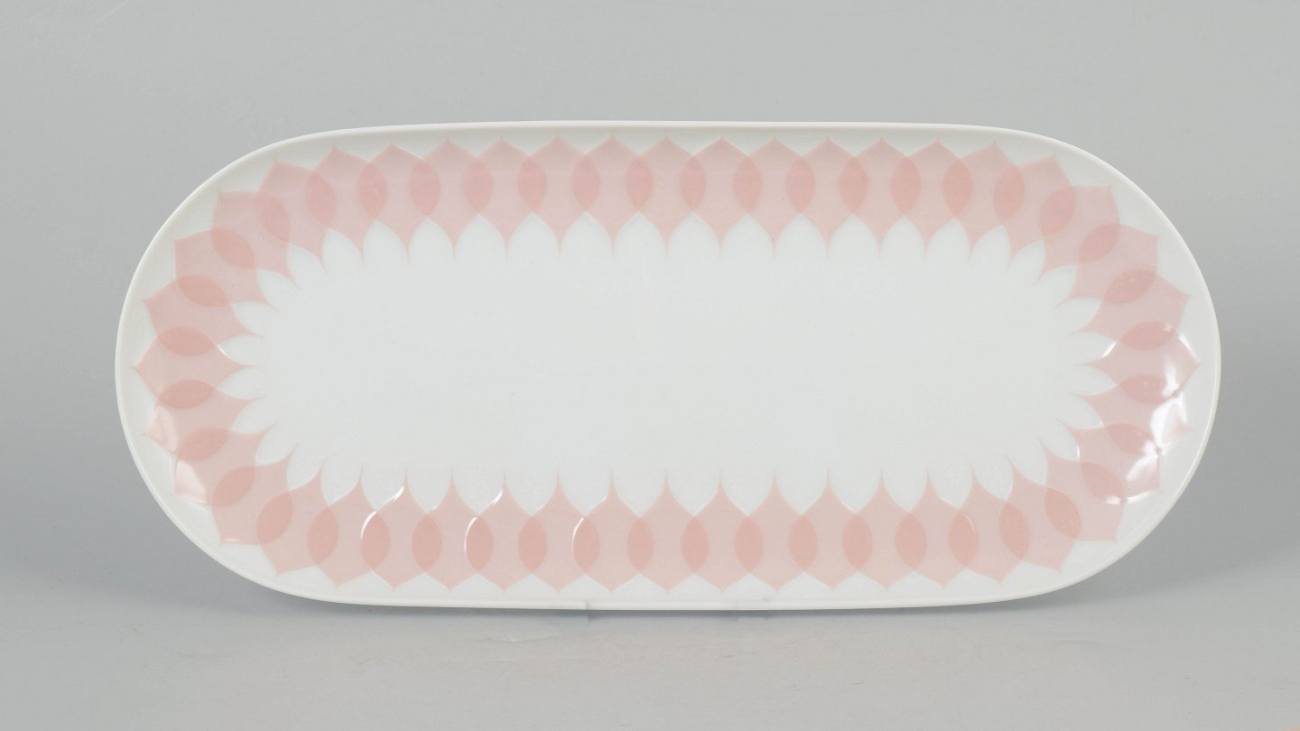 Bjørn Wiinblad for Rosenthal, oval fad.Dekorativt ovalt porcelænsfad med karakteristisk rosa “Lotus” dekoration langs kanten, udført i et gentaget bladmotiv med bløde overgange og grafisk rytme.